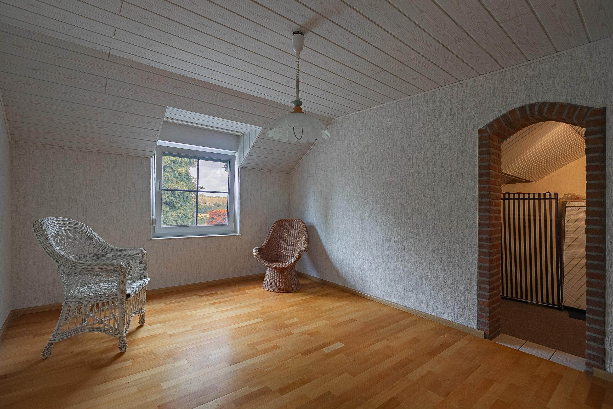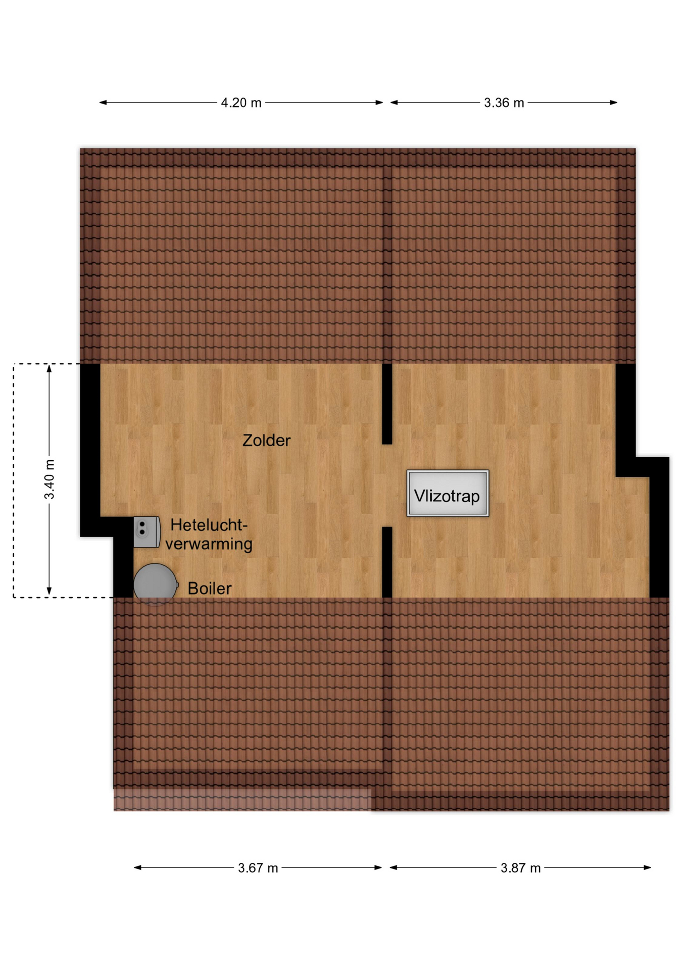Via een vlizotrap bereikbare zolder met opstelling heteluchtverwarming. Mogelijkheid voor het realiseren van een vaste trap en van een of twee zolderkamers. De nokhoogte is 2.70meter.