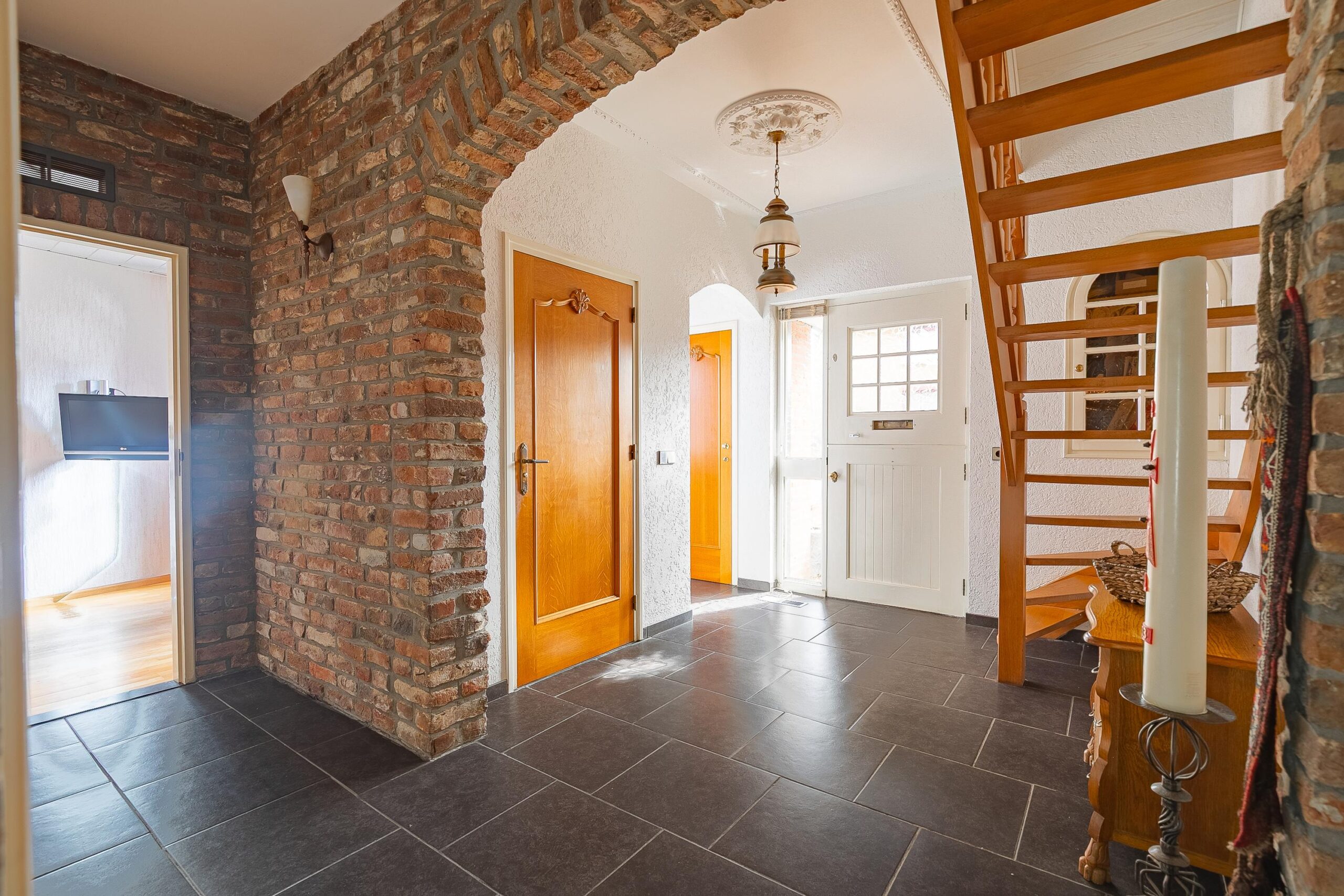 Overdekte entree. Hal met meterkast (in vernieuwde groepenkast met 17 groepen en 4 aardlekschakelaars) muurkast, garderobe en toilet met wandcloset en wastafeltje. De hal geeft tevens toegang tot de werkkamer (ca. 10m²) aan de voorkant van de woning. Doorzonwoonkamer (ca. 35m²) met parketvloer, houtkachel en schuifpui naar de achtertuin. Ruime keuken (ca. 15.5m²) met aanrechtcombinatie voorzie van de volgende apparatuur: inductiekookplaat, vaatwasser, koelkast, spoelbak, afzuigkap en granieten blad. Bijkeuken/wasruimte (ca. 6.5m²) met witgoedaansluitingen.