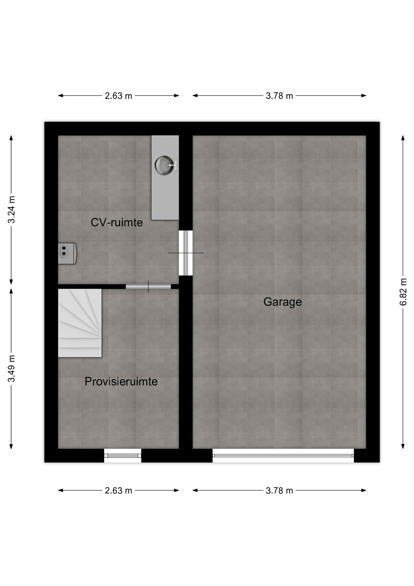 Inpandige bereikbaar souterrain met een stahoogte van 2.05 meter. Hier is een provisiekelder, de garage (ca. 35.8m²) en de cv-ruimte (ca. 8.5m²) met opstelling CV-Combiketel (merk Radson, bouwjaar 1998, eigendom) en een geiser.