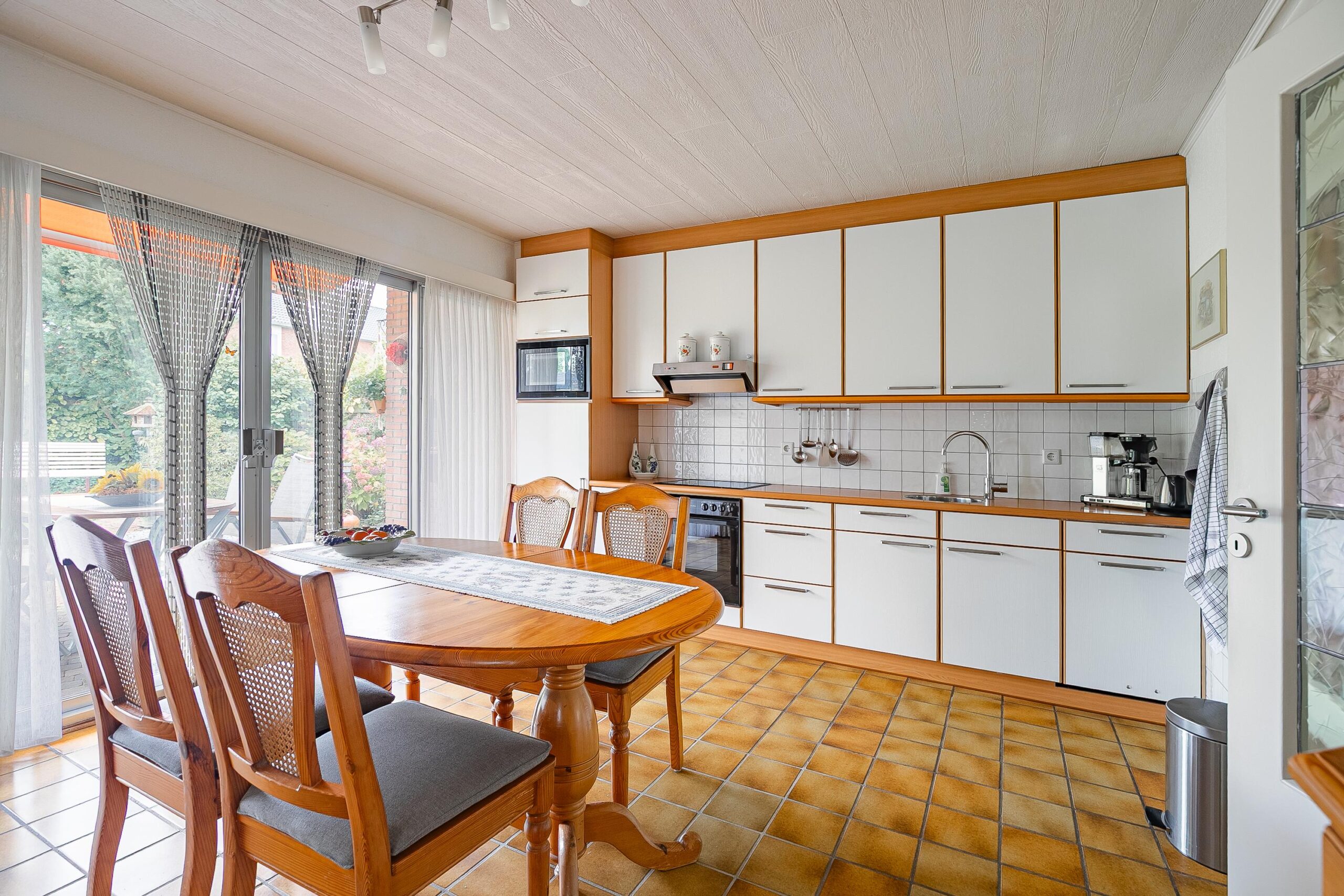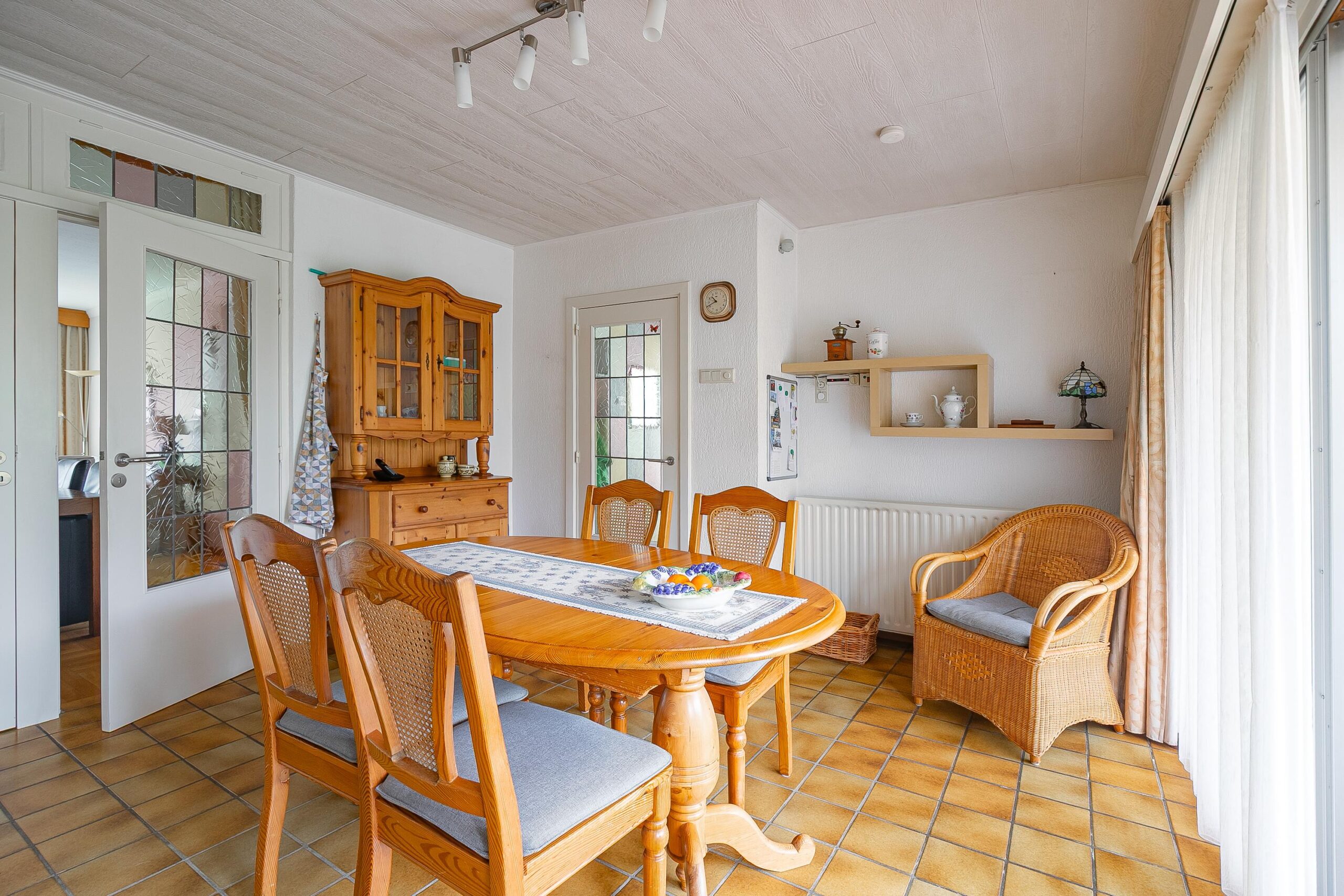 Hal met meterkast (groepenkast met 8 groepen en 1 aardlekschakelaar) en toilet met wandcloset en fonteintje. L-vormige woonkamer (ca. 35.3m²) met parketvloer en gashaard. In de aanbouw gerealiseerde keuken (ca. 16.7m²) met aanrechtcombinatie voorzien van de volgende apparatuur: keramische kookplaat, oven, magnetron, koelkast, vaatwasser, spoelbak en afzuigkap. Tevens is in de keuken een schuifpui naar een overdekt terras (ca. 7m²) en de achtertuin. Via het tussenportaal (met muurkast) bereikbare wasruimte (ca. 5.6m²) met witgoedaansluitingen. Geheel omsloten, op het oosten georiënteerde tuin. Het perceel is tevens bereikbaar via een buurpad op tuinniveau dat achter de woningen loopt.