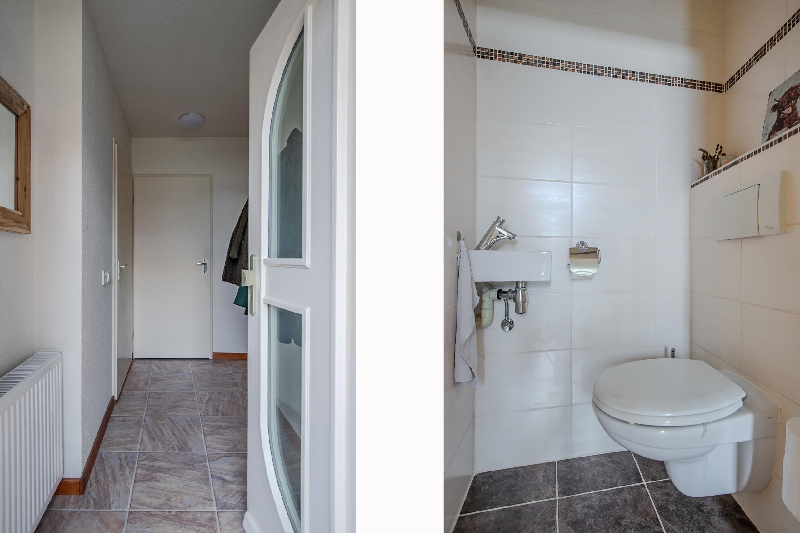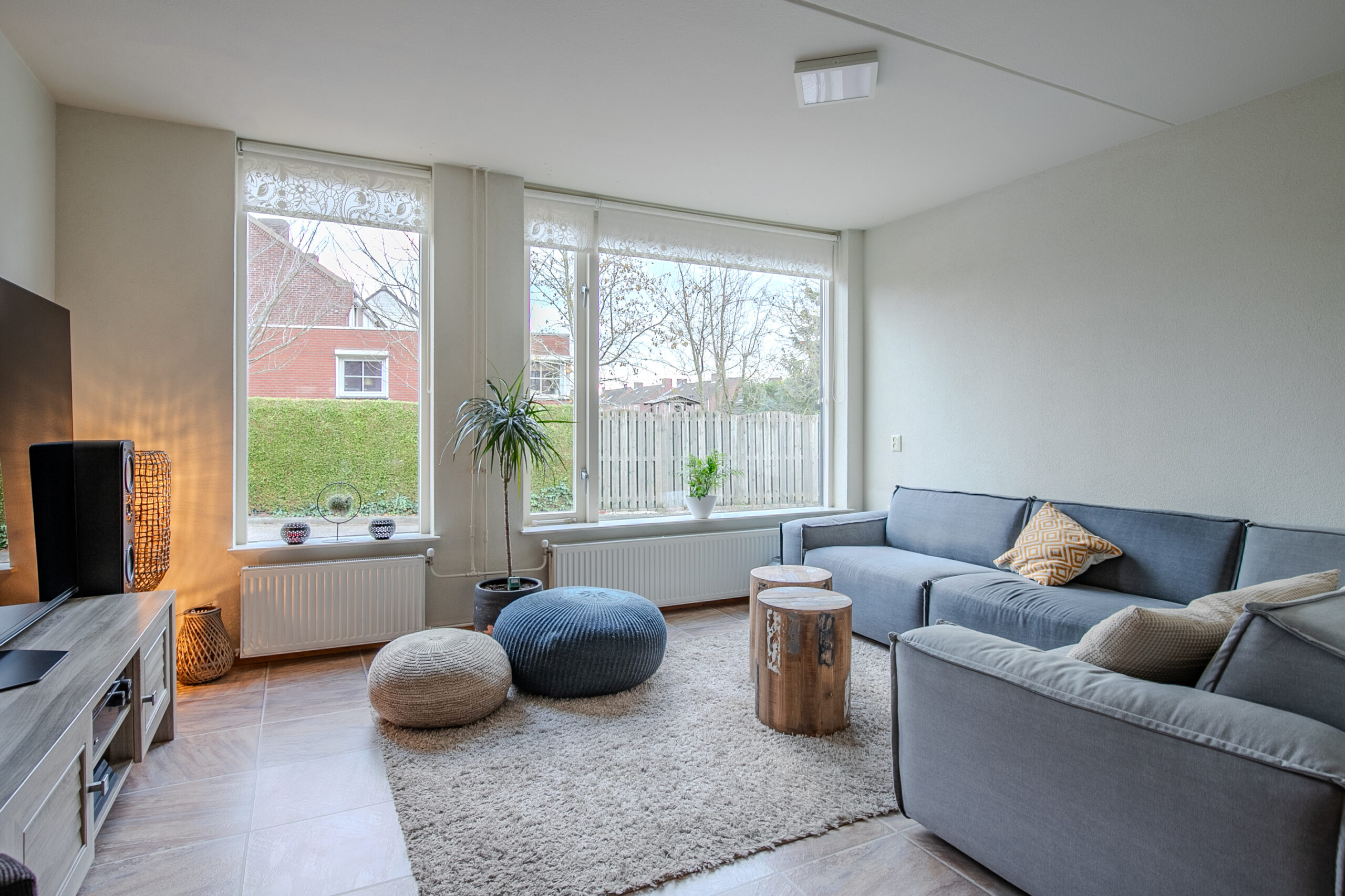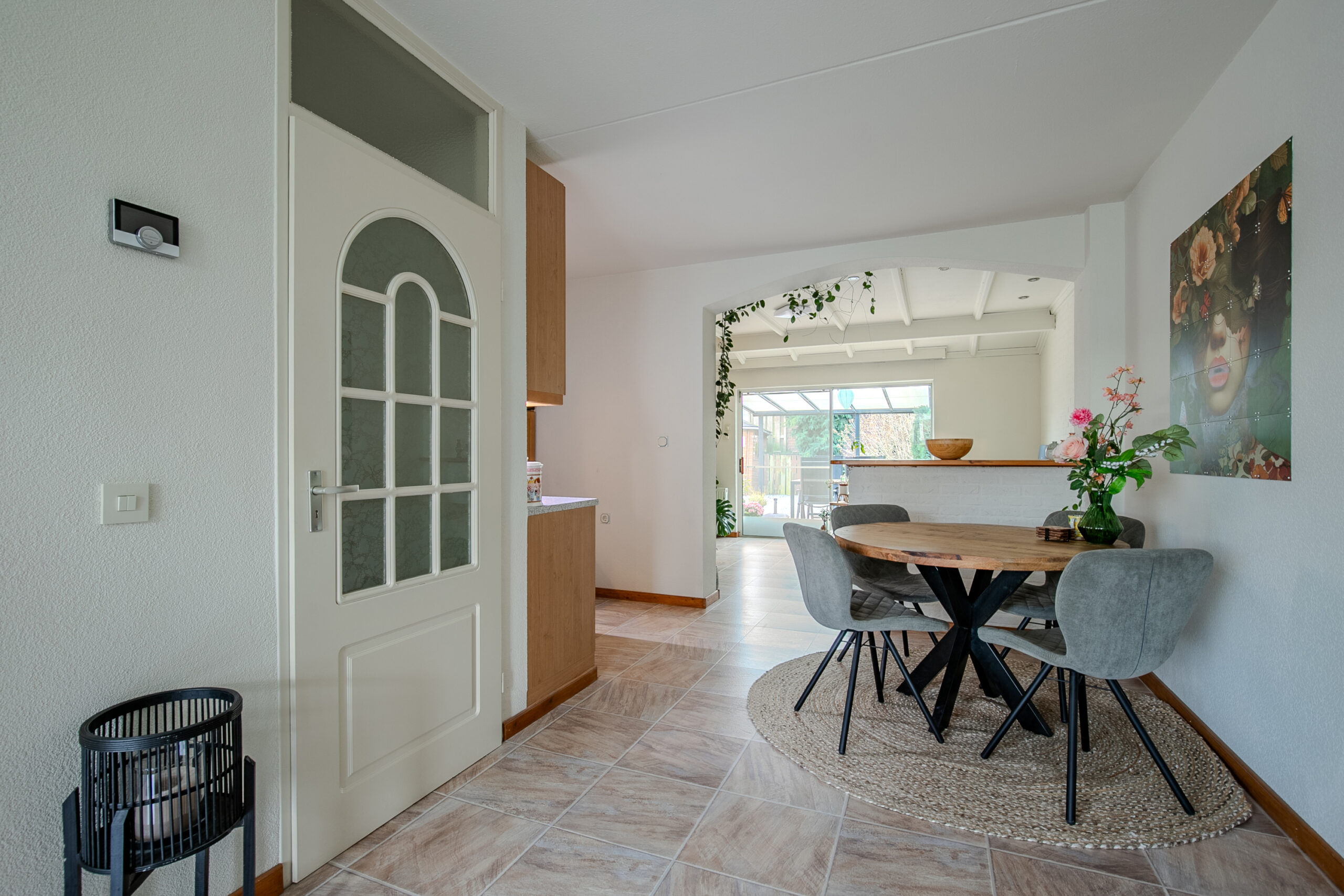 Entree/hal voorzien van een laminaatvloer met trapopgang, meterkast en toegang tot de woonkamer, garage en toilet. Betegelde toiletruimte met zwevend closet en fonteintje. Ruime L-vormige woonkamer (circa 27 m2) welke is voorzien van eenzelfde laminaatvloer. Door de grote ramen is er prettig lichtinval. Verder is er een praktische trapkast aanwezig. Aan de achterzijde is de keuken gelegen, deze is half open en geplaatst in een hoekopstelling met de volgende installaties: combi-magnetron, koelkast, vaatwasser, spoelbak, afzuiging, 4-pits gaskookplaat en diverse opbergkasten en lades. Achter de keuken is een aanbouw gerealiseerd (circa 16 m2) waardoor er een fijne extra leefruimte aanwezig is, ideaal als bijvoorbeeld eetkamer. Door de aanwezigheid van een schuifpui is er prettig tuincontact en tevens lichtinval. De totale woonoppervlakte van de woonkamer, keuken en aanbouw bedraagt circa 48 m2. De garage (circa 20 m2) is inpandig bereikbaar en voorzien van een tegelvloer, elektrische sectionaalpoort, verwarming en middels een vlizotrap is er toegang tot een bergzolder (circa 9 m2). Ook is er een aparte berging (9 m2) aanwezig met aansluitpunten voor het witgoed en toegang tot de achtertuin.