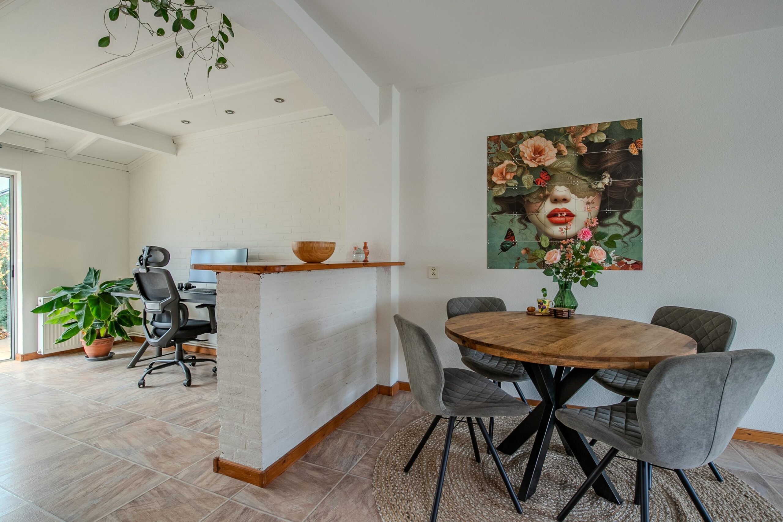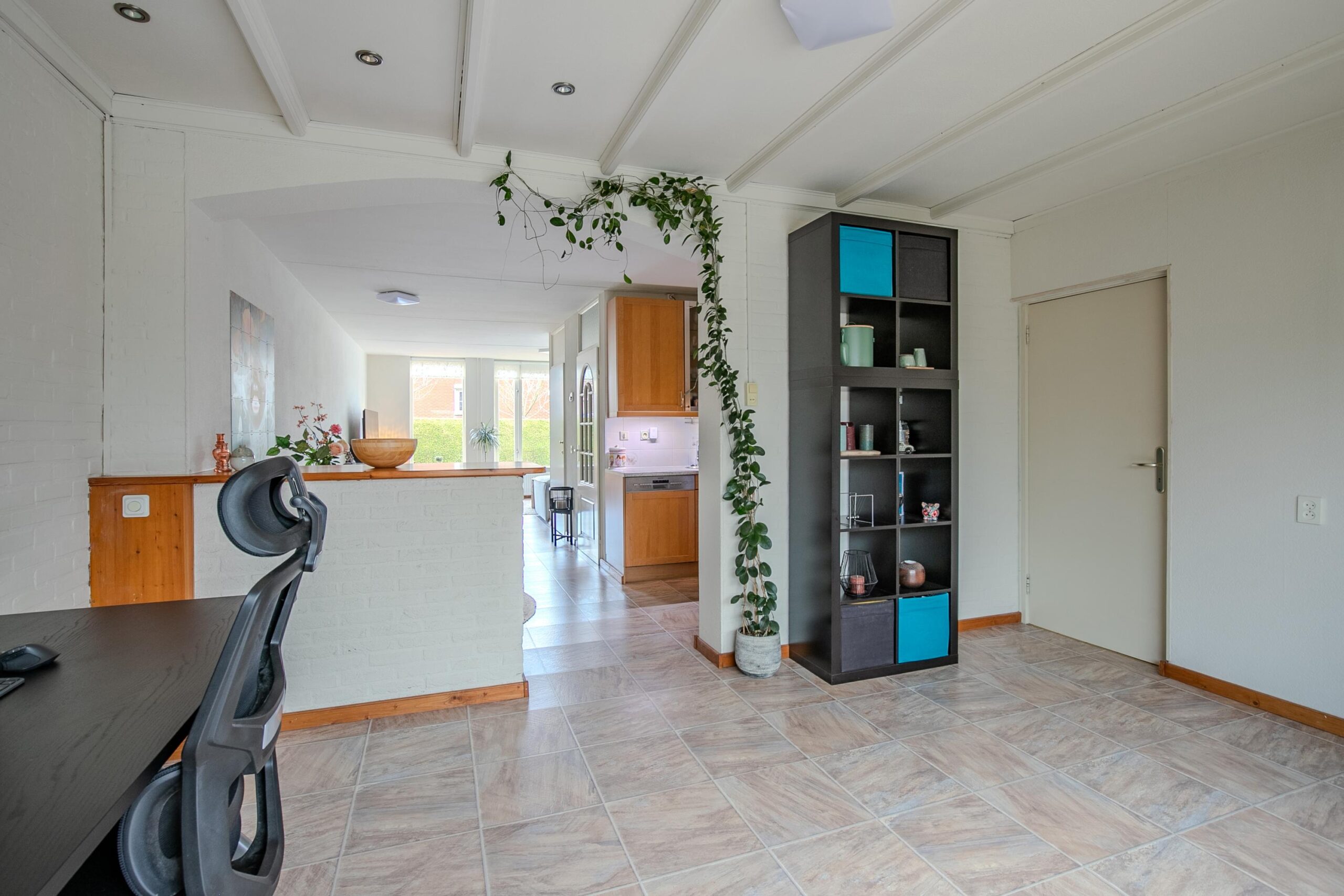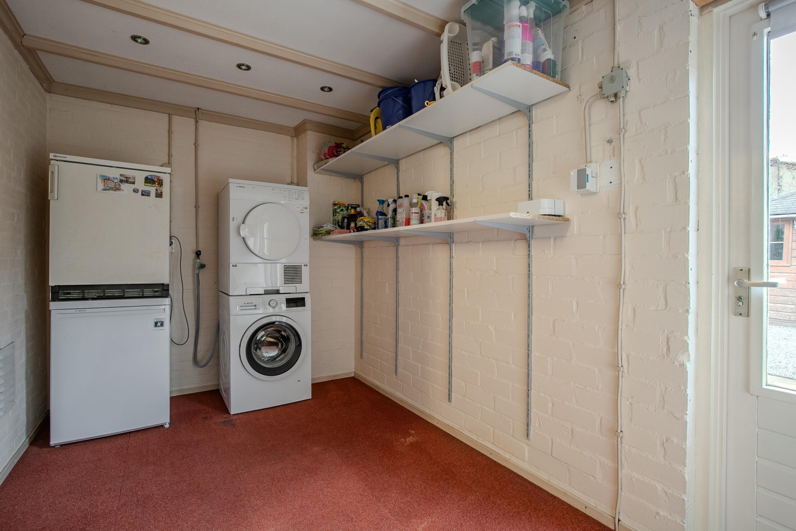 Entree/hal voorzien van een laminaatvloer met trapopgang, meterkast en toegang tot de woonkamer, garage en toilet. Betegelde toiletruimte met zwevend closet en fonteintje. Ruime L-vormige woonkamer (circa 27 m2) welke is voorzien van eenzelfde laminaatvloer. Door de grote ramen is er prettig lichtinval. Verder is er een praktische trapkast aanwezig. Aan de achterzijde is de keuken gelegen, deze is half open en geplaatst in een hoekopstelling met de volgende installaties: combi-magnetron, koelkast, vaatwasser, spoelbak, afzuiging, 4-pits gaskookplaat en diverse opbergkasten en lades. Achter de keuken is een aanbouw gerealiseerd (circa 16 m2) waardoor er een fijne extra leefruimte aanwezig is, ideaal als bijvoorbeeld eetkamer. Door de aanwezigheid van een schuifpui is er prettig tuincontact en tevens lichtinval. De totale woonoppervlakte van de woonkamer, keuken en aanbouw bedraagt circa 48 m2. De garage (circa 20 m2) is inpandig bereikbaar en voorzien van een tegelvloer, elektrische sectionaalpoort, verwarming en middels een vlizotrap is er toegang tot een bergzolder (circa 9 m2). Ook is er een aparte berging (9 m2) aanwezig met aansluitpunten voor het witgoed en toegang tot de achtertuin.