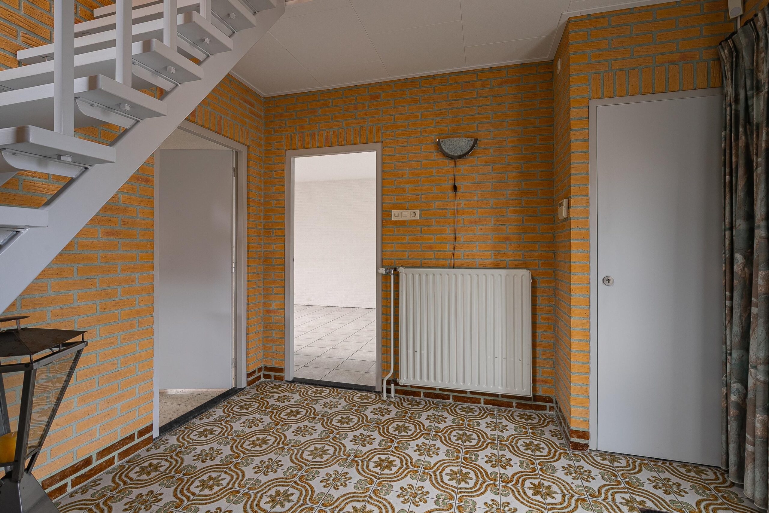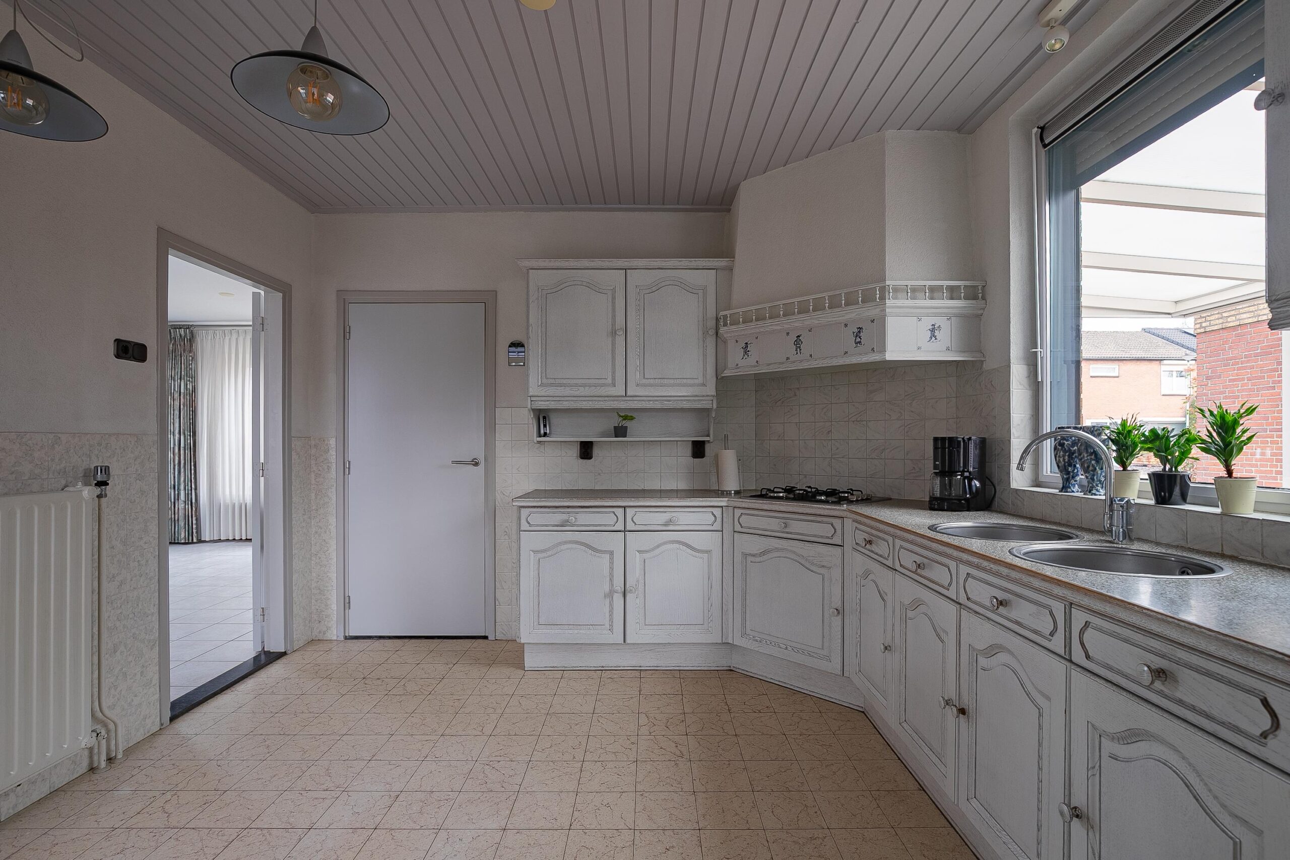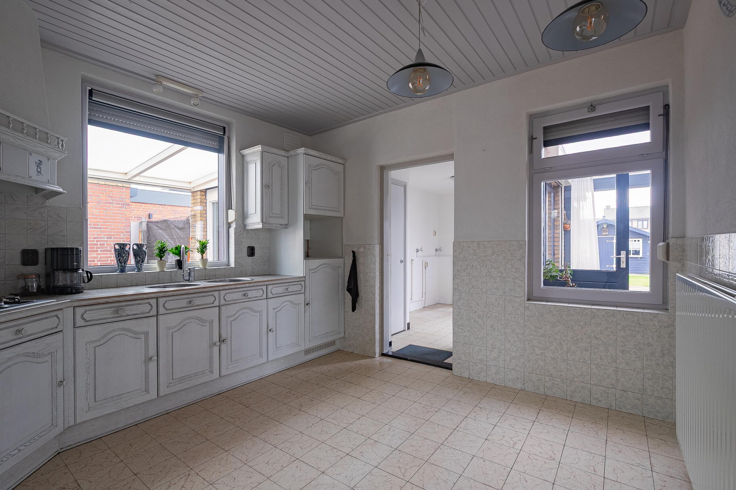 Entree/hal voorzien van een tegelvloer met trapopgang, meterkast (groepenkast) en toegang tot de keuken, woonkamer en toiletruimte. Modern afgewerkte en volledig betegelde toiletruimte met zwevend closet en fonteintje. Ruime doorzonwoonkamer (circa 27 m2), voorzien van een tegelvloer en fijn prettig lichtinval door de aanwezigheid van grote raampartijen. De gesloten keuken (circa 12 m2) is voorzien van een hoekopstelling met de navolgende installaties: 4-pits gaskookplaat, afzuiging, dubbele spoelbak, koelkast en diverse opbergkastjes en lades. Praktische bijkeuken (circa 7 m2) met aansluitpunten voor het witgoed, handige muurkast en toegang tot de serre achter de woning. Vanuit de bijkeuken is de voormalige garage toegankelijk. Doordat de garagepoort is vervangen door raam met loopdeur en door de aanwezigheid van water, elektra en verwarming, biedt deze ruimte verschillende mogelijkheden voor andere invullingen. Denk bijvoorbeeld aan thuiswerkplek, speelkamer voor de kinderen, hobbyruimte, praktijk aan huis enzovoort! De ruimte is circa 23 m2.