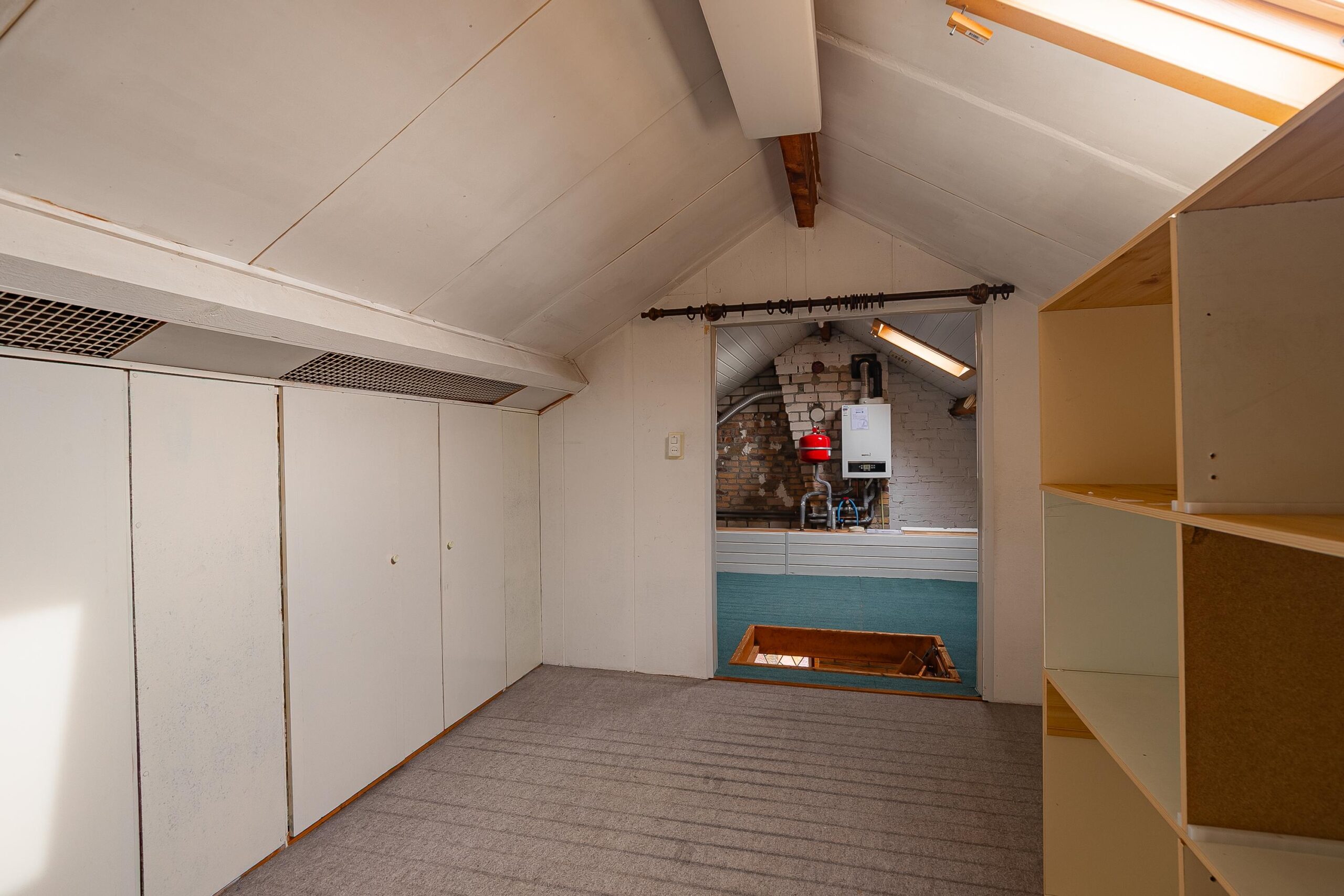 Via een vlizotrap bereikbare bergzolder. Deze is ruim en ideaal te gebruiken als opbergzolder. Er zijn twee Velux dakraampjes aanwezig, knieschotten en opstelling cv-ketel (Nefit, 2018, eigendom).
