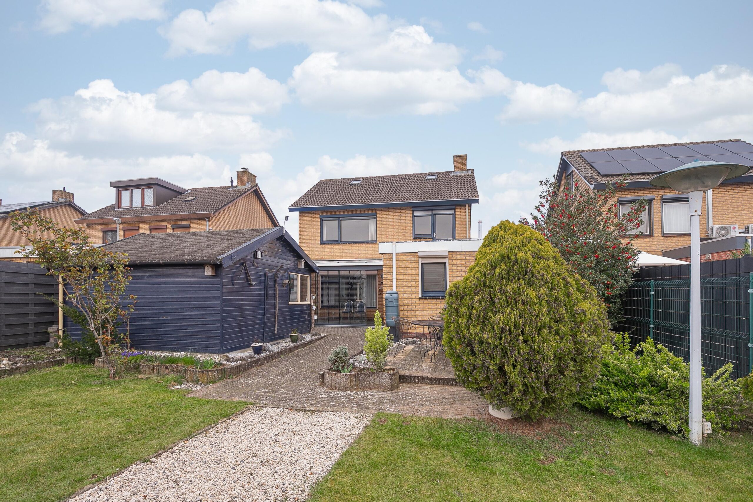 De woning is gelegen op een ruim perceel van 525 m2, voorzien van een fijne, onderhoudsvrije voortuin met ruime oprit en carport. Er is aan de rechterzijde een poortje met vrije achterom. De achtertuin is diep met verschillende, verrassend hoekjes en gelegen op het Zuiden. Er zijn twee praktische tuinhuizen aanwezig, ideaal voor de opberging van tuingereedschap en opslag.