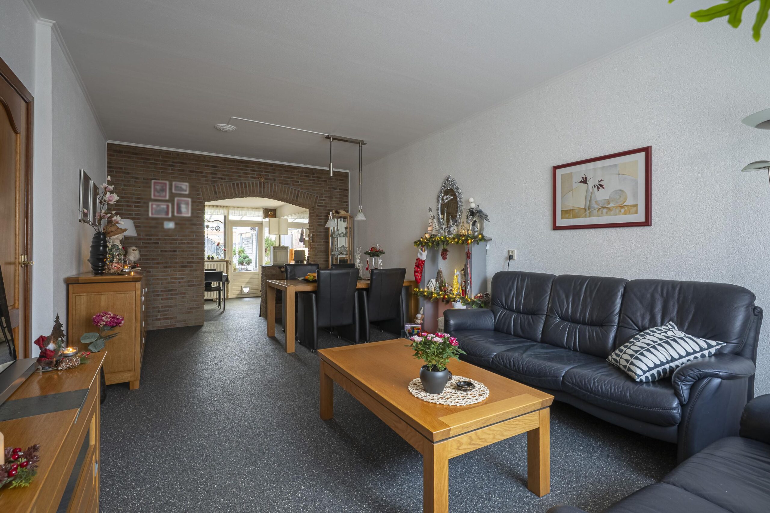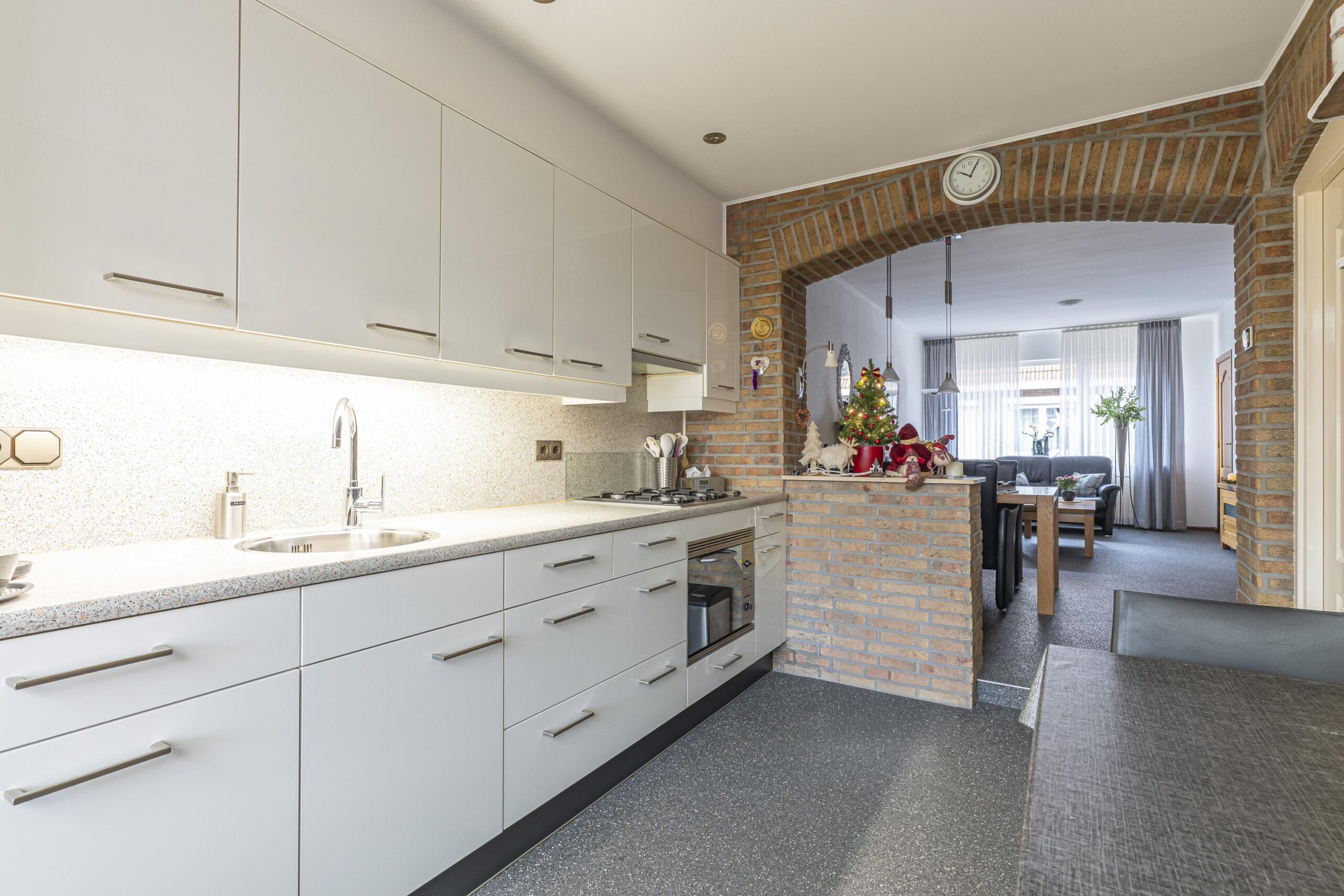 De sfeervolle woonkamer is afgewerkt met een antracieten, gesealde siergrindvloer en beschikt over wanden met sierpleisterwerk. Een karaktervolle boog, uitgevoerd in steenstrips, vormt een fraaie verbinding met de open keuken en zorgt voor een speels en warm geheel.