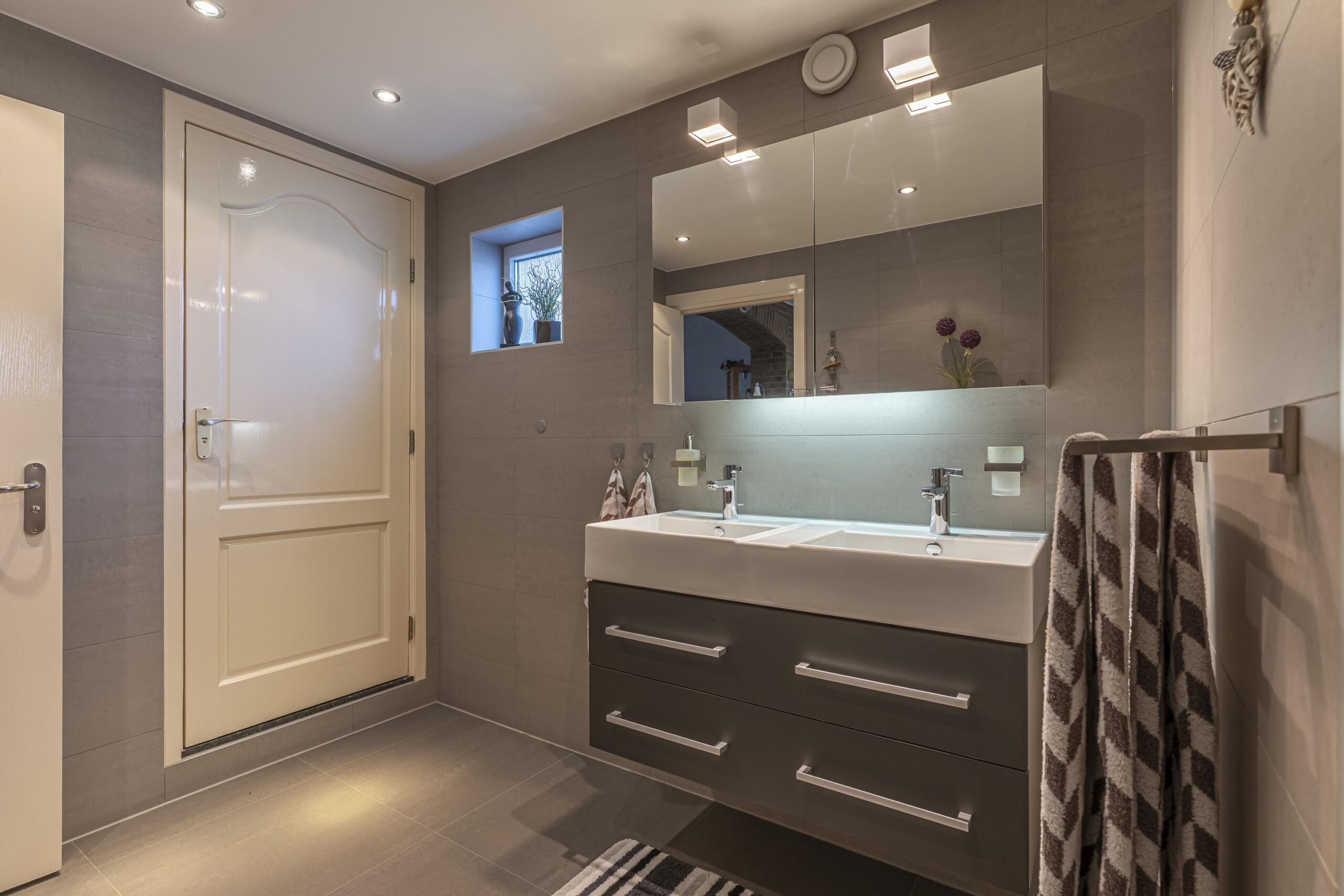 Direct naast de keuken bevindt zich de moderne, luxe badkamer 3.57 x 2.08, voorzien van een stijlvolle tegelafwerking, een royale inloopdouche, designradiator, vrijhangend toilet en een dubbele wastafel met bijpassend badmeubel en spiegelkast. Dankzij de vloerverwarming, mechanische ventilatie en het aanwezige raam is de badkamer zowel comfortabel als goed geventileerd. Aansluitend bevindt zich een separate wasruimte met aansluitingen voor witgoed en de opstelplaats van de cv-ketel (Nefit, bouwjaar 2014, eigendom).