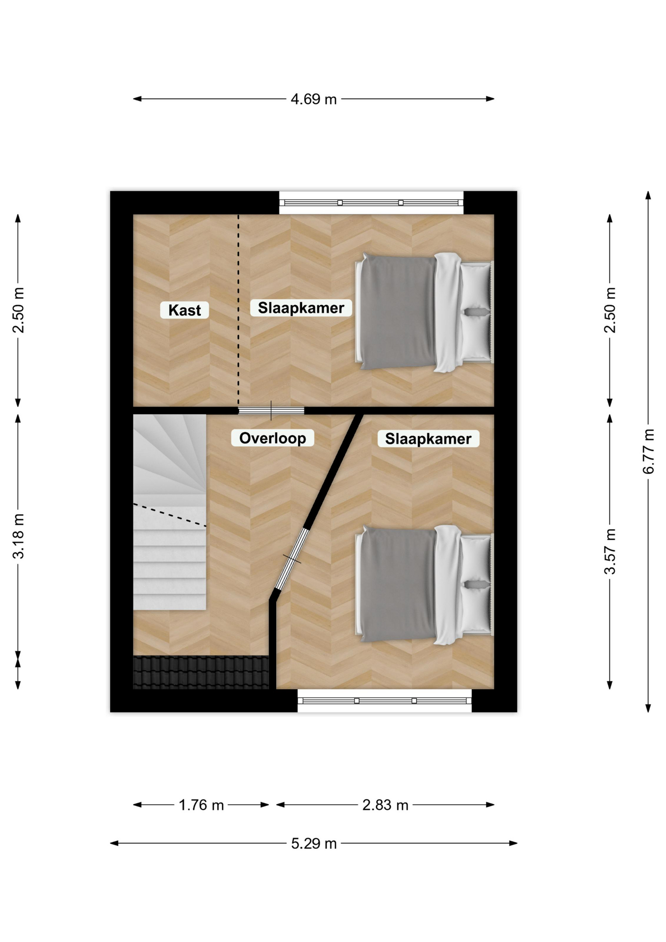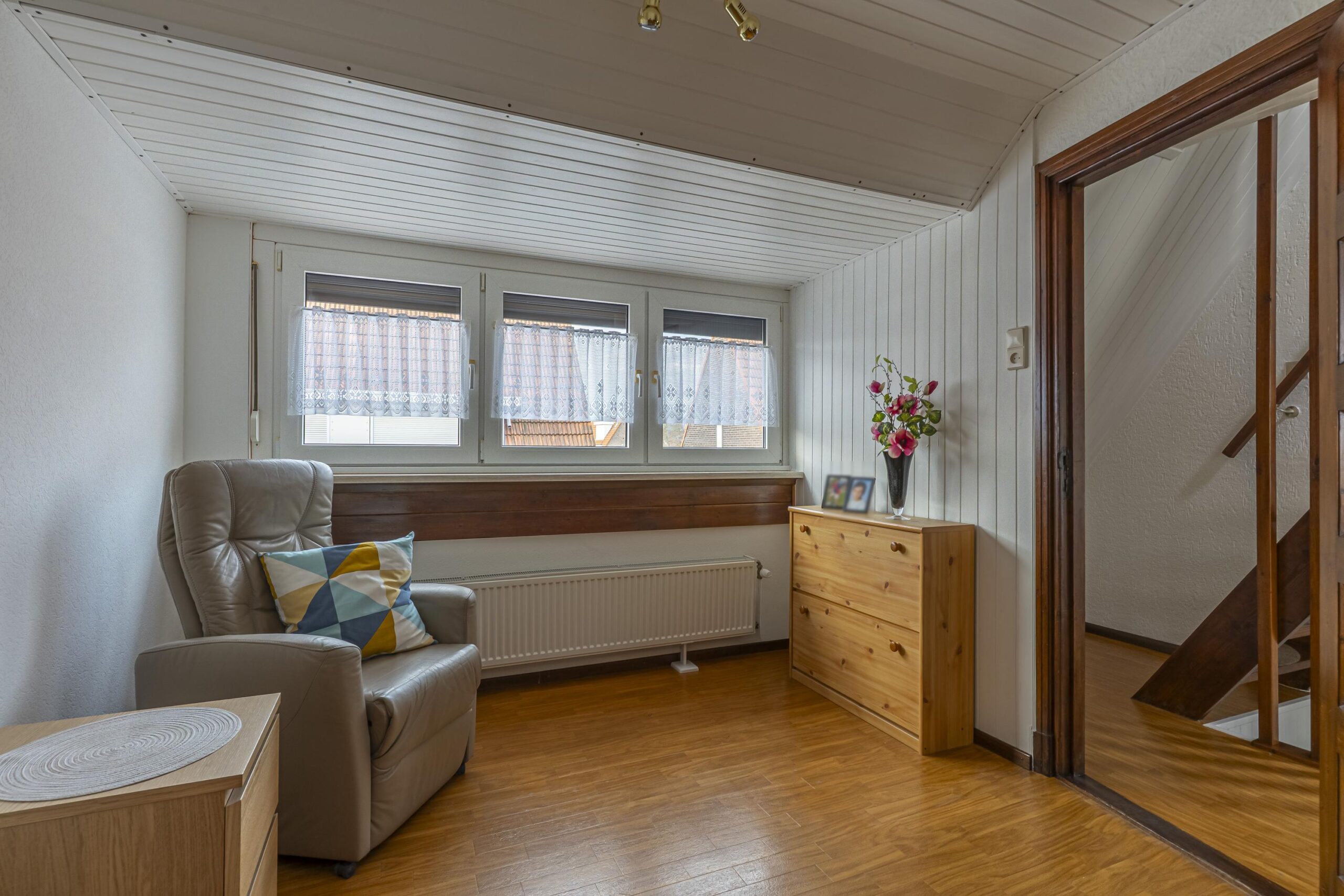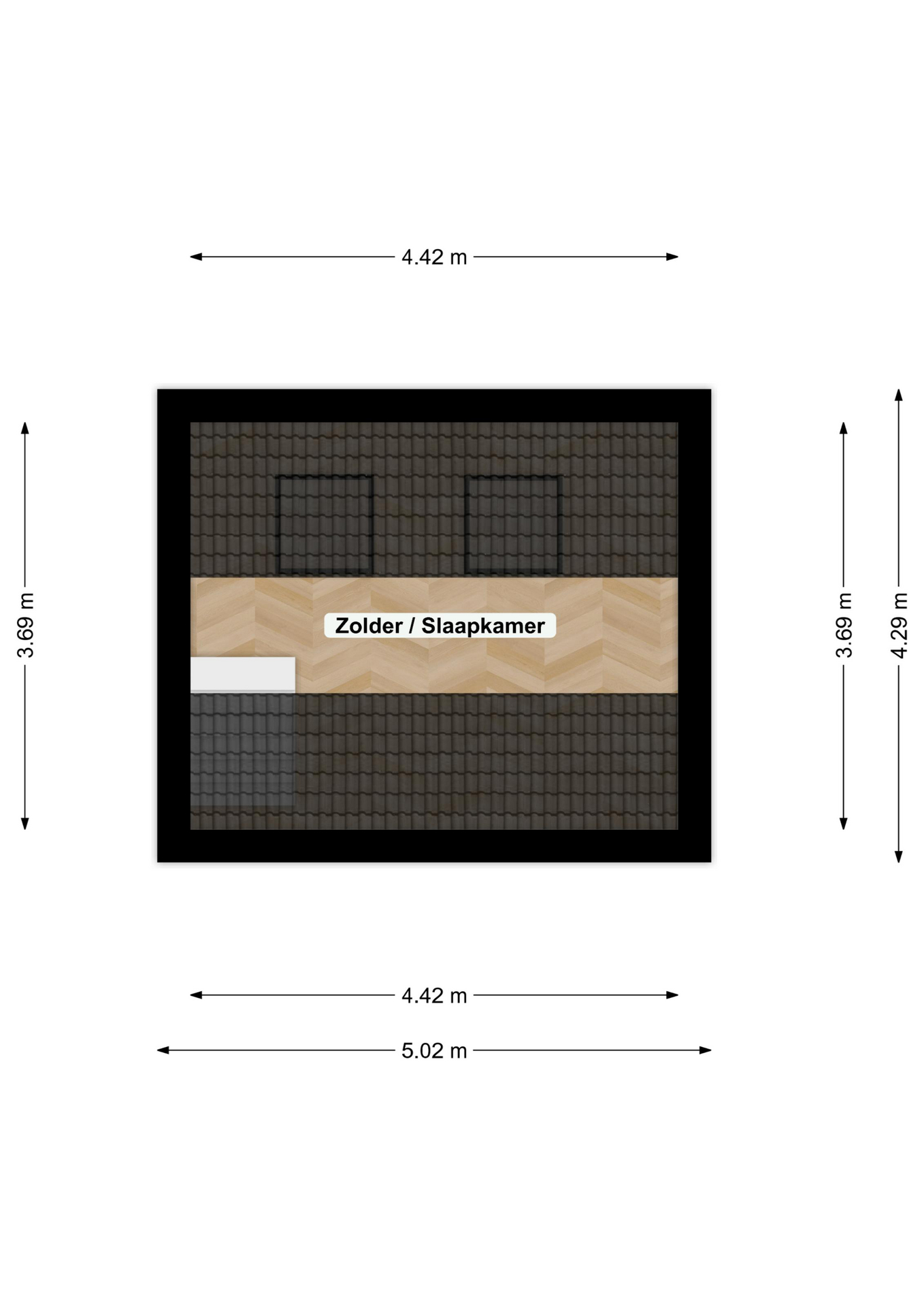 Via een vaste trap bereik je de tweede verdieping 4.42 x 1.05, waar zich een derde slaapkamer bevindt met 2 dakvensters.