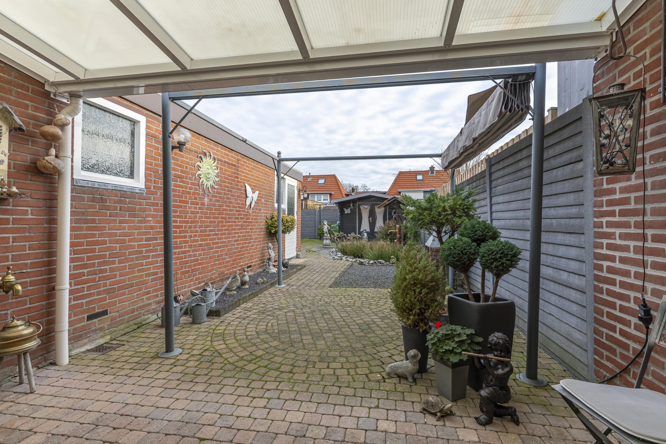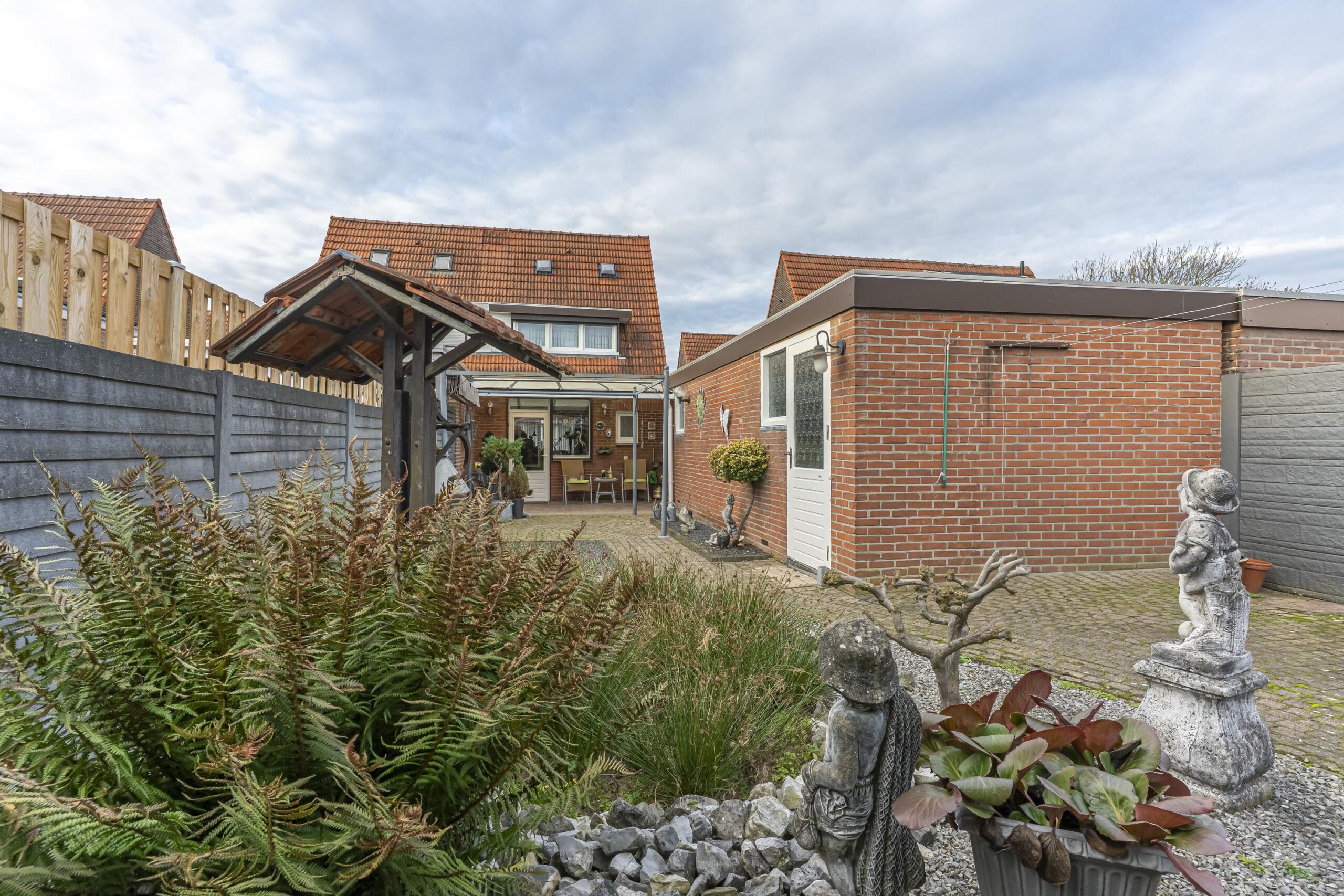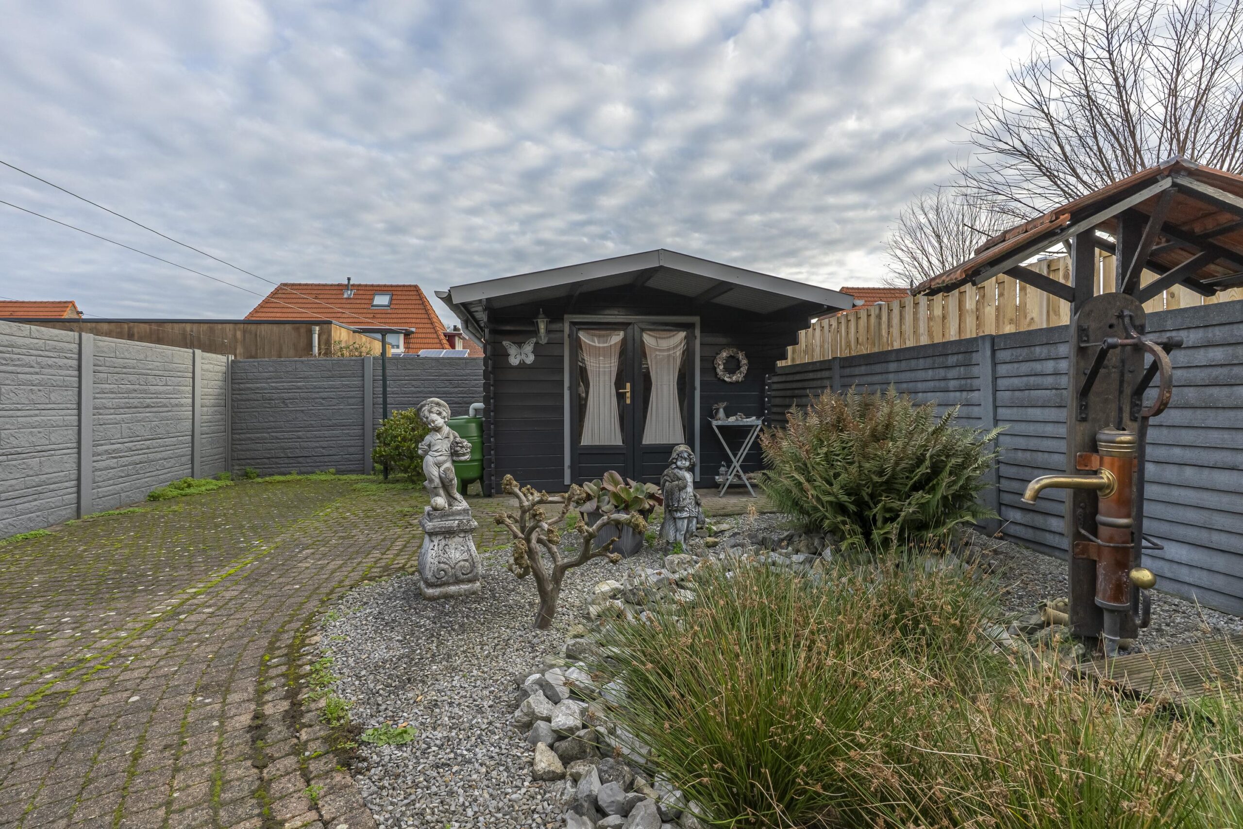 De tuin is verzorgd aangelegd en volledig omsloten, wat zorgt voor optimale privacy. Verder beschikt de tuin hier over een aluminium terrasoverkapping, een beklinkerd terras en een houten tuinhuis voor extra opslag. De erfafscheiding bestaat uit degelijke betonschuttingen.