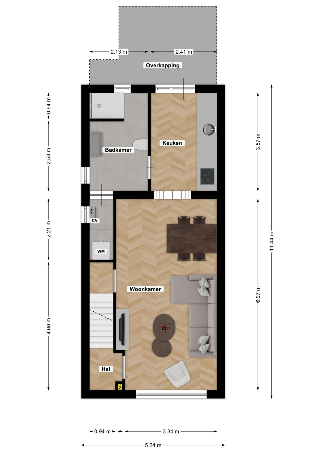 Via de oprit, geschikt voor het parkeren van minimaal twee auto’s, bereik je de overdekte entree van de woning. In de ontvangsthal bevinden zich de trap naar de eerste verdieping, de meterkast en een garderoberuimte.