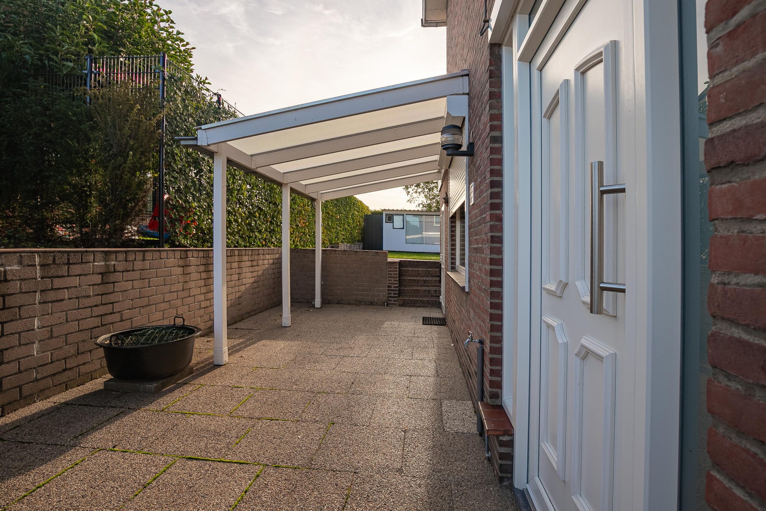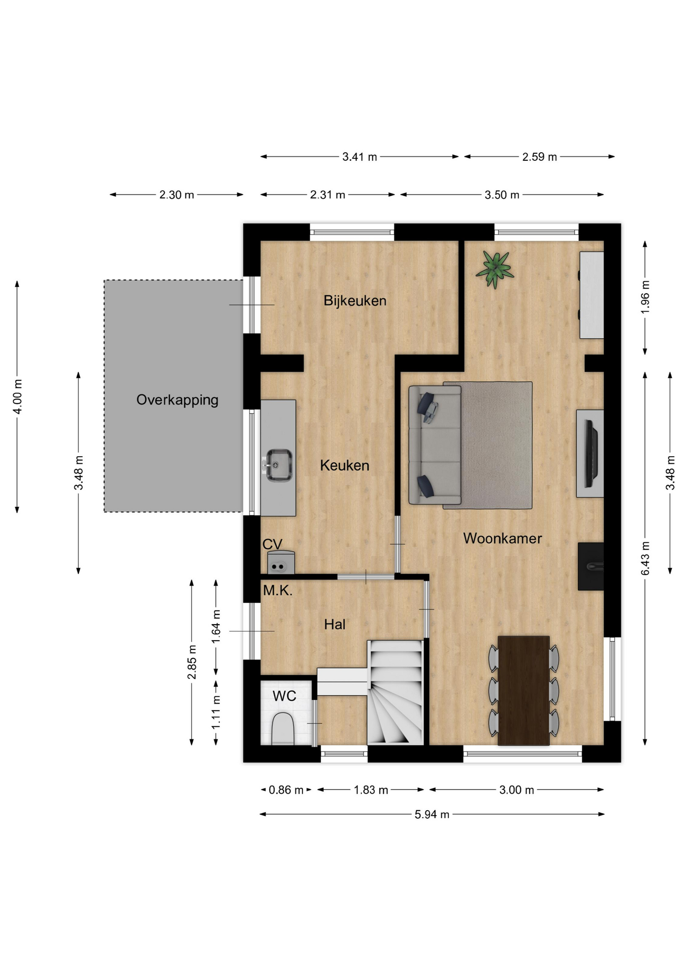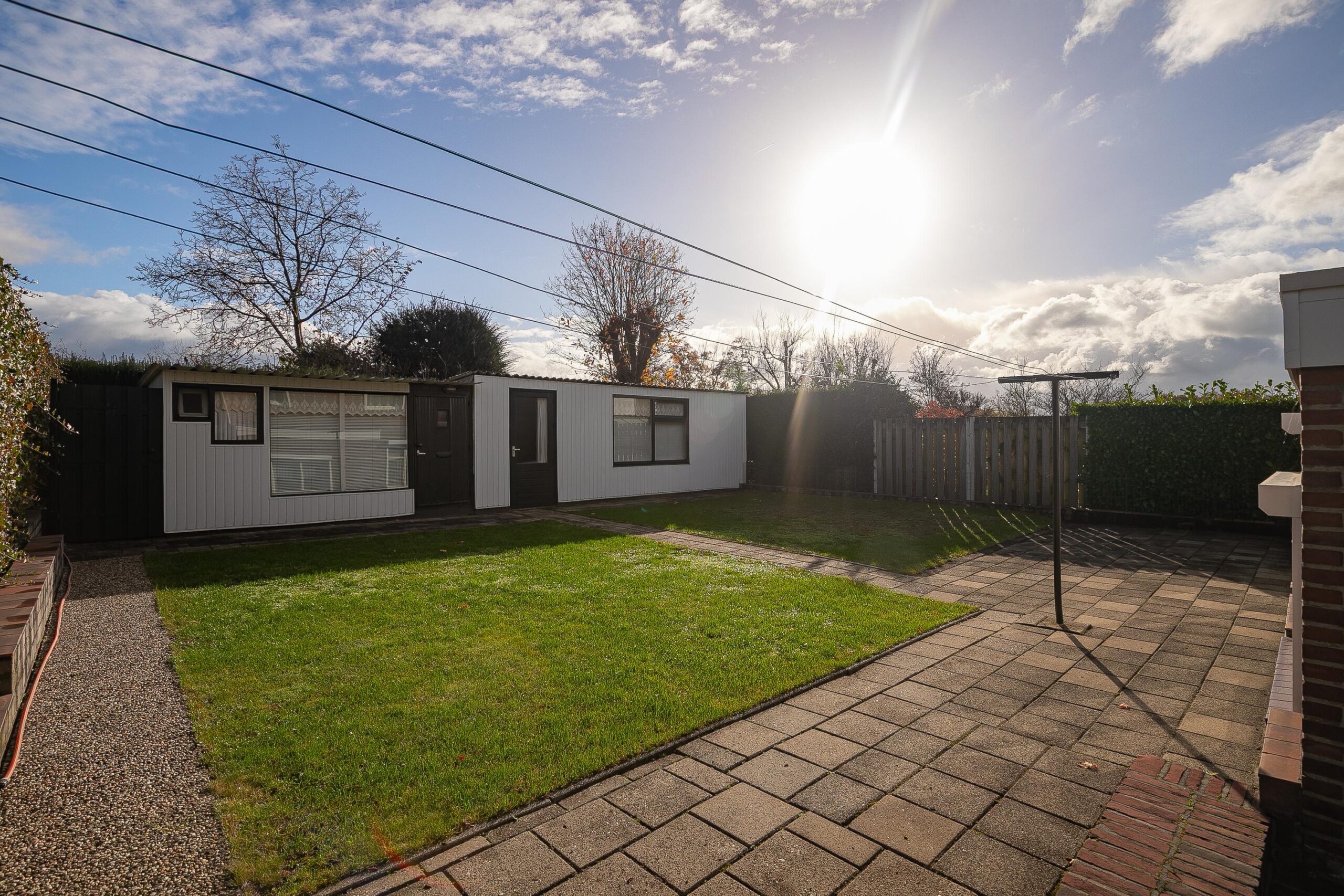 Hal met meterkast (vernieuwde groepenkast met 5 groepen en 2 aardlekschakelaars) en toilet. Woonkamer (ca. 26.5m²) met plankenvloer, schoorsteenmantel en houtkachel. Keuken (ca. 8m²) met eenvoudig aanrechtblok voorzien van een afzuigkap en een spoelbak. In de keuken is eveneens de cv-ketel (merk Remeha Tzerra, bouwjaar 2015, eigendom) geplaatst. Bijkeuken (ca. 6.7m²). Aan de zijkant van de woning is een overdekt terras (ca. 9.6m²). Op het zuidoosten georiënteerde en geheel omsloten achtertuin met twee bergingen (ca. 17.8m² en 8.7m²).