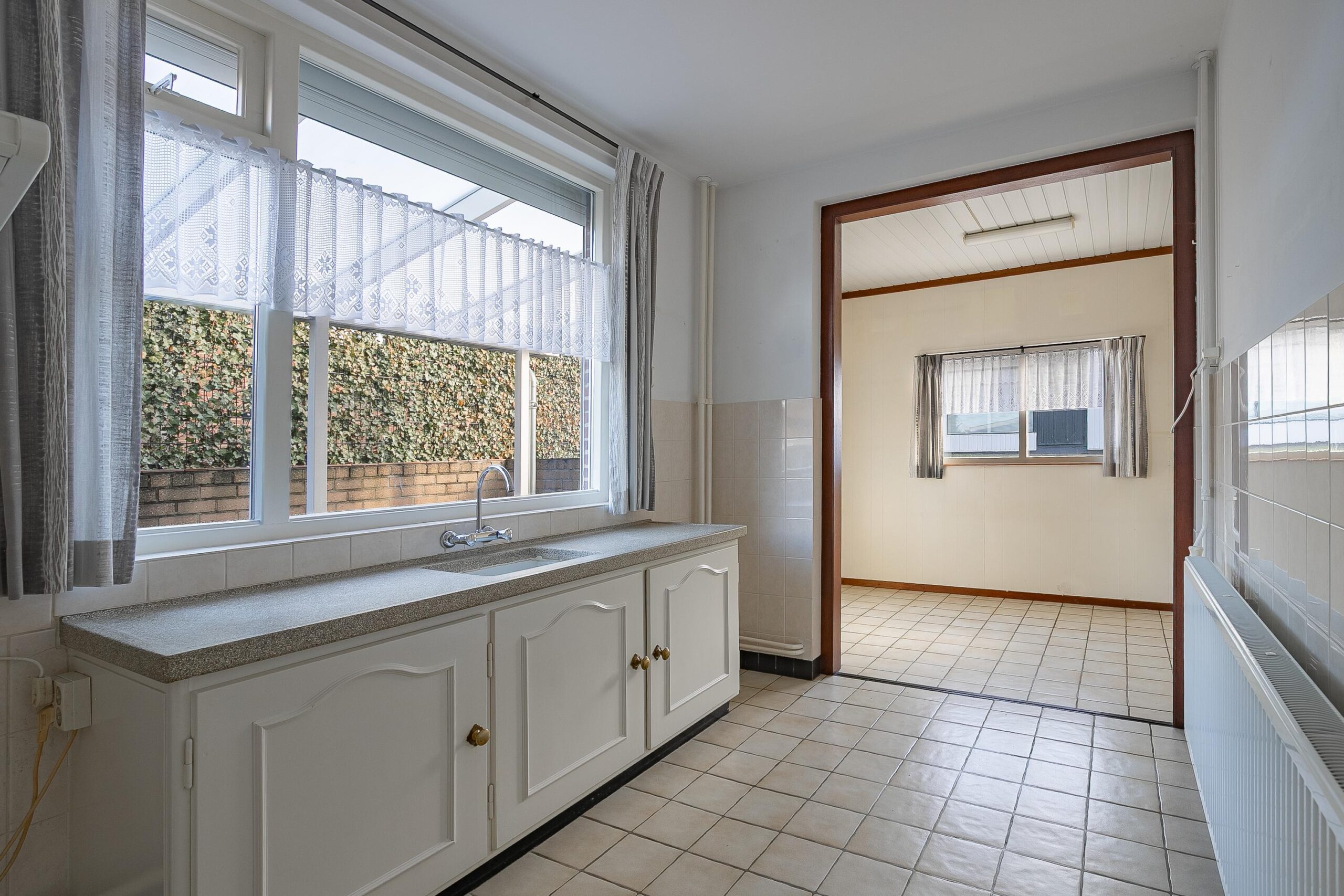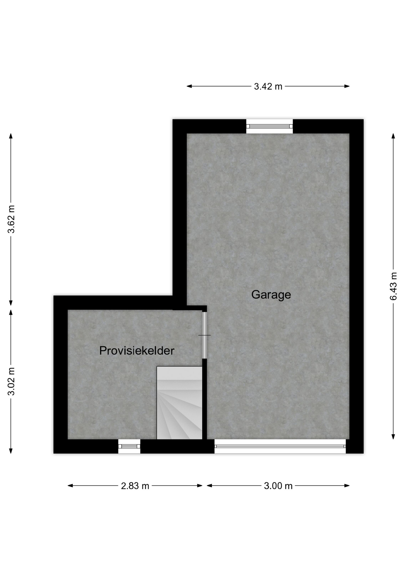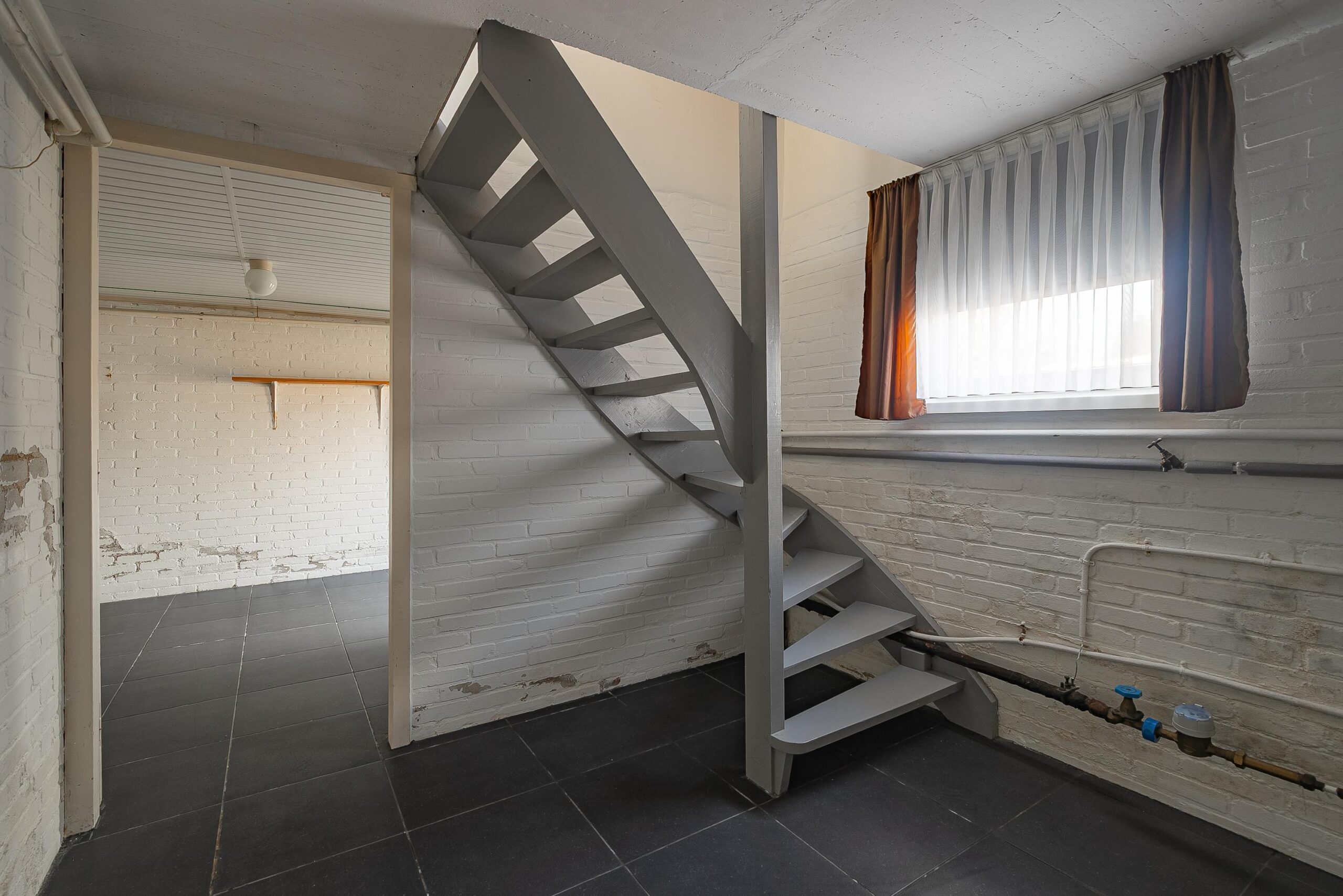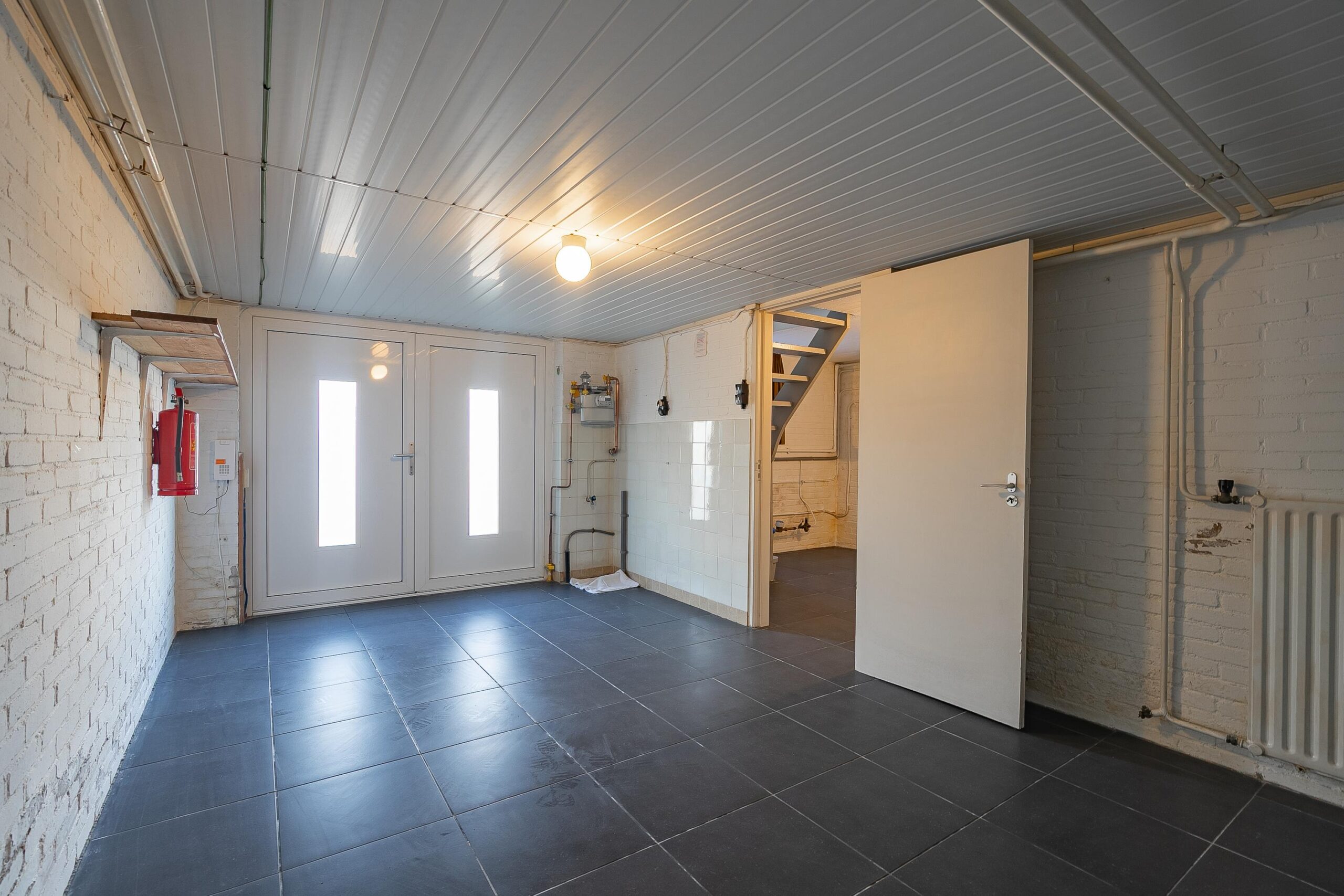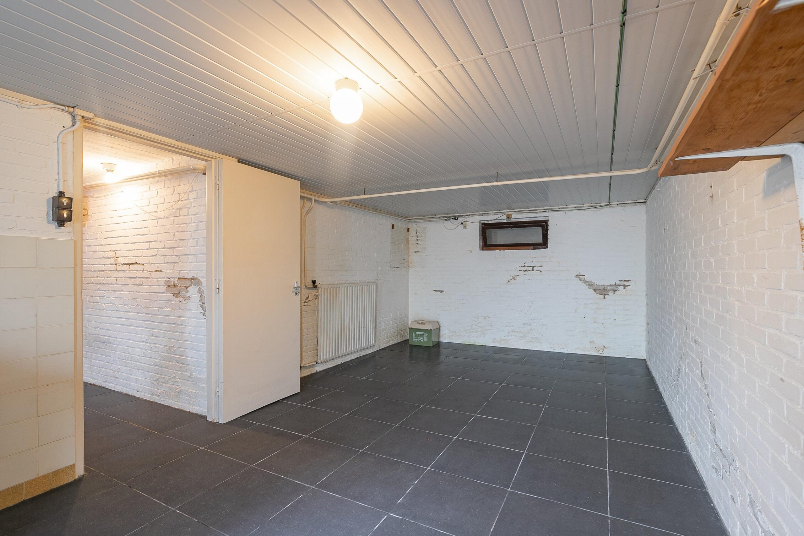 Verwarmde garage (ca. 20.8m²) met tegelvloer en openslaande garagedeuren (kunststof). Provisiekelder (ca. 7.7m²) met trapopgang naar de begane grond.
