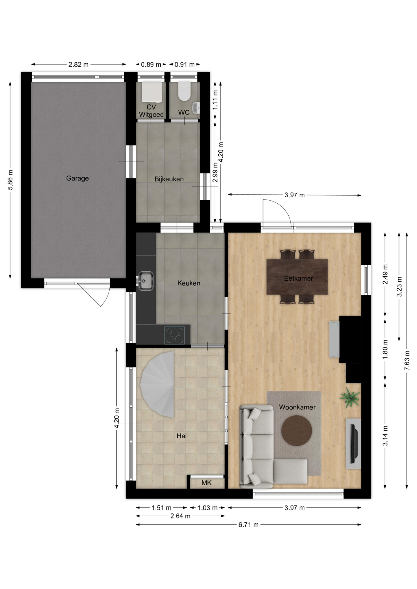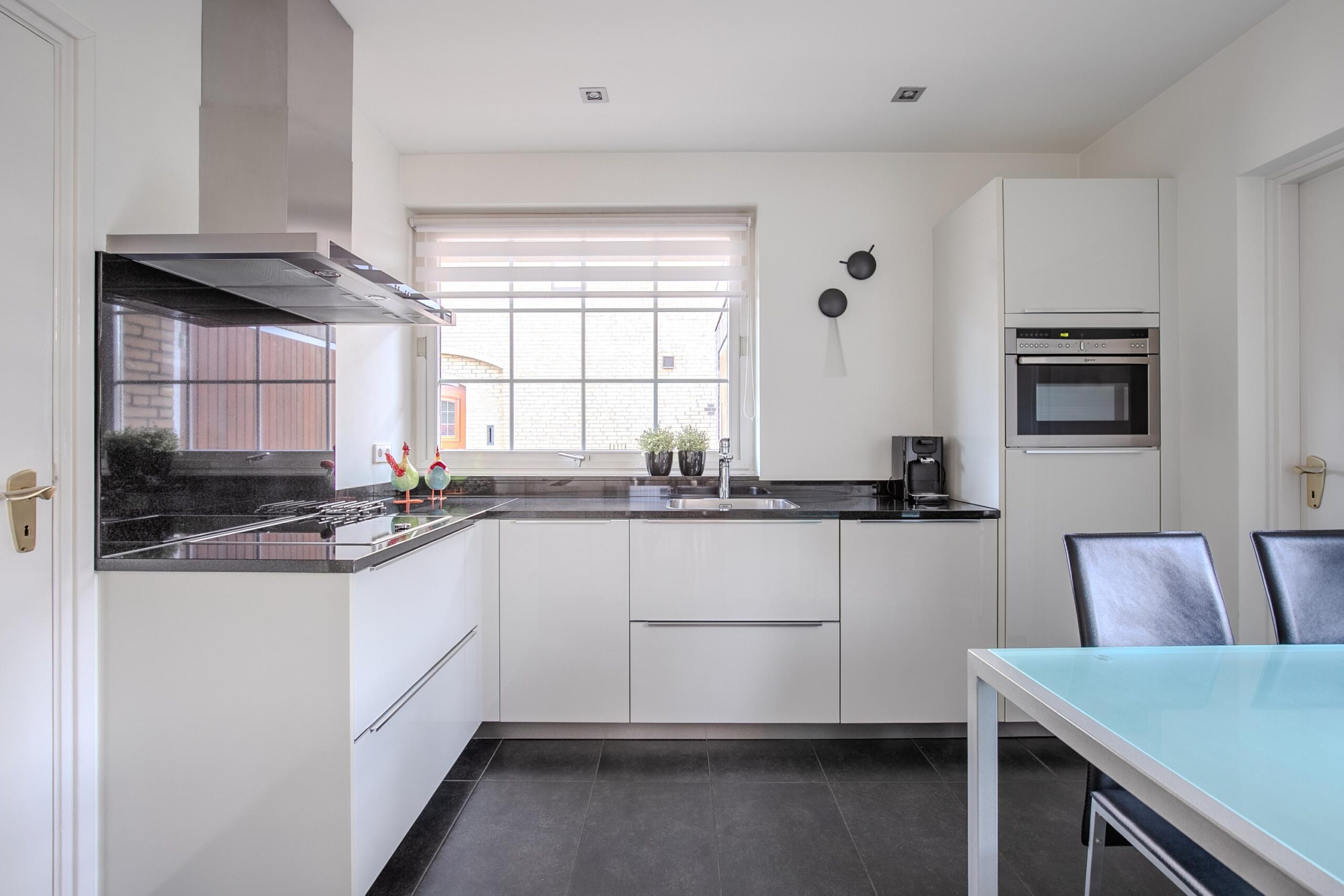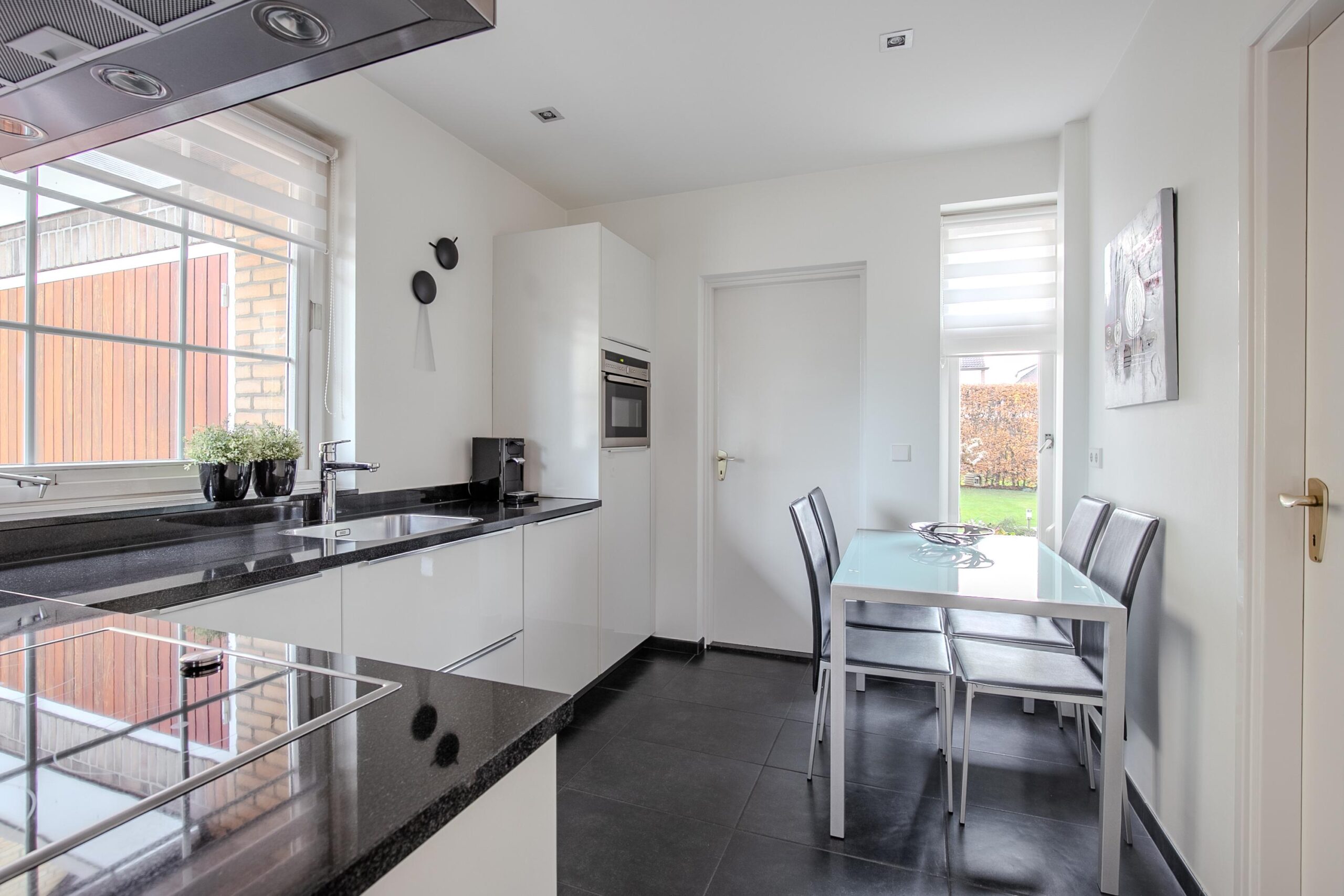 Via de entree bereikt u de hal met meterkast. Vanuit de hal is de woonkamer (ca. 30 m²) toegankelijk. De woonkamer is voorzien van een sfeervolle (elektrische) haard en tuindeur, terwijl de brede raampartijen de ruimte rijkelijk van daglicht voorzien. Tevens is de achterkant en zijkant van de woning uitgerust met rolluiken. De keuken (ca. 9m²) is ingericht met een moderne inbouwkeuken voorzien van diverse inbouwapparatuur: een inductiekookplaat, afzuigkap, vaatwasser, combi-oven, koelkast en spoelbak. Vanuit de keuken bereikt u de bijkeuken met toilet en cv-ruimte. De bijkeuken biedt tevens directe toegang tot de inpandige garage (ca. 16 m²).