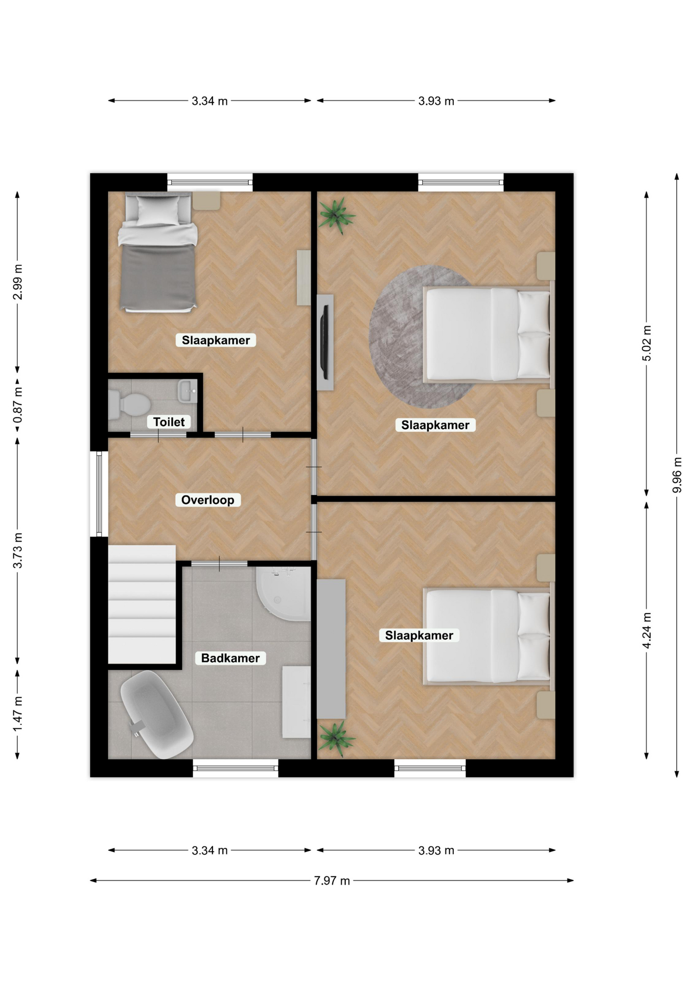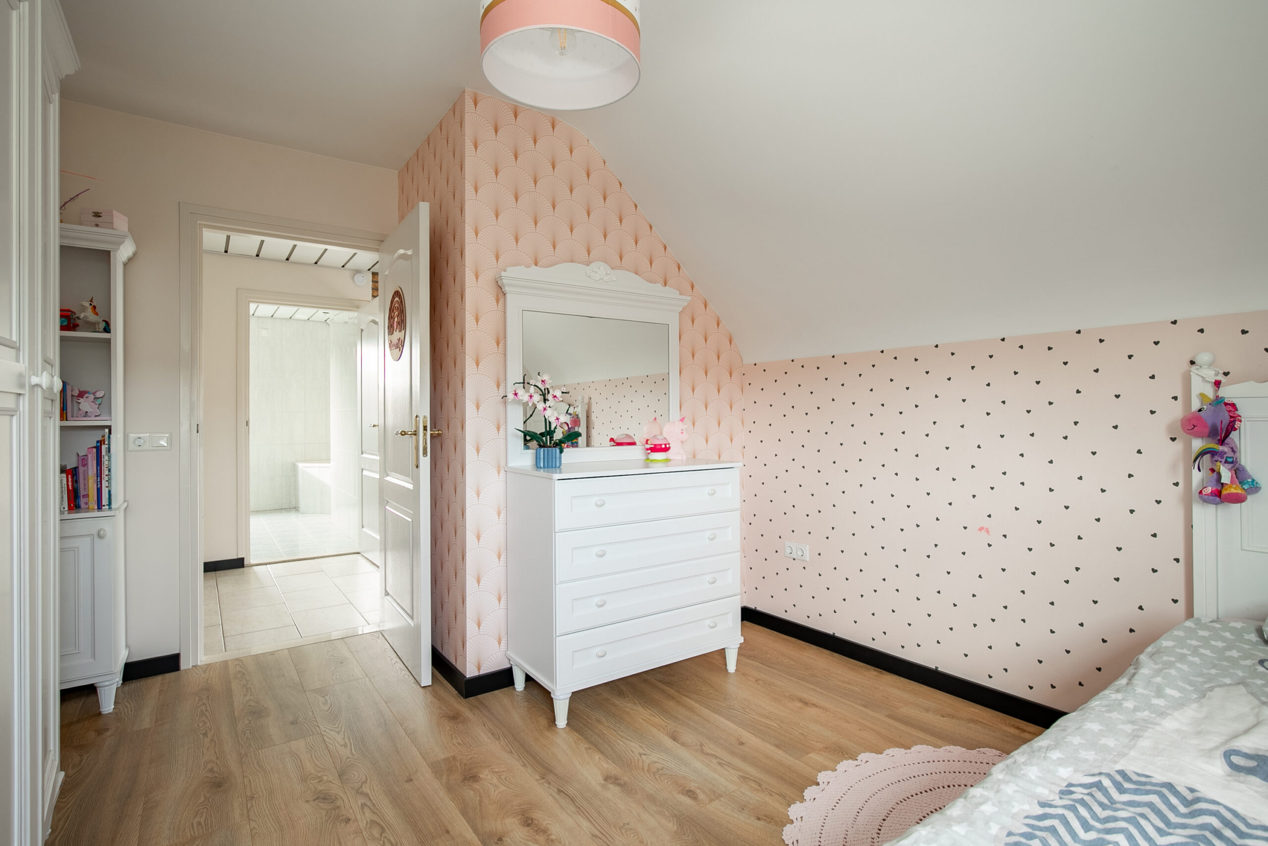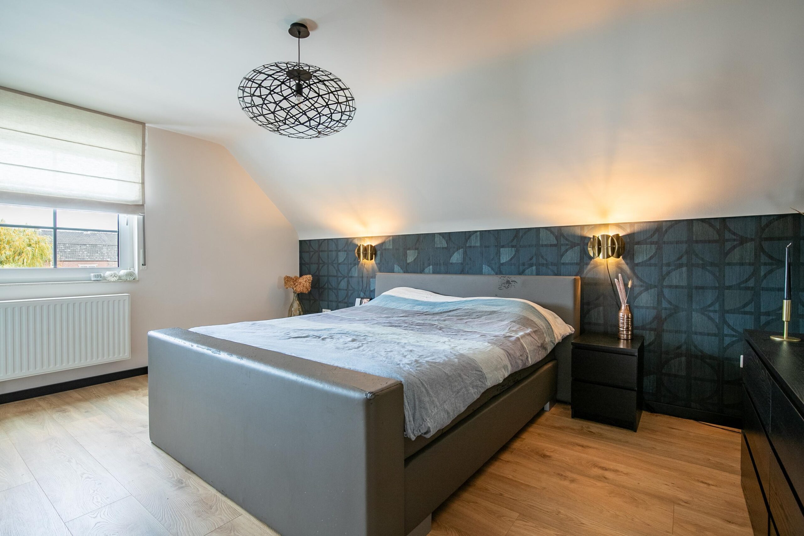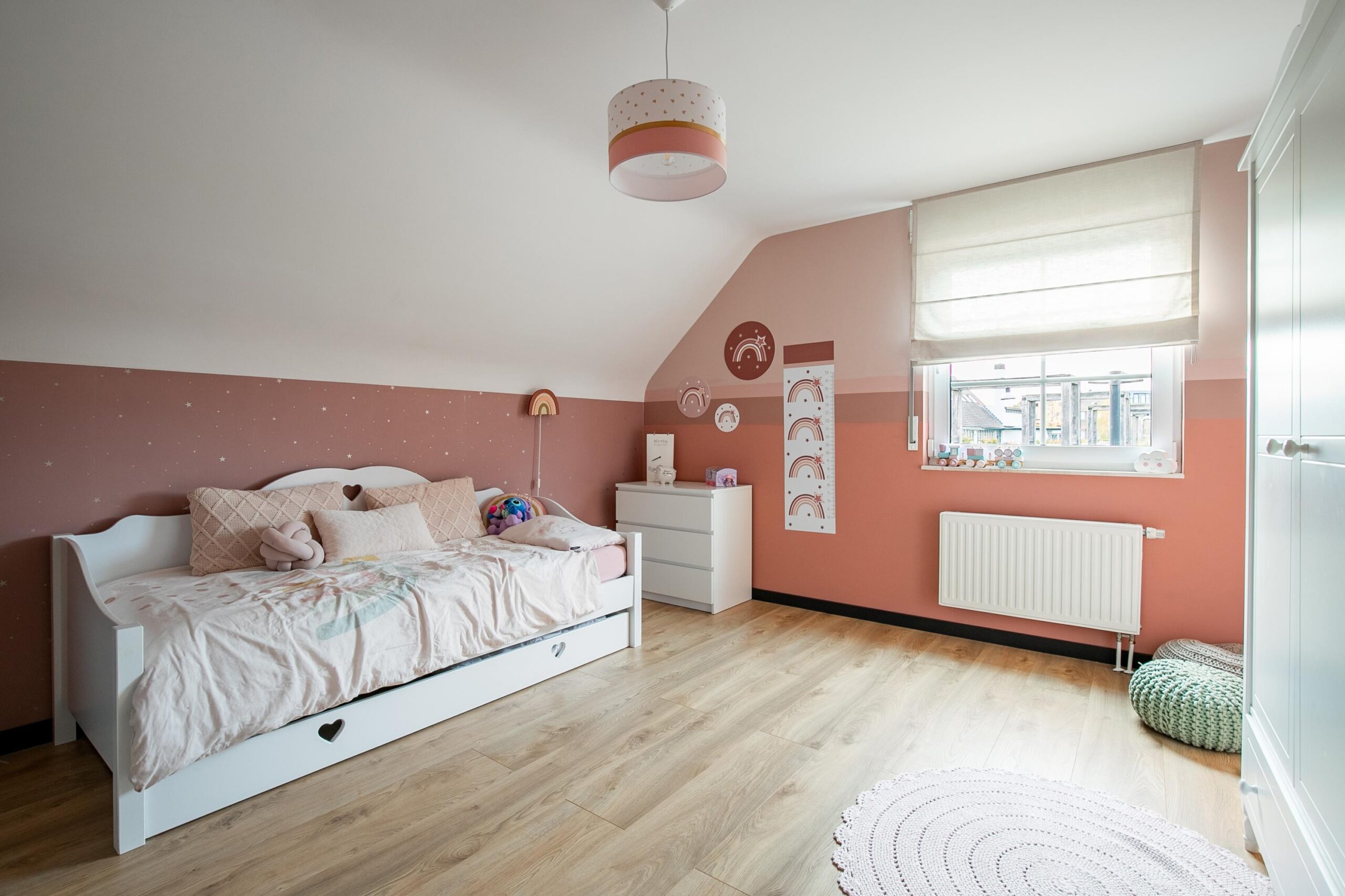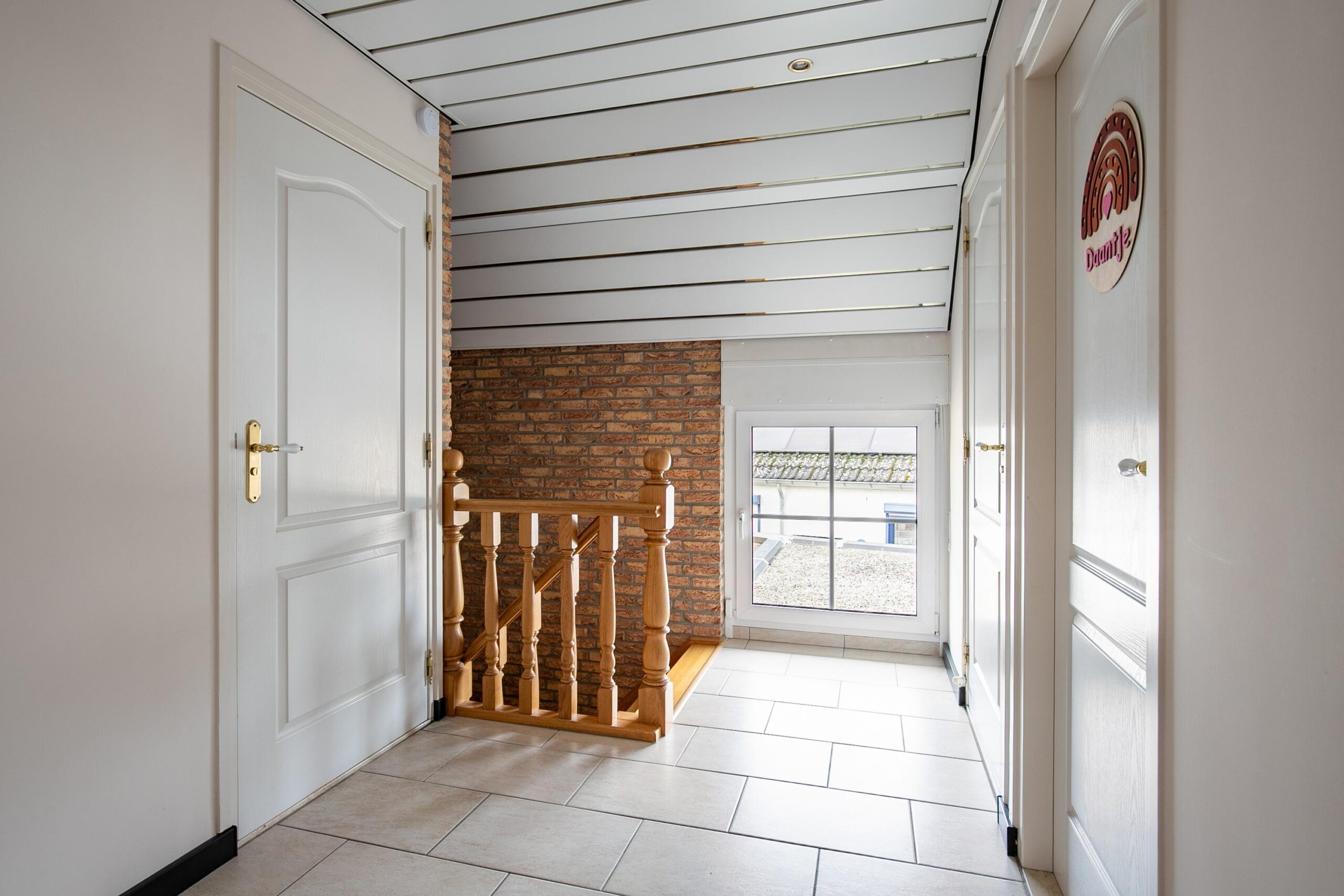 Via robuuste trap toegang tot eerste verdieping. Ruime overloop, voorzien van airconditioning (Daikin, eigendom) en met toegang tot drie goed afgewerkte ruime slaapkamers, alle drie voorzien van een moderne laminaatvloer en welke respectievelijk groot zijn: