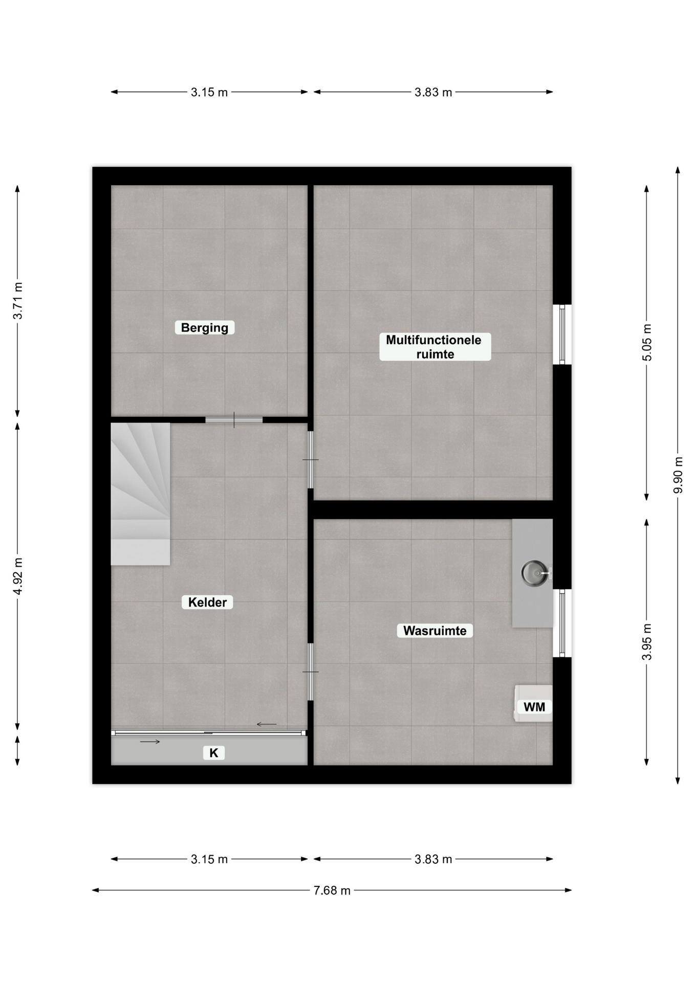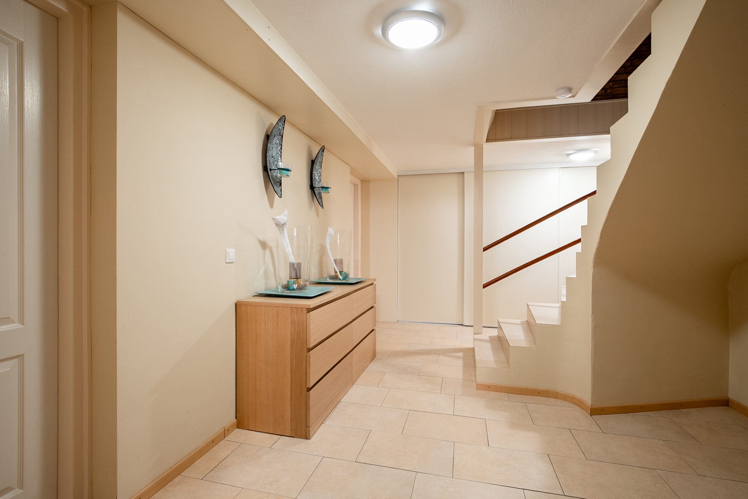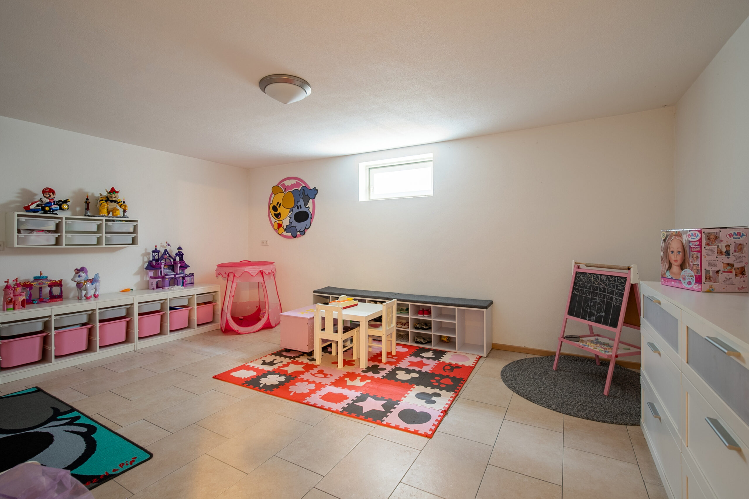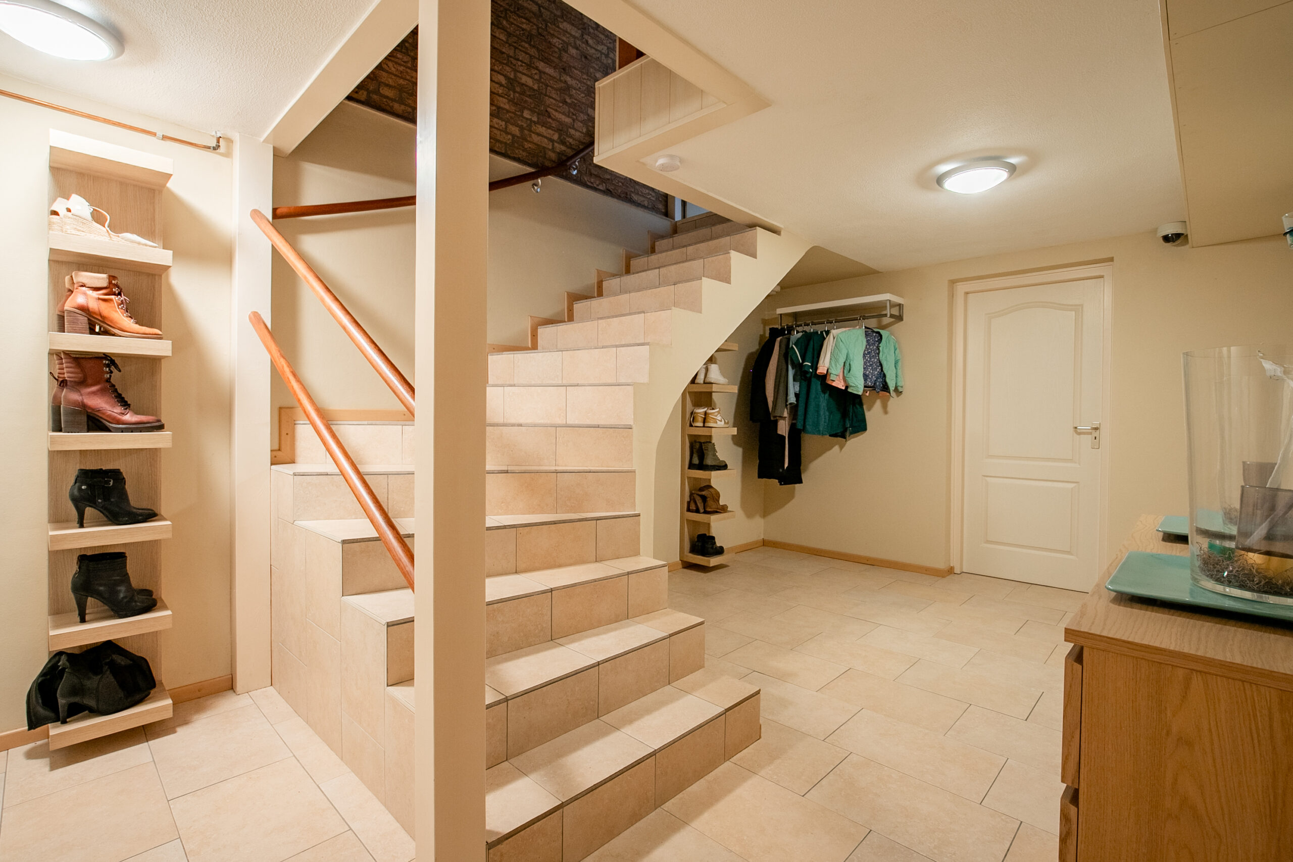Vanuit de ontvangsthal bereikt u het verwarmde souterrain, dat zich onder de volledige woning uitstrekt. Deze verdieping biedt verrassend veel ruimte en functionaliteit. Bij binnenkomst van de eerste kamer treft u een nette ruimte die momenteel in gebruik is als opslag. Hier bevindt zich tevens de verdeler van de vloerverwarming voor de begane grond, wat het technische hart van de woning vormt. Daarnaast is er een tweede vertrek dat door de huidige bewoners wordt gebruikt als speelruimte voor de kinderen. Dankzij het aanwezige raam (koekoek) geniet ook deze ruimte van daglicht en natuurlijke ventilatie, wat het tot een aangename en veelzijdige plek maakt. Tot slot bevindt zich in het souterrain een bijzonder verzorgde wasruimte. Deze is uitgerust met aansluitingen voor wasmachine en droger, en beschikt over een praktisch keukenblok met wastafel. De afwerking en indeling maken dit souterrain tot een volwaardige verdieping, die, afhankelijk van de behoefte, eenvoudig kan worden ingericht als hobbyruimte, werkplek, fitnessruimte of extra opslag.