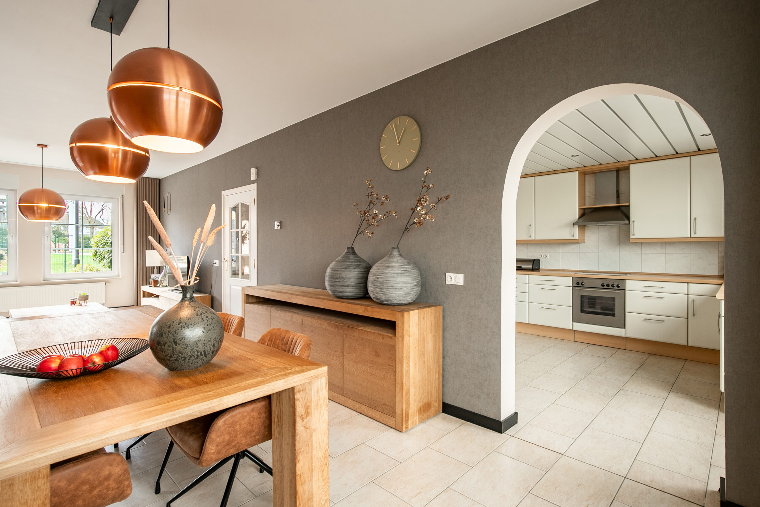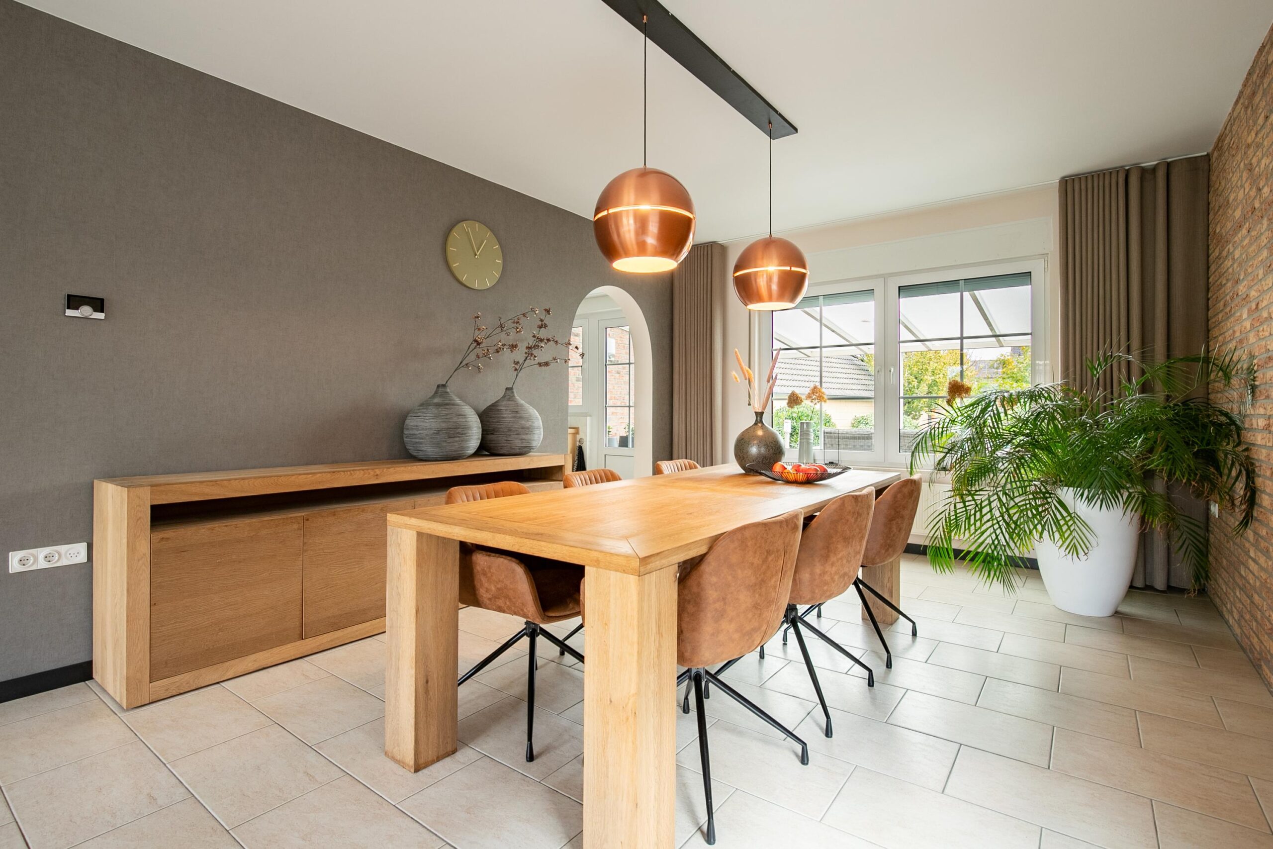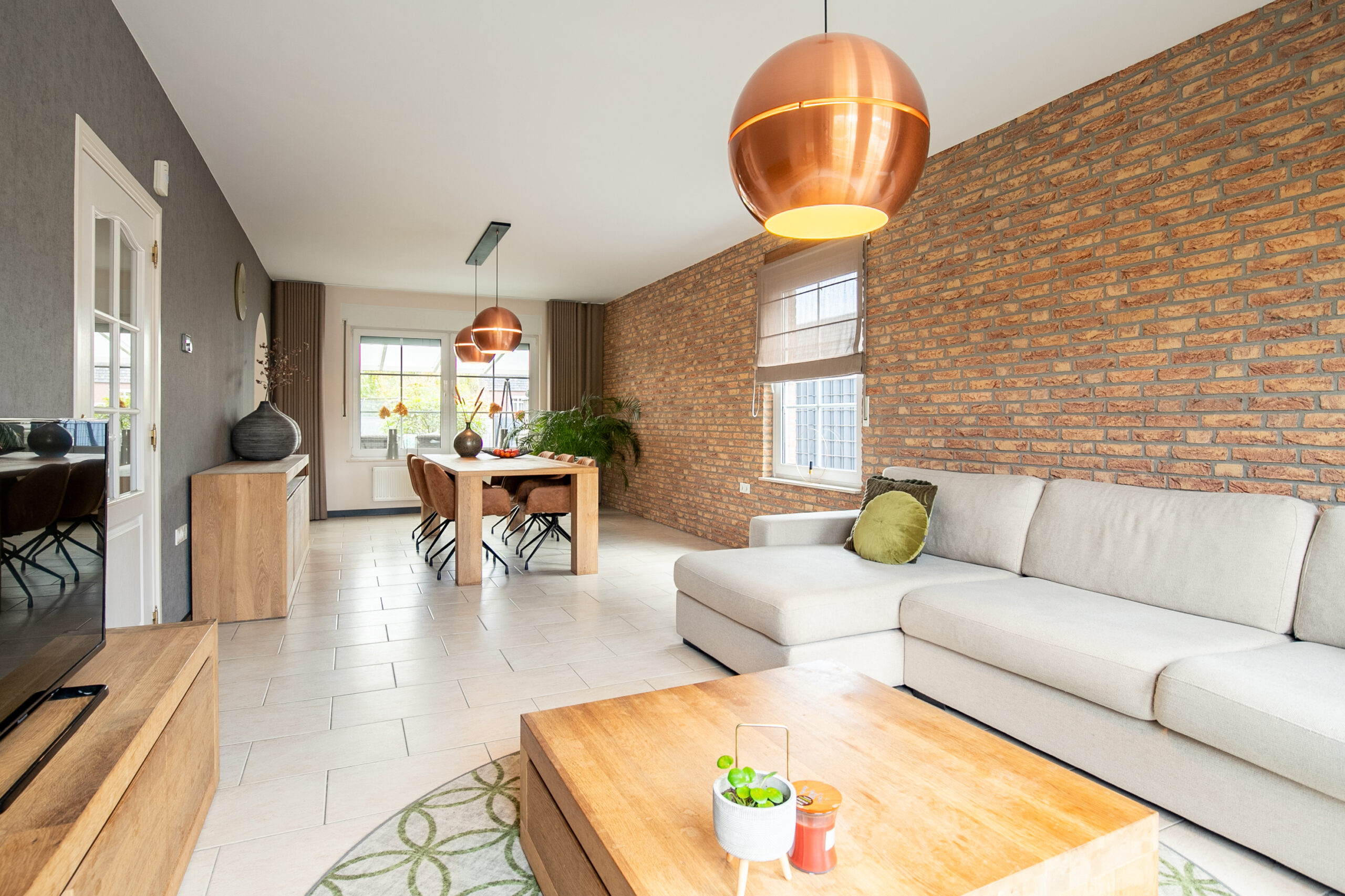 Via de onderhoudsvriendelijke voortuin en oprit bereikt u de overdekte entree. De ruime ontvangsthal (ca. 15 m²) beschikt over een moderne meterkast, garderobe, een robuuste trapopgang naar de eerste verdieping en een in 2024 volledig vernieuwde toiletruimte met vrijhangend toilet en stijlvol wastafelmeubel. Vanuit de hal is toegang tot de woonkamer, het souterrain en de garage. De lichte woonkamer (ca. 37 m²) is voorzien van grote raampartijen met roeden, die zorgen voor een prettige lichtinval. De ruimte is deels afgewerkt met strak stucwerk en deels met schoon metselwerk, wat zorgt voor een sfeervolle uitstraling. De gesloten leefkeuken (ca. 13 m²) bevindt zich aan de achterzijde en is voorzien van een hoekopstelling met diverse inbouwapparatuur: oven, keramische kookplaat, afzuigkap (schouwmodel), vaatwasser en koelkast. De gehele begane grond is voorzien van vloerverwarming en een travertin-kleurige plavuizenvloer.