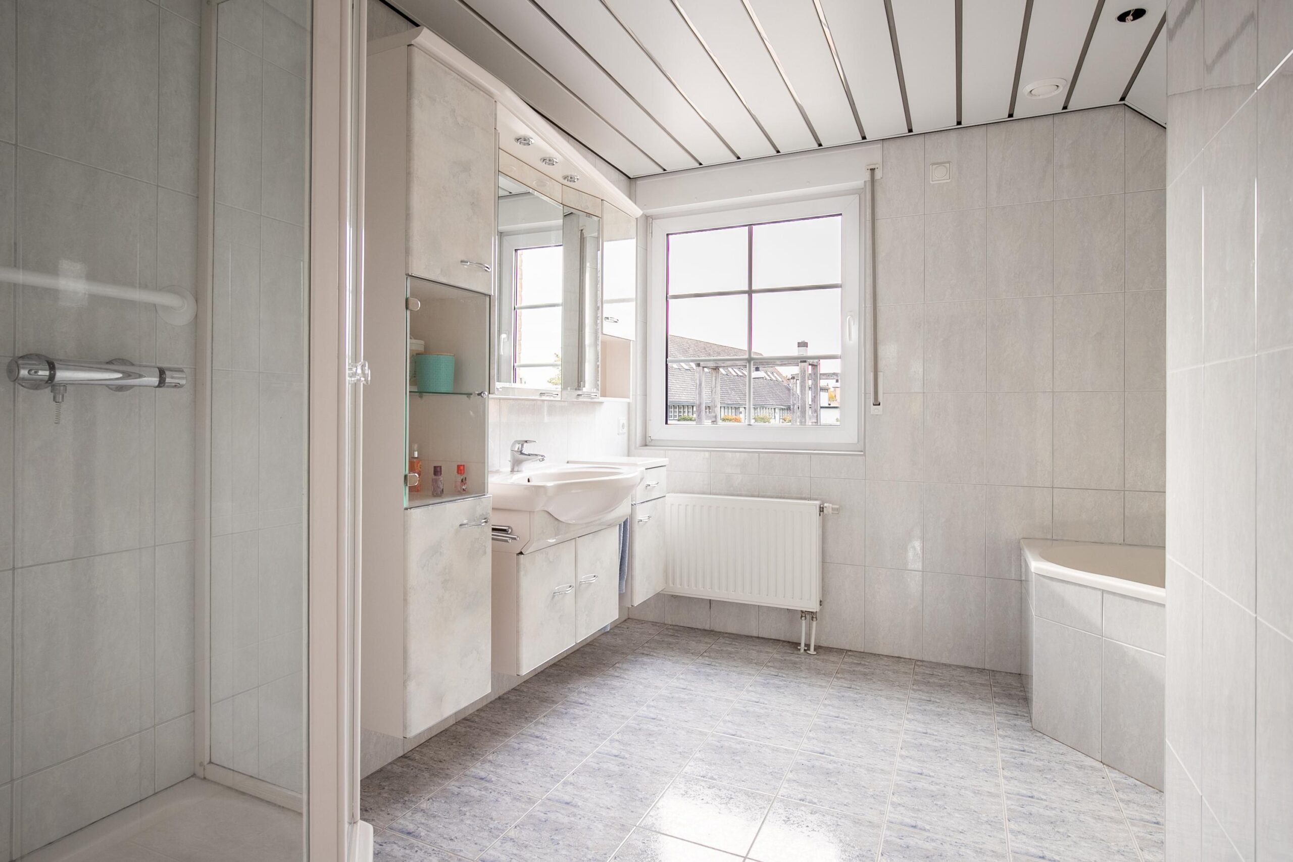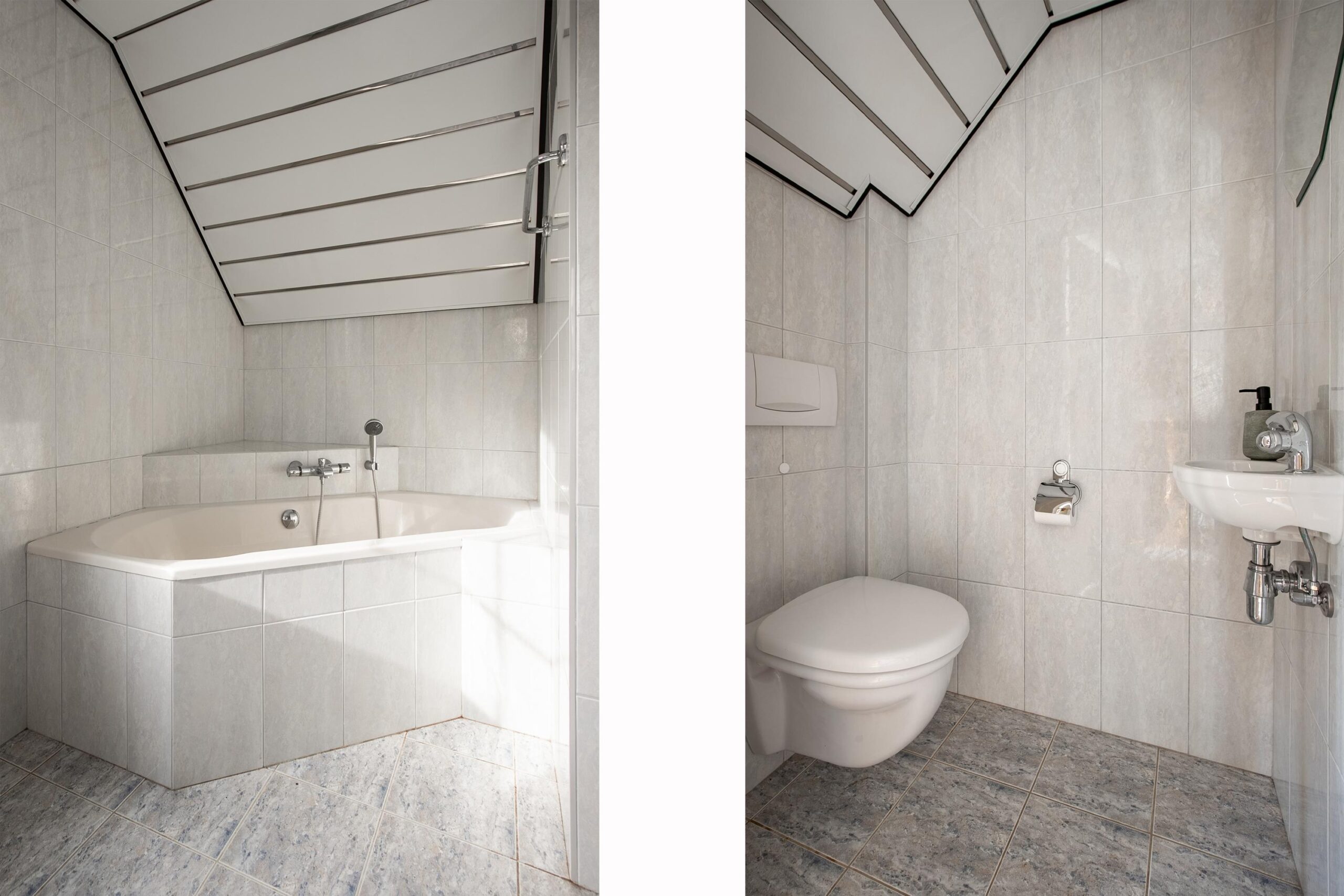De geheel betegelde badkamer (ca. 9 m²) is uitgerust met een ligbad, douche met douchedeuren, wastafelmeubel, mechanische ventilatie en een raam voor daglicht en natuurlijke ventilatie. Daarnaast is er een separaat tweede toilet, eveneens geheel betegeld, voorzien van een vrijhangend closet en fontein.