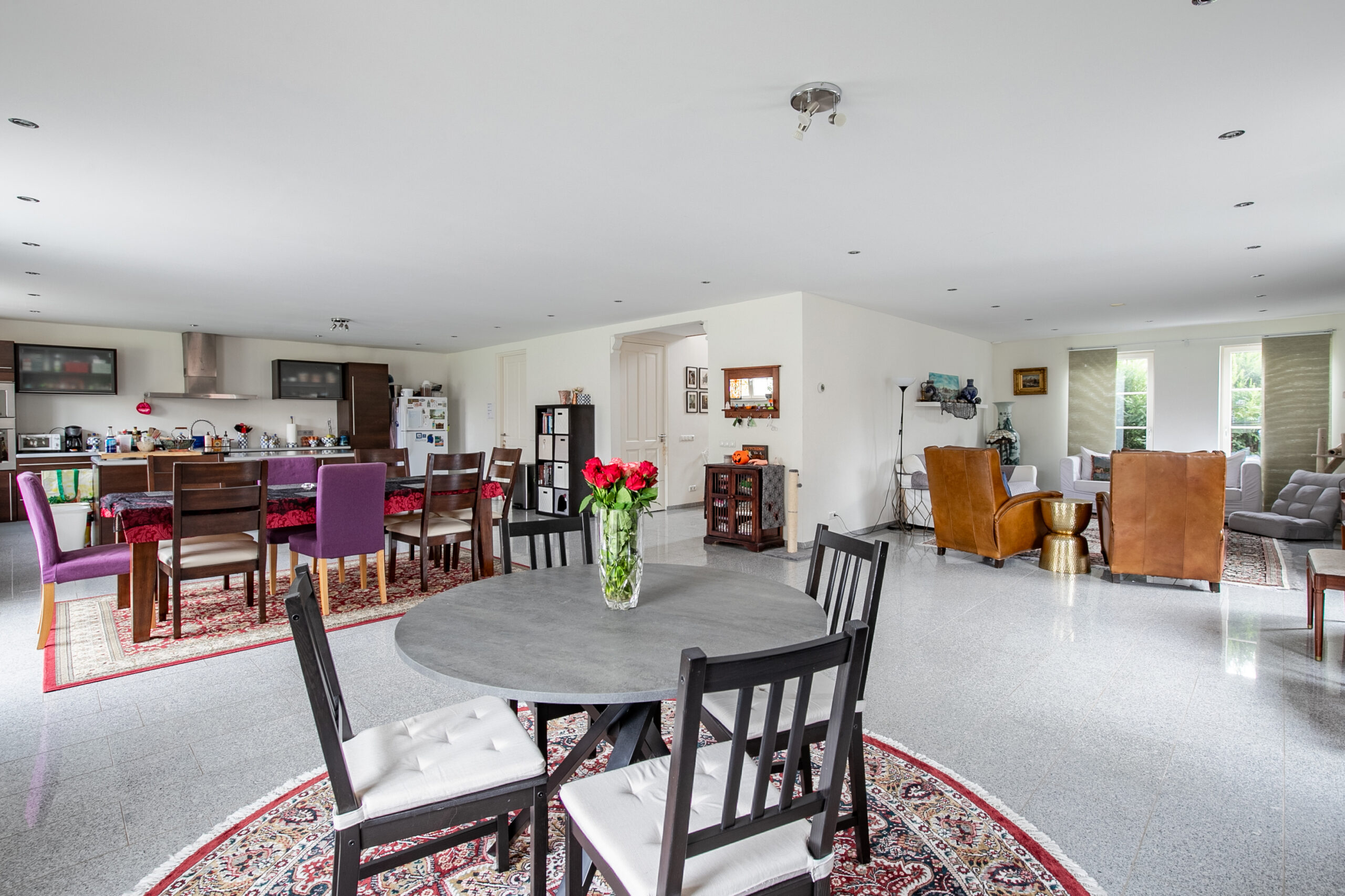 Royale entree met open trapopgang (16 m²), meterkast, betegeld toilet met zwevend toilet en waterfontein. Zeer ruime L-vormige woonkamer (97 m²) met granieten natuursteenvloer en veel lichtinval door grote raampartijen aan weerszijde van de ruimte. Open keuken voorzien van kookeiland en diverse apparatuur met o.a. keramische kookplaat, afzuigkap, magnetron, oven, vaatwasser en koel-/vriescombinatie. Bijkeuken (21 m²) voorzien van granieten vloer, c.v.-installatie en het wasmachineaansluitpunt.