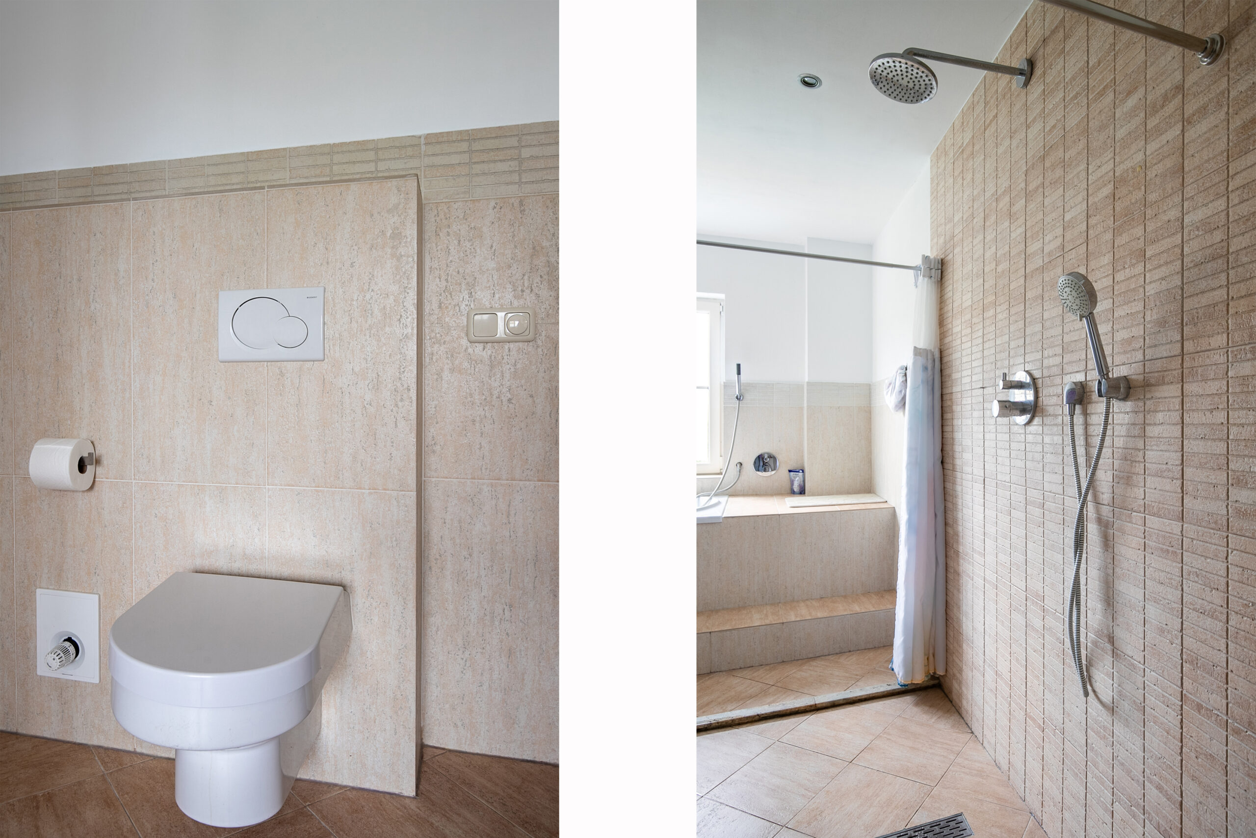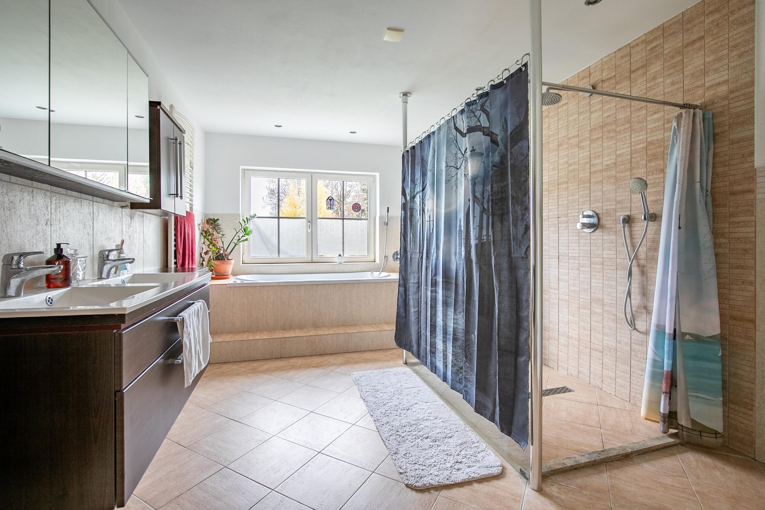 - Badkamervoorzieningen Ligbad, toilet, dubbele wastafel, inloopdouche
