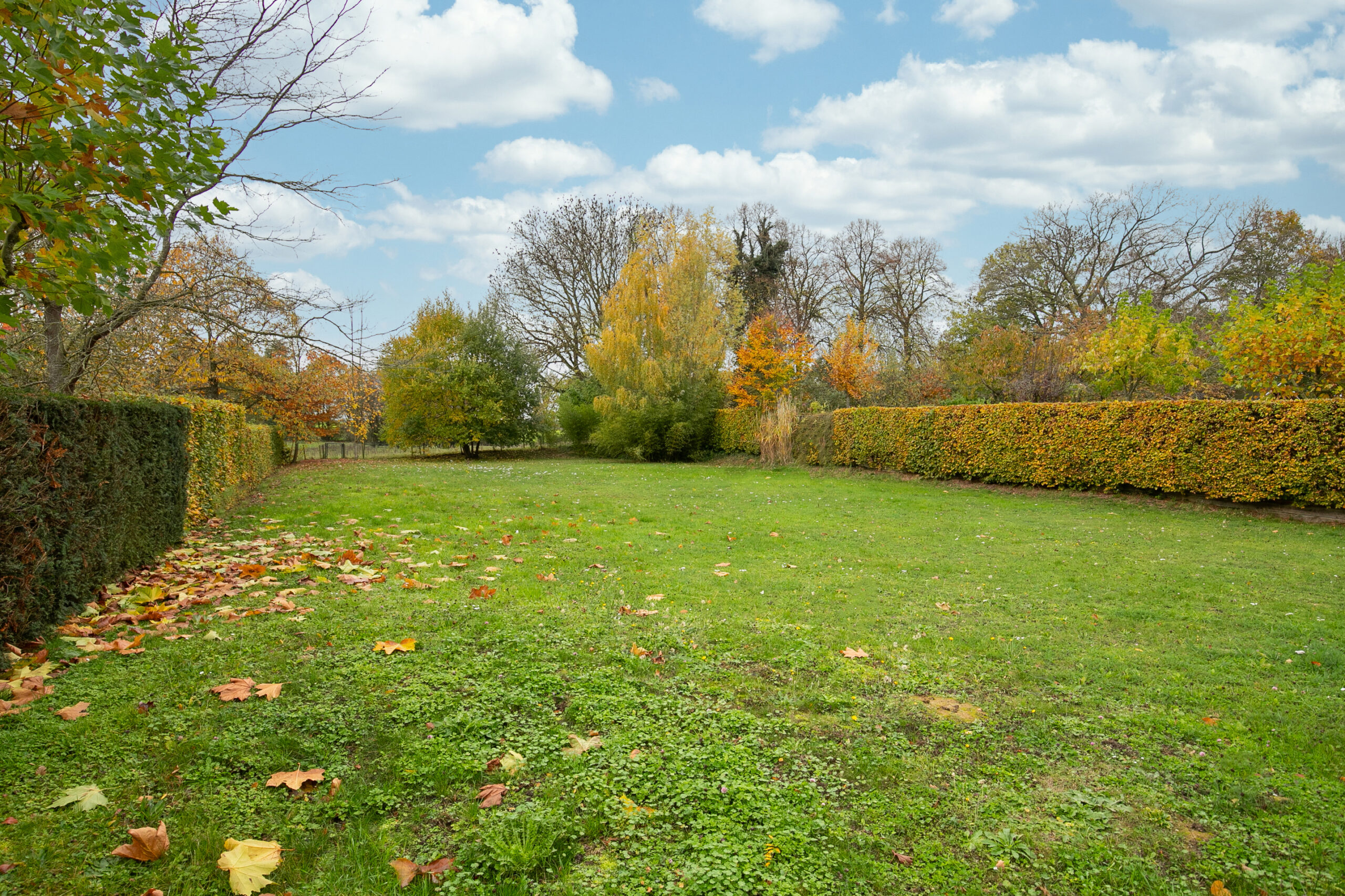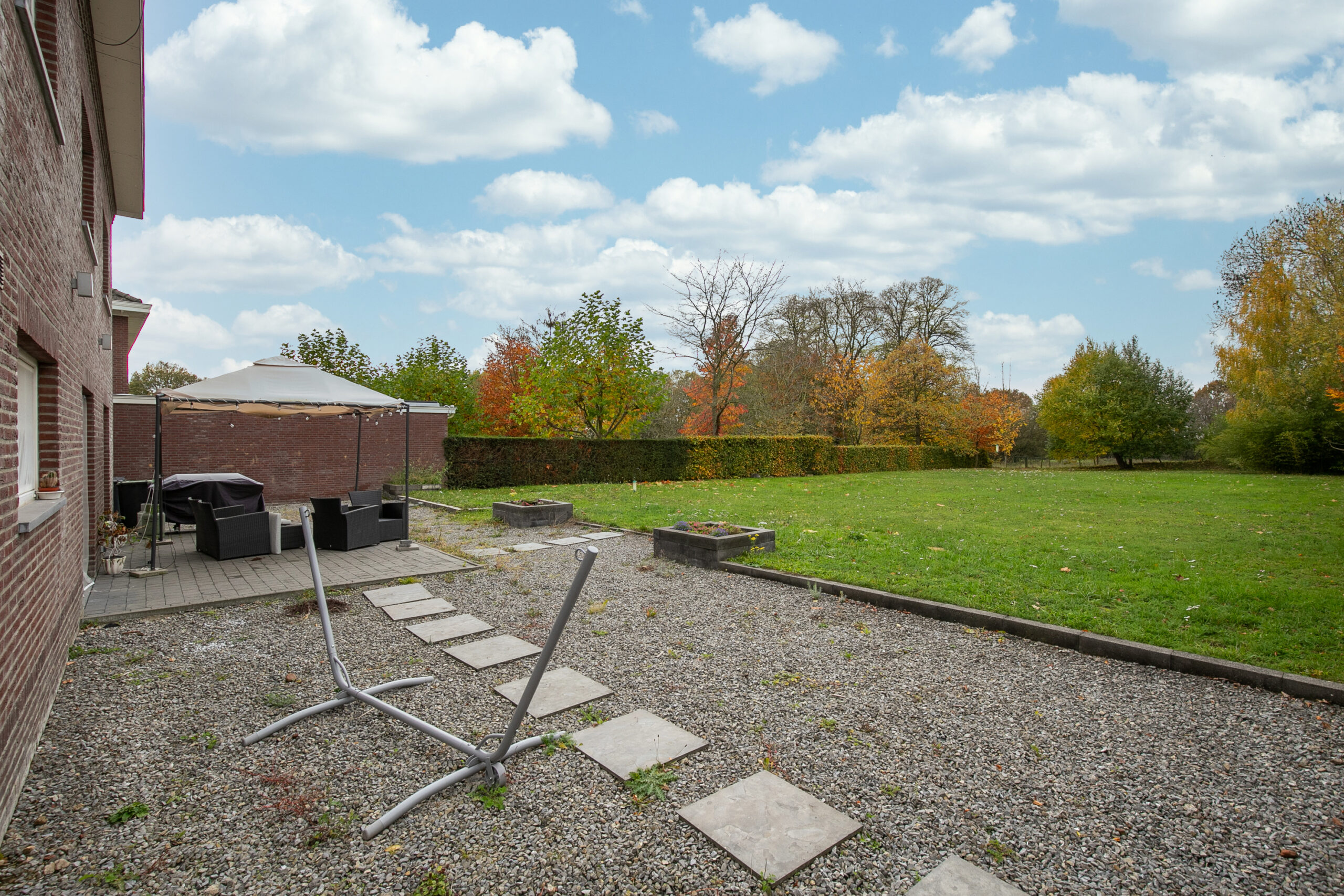 Geheel omsloten tuin met betegeld terras voorzien van hardstenen tegelvloer en weide met vrij uitzicht op de bossen. Via de zijkant van de villa te bereiken achterom.