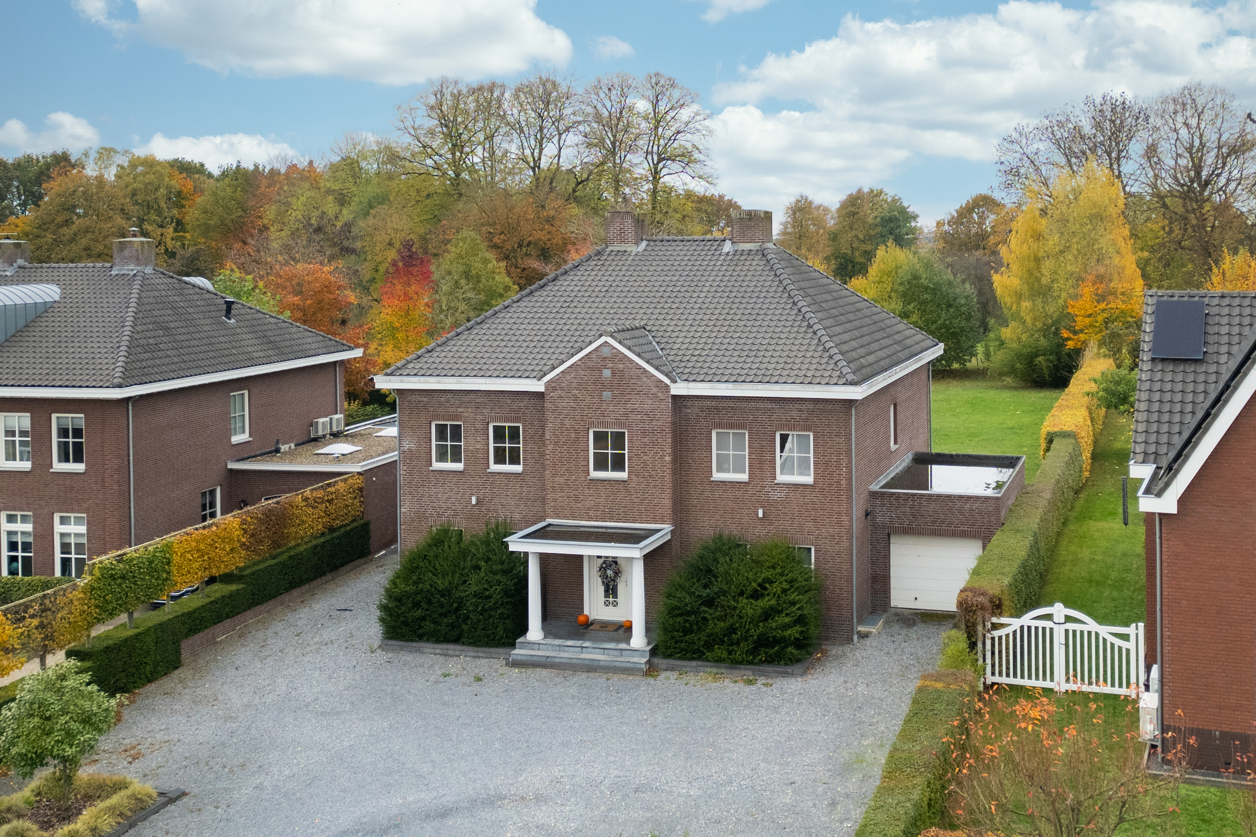 De voortuin is grotendeels met grind aangelegd en biedt voldoende parkeergelegenheid op eigen terrein. Vanuit hier bereikt u de overdekte entree van de woning.