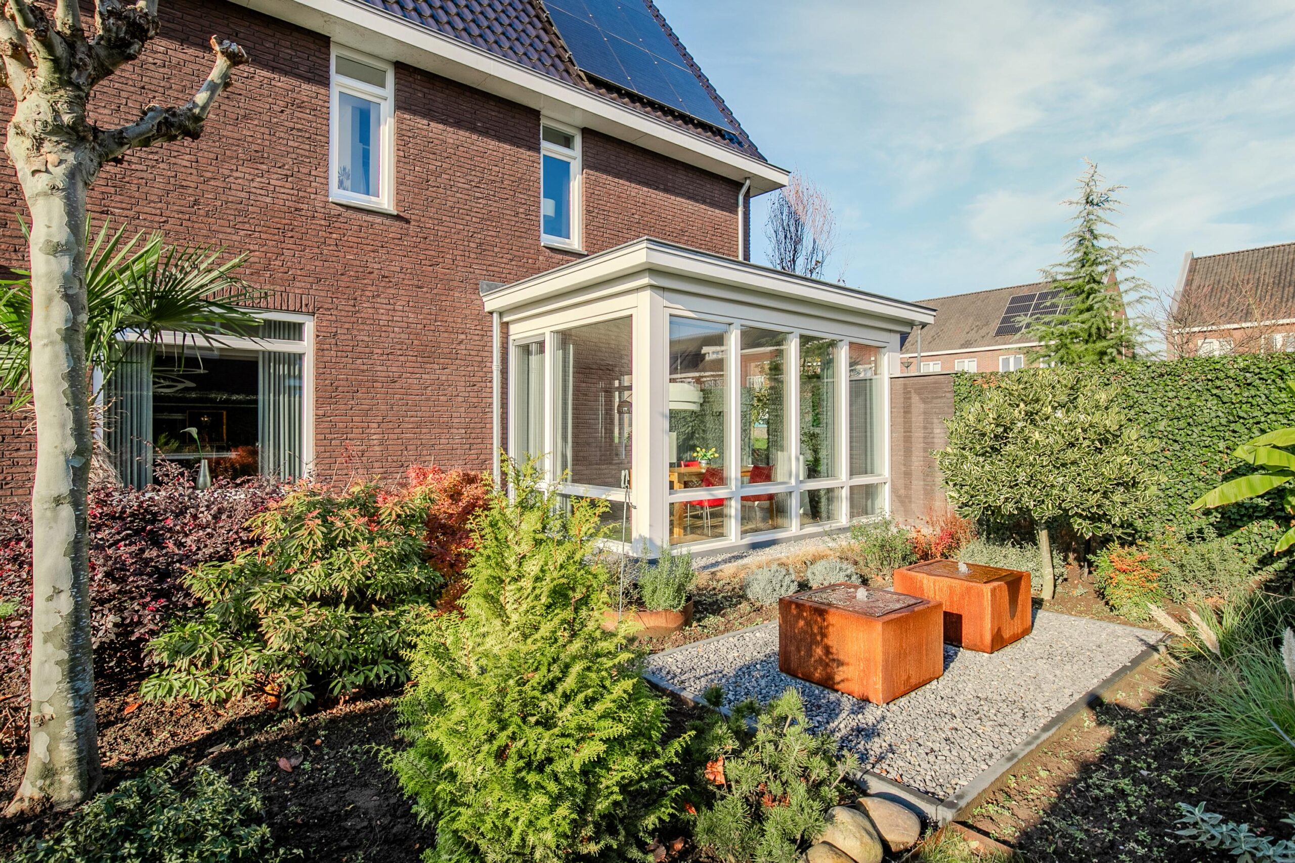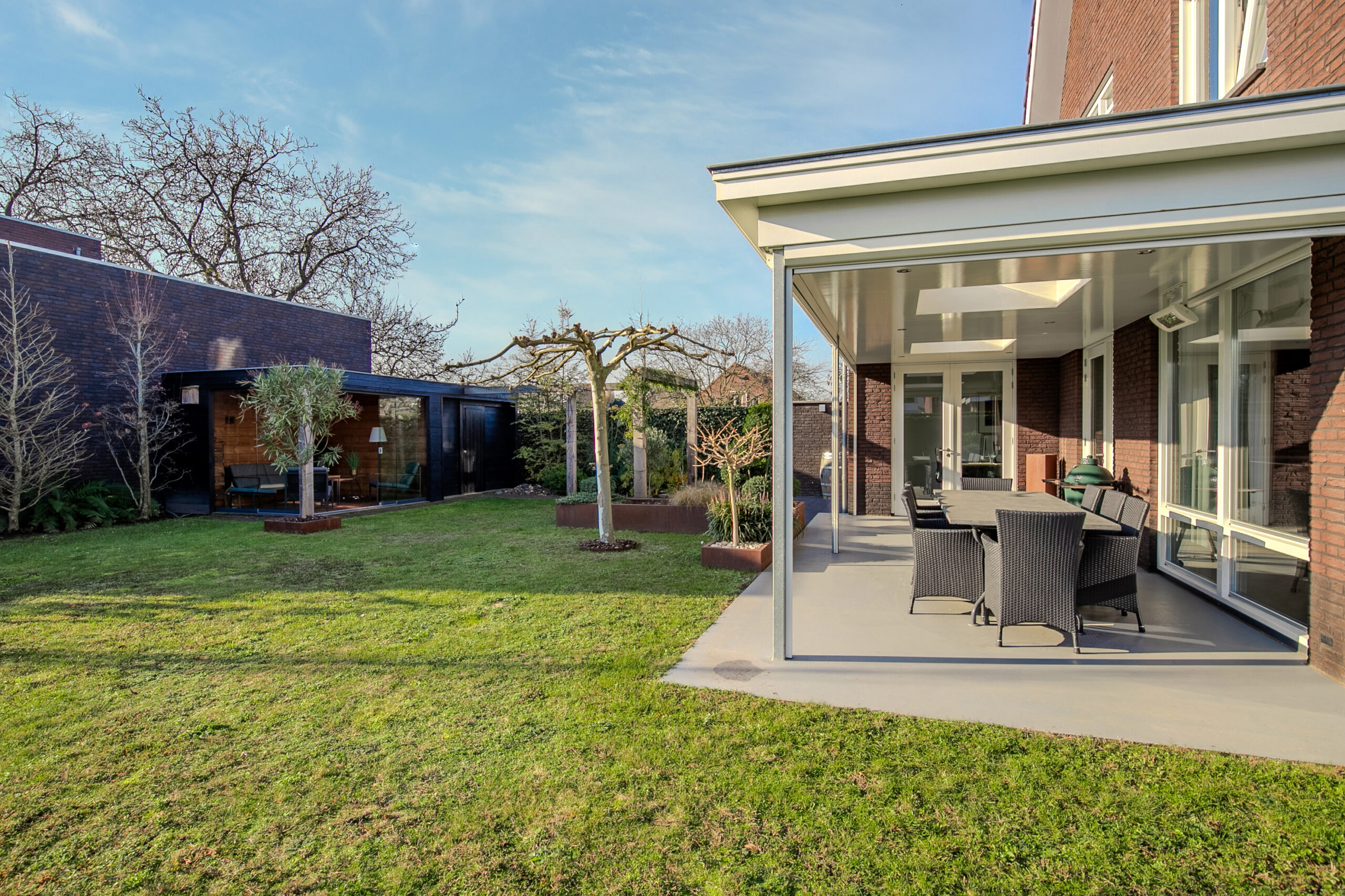 De tuin is geheel omsloten, heeft een zij-ingang en biedt veel rust en privacy. Door de ligging op het zuiden is hier volop zon te vinden en het is royaal met een diepte van ongeveer 15 meter en een breedte van 21 meter. Hier is het heerlijk buiten leven doordat er een groot overdekt terras is 7.25 x 3.00 met lichtkoepels, inbouwspots, terrasheater en zonnescreens. Maar ook in het vrijstaand buitenverblijf is het heerlijk zitten, dit is gesplitst in een tuinkamer van 3.30 x 3.00 met glazen schuifwanden en een berging van 3.00 x 2.80. De tuin is fraai aangelegd met veel beplanting zoals bomen en struiken, veel lichtpunten en afgewerkt met veel cortenstaal details zoals borderranden en waterelementen.