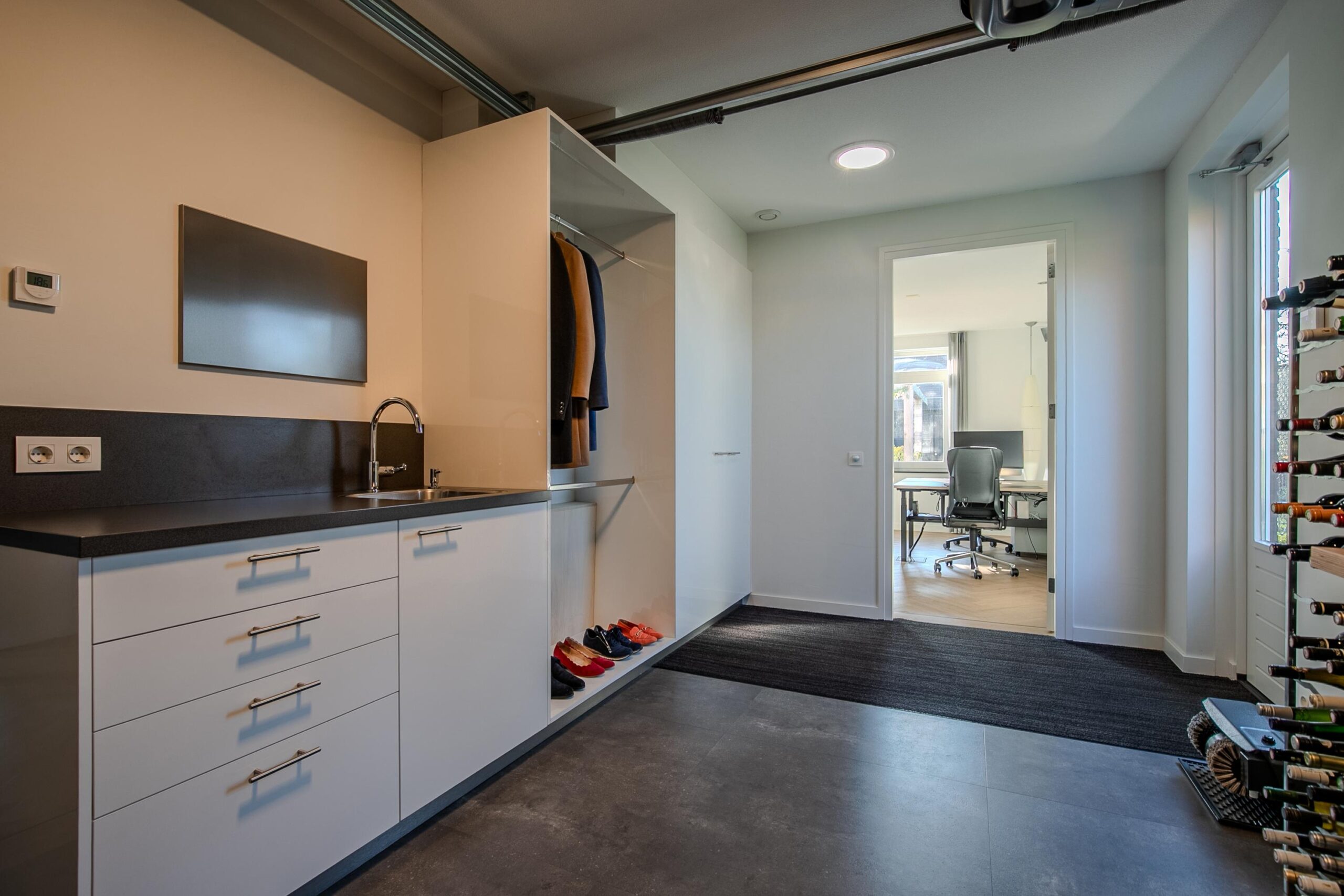 Vanuit de hal is de inpandig berging bereikbaar. Deze is luxe afgewerkt met een tegelvloer en een pantry en kastenwand voor garderobe e.d. Deze geeft tevens toegang tot de werkkamer/het kantoor 4.65 x 3.00, dit is ook te gebruiken als slaapkamer, hobbykamer of speelkamer. Dit kantoor 3,00 x 4,64 is heel licht en heeft openslaande tuindeuren.