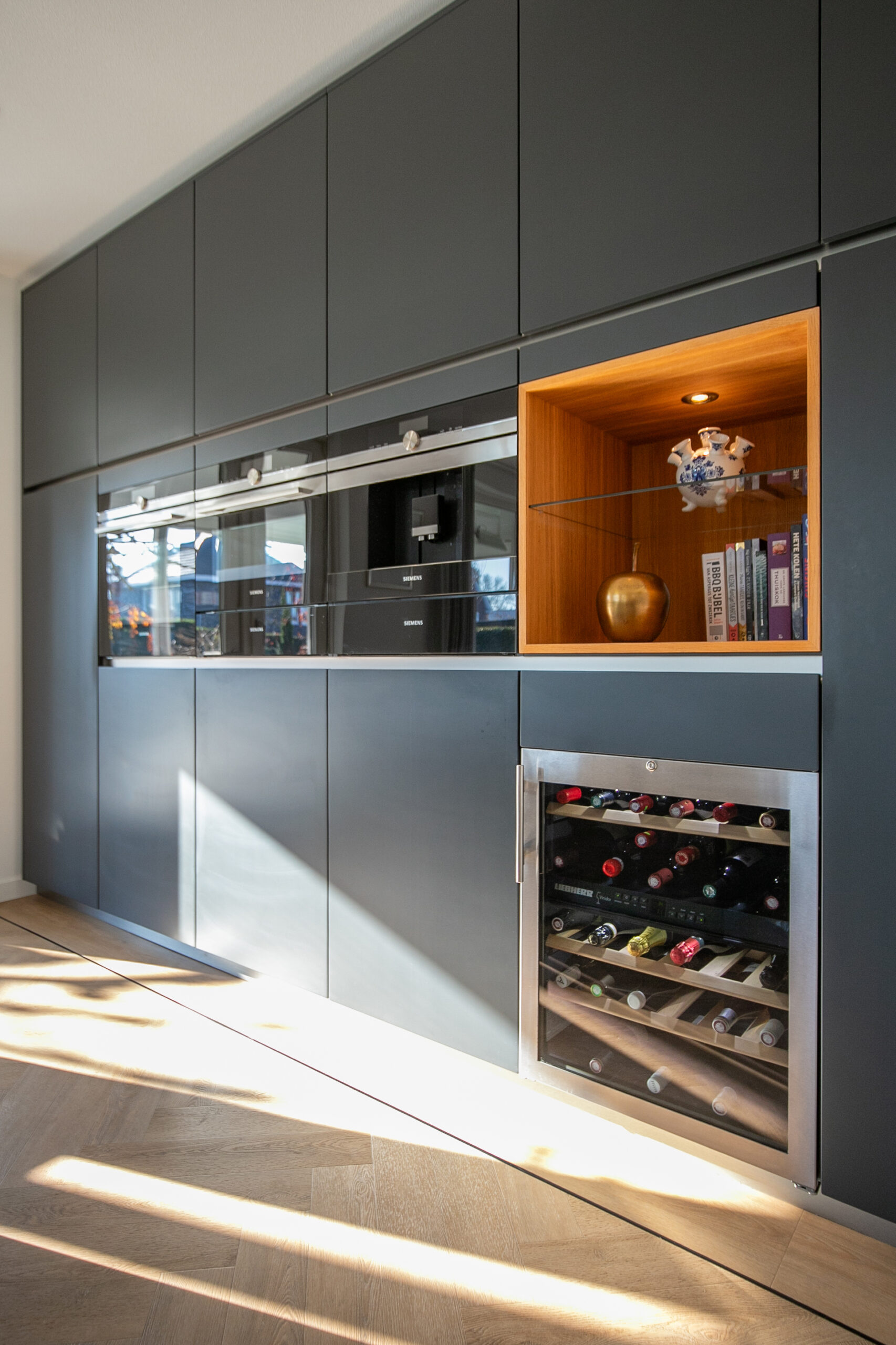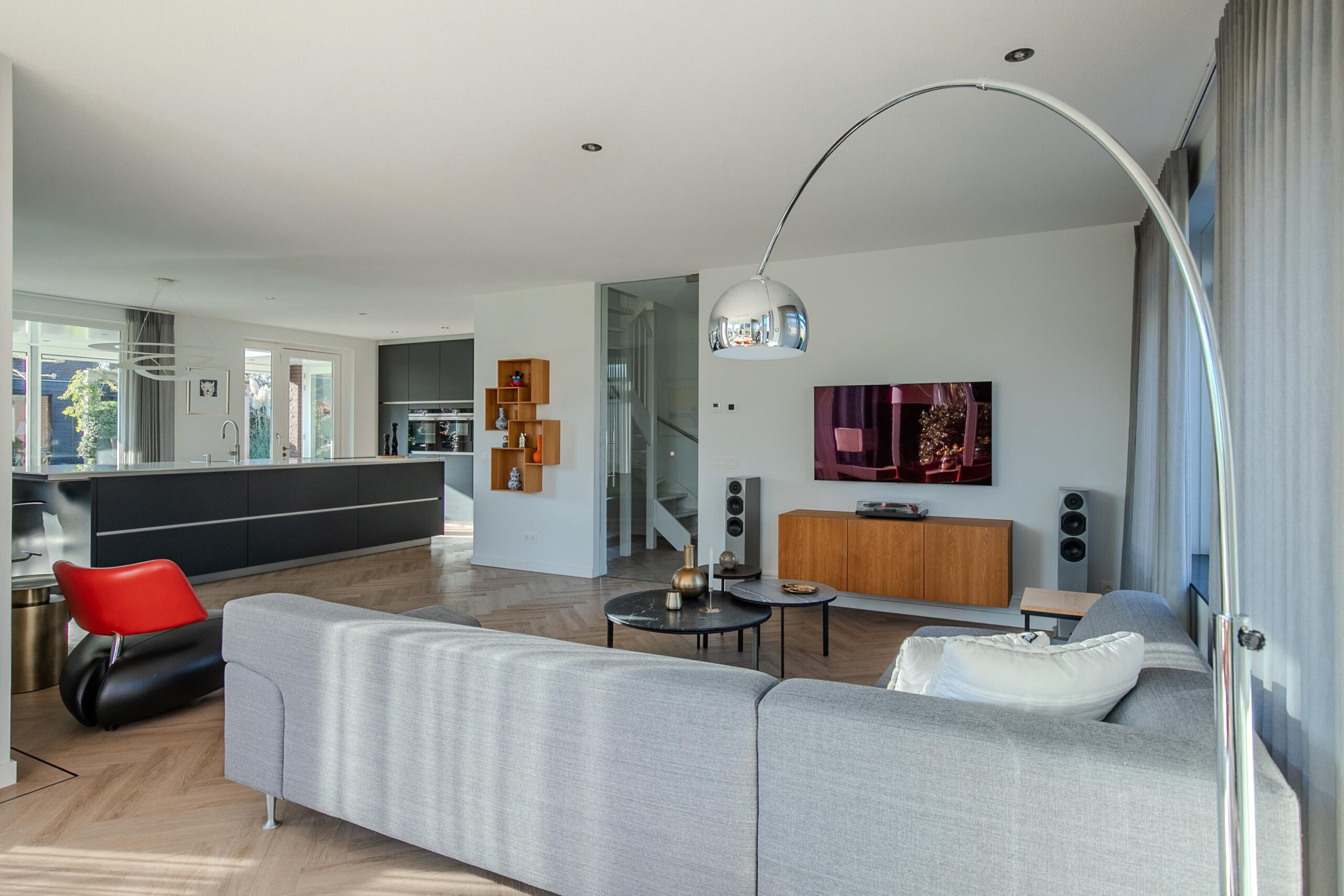 De luxe half open keuken is voorzien van een groot werkeiland en een uitgebreide kastenwand. Deze is voorzien van de navolgende inbouwapparatuur: inductiekookplaat met ingebouwde afzuiging, koelkast, vrieskast, vaatwasser, stoomoven, combi-oven, twee warmhoudlades, Quooker kokend water kraan, koffiemachine en een wijnklimaatkast. Ook de keuken is zeer licht en biedt veel tuincontact door de directe toegang tot de tuin met een separate deur. De woonkamer en de keuken heeft een totale oppervlakte van circa 60 m²