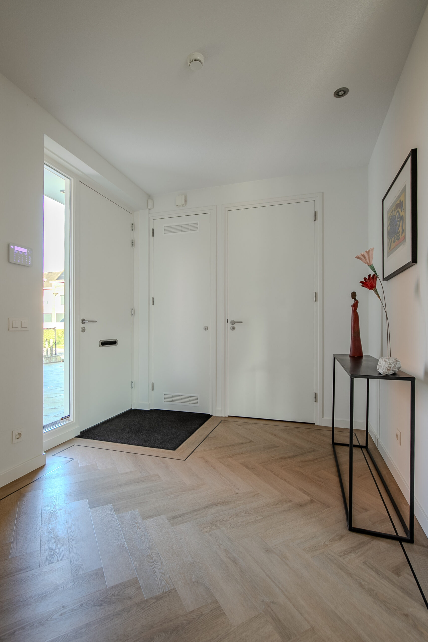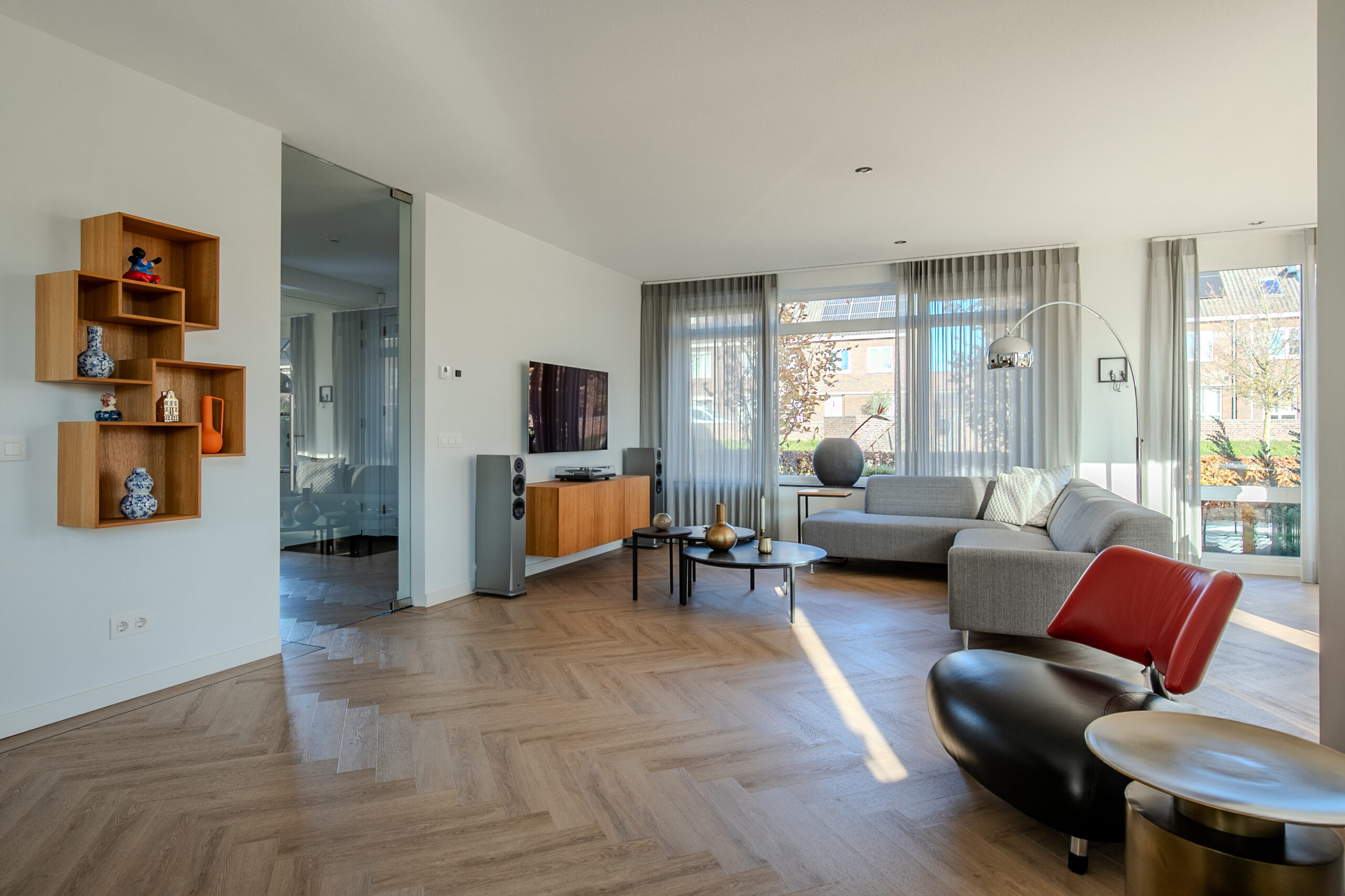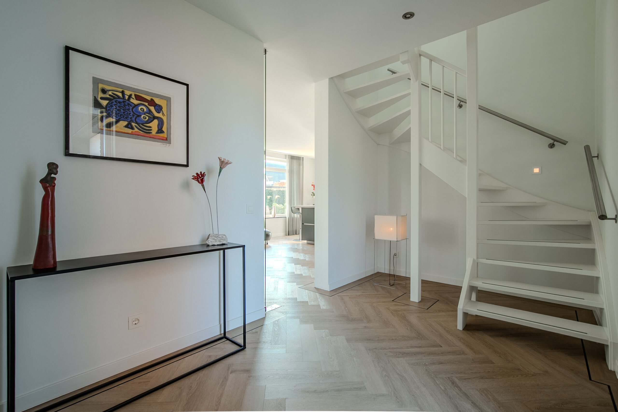 De begane grond vloer is voorzien van een hoogwaardige pvc-vloer in visgraatmotief, afgewerkt met een band en bies voor een extra luxe uitstraling.