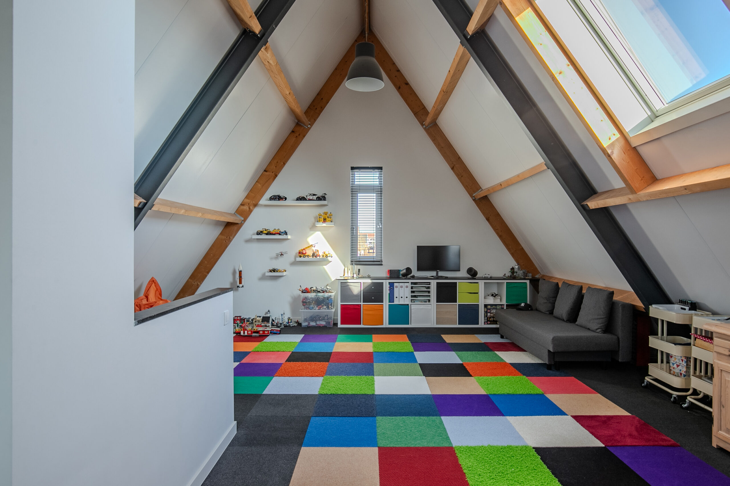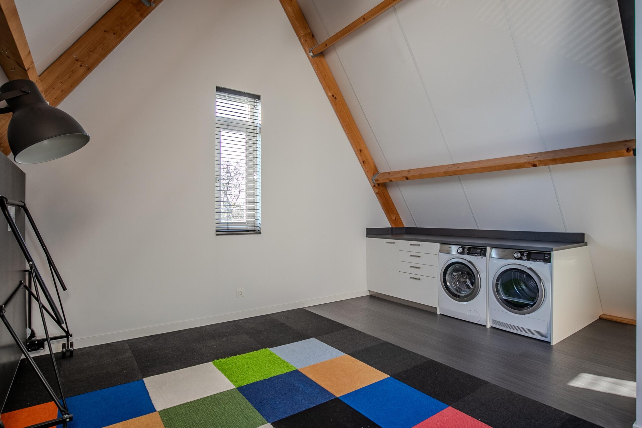 De tweede verdieping is met een vaste trap bereikbaar. Hier is een multifunctionele ruimte van 9.50 x 5.20 met twee vaste ramen en een groot Velux dakraam met rolluik. Hier is een mooi afgewerkte hoek, waar de aansluitpunten voor wasapparatuur mooi zijn weggewerkt en waar de installaties zijn geplaatst. Hier is het Duco ventilatiesysteem en de combi c.v. Nefit 2017 geplaatst welke is uitgebreid met een warmtepomp (deze kan zowel verwarmen als koelen). Deze ruimte is ideaal als speelruimte, sportruimte, relaxruimte, thuisbioscoop, werkruimte of hobbyruimte te gebruiken, maar hier is ook eenvoudig een of twee extra slaapkamers te realiseren.