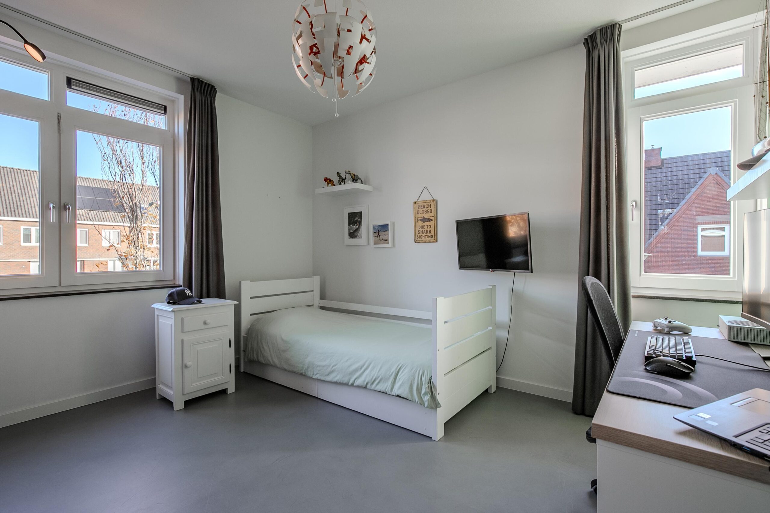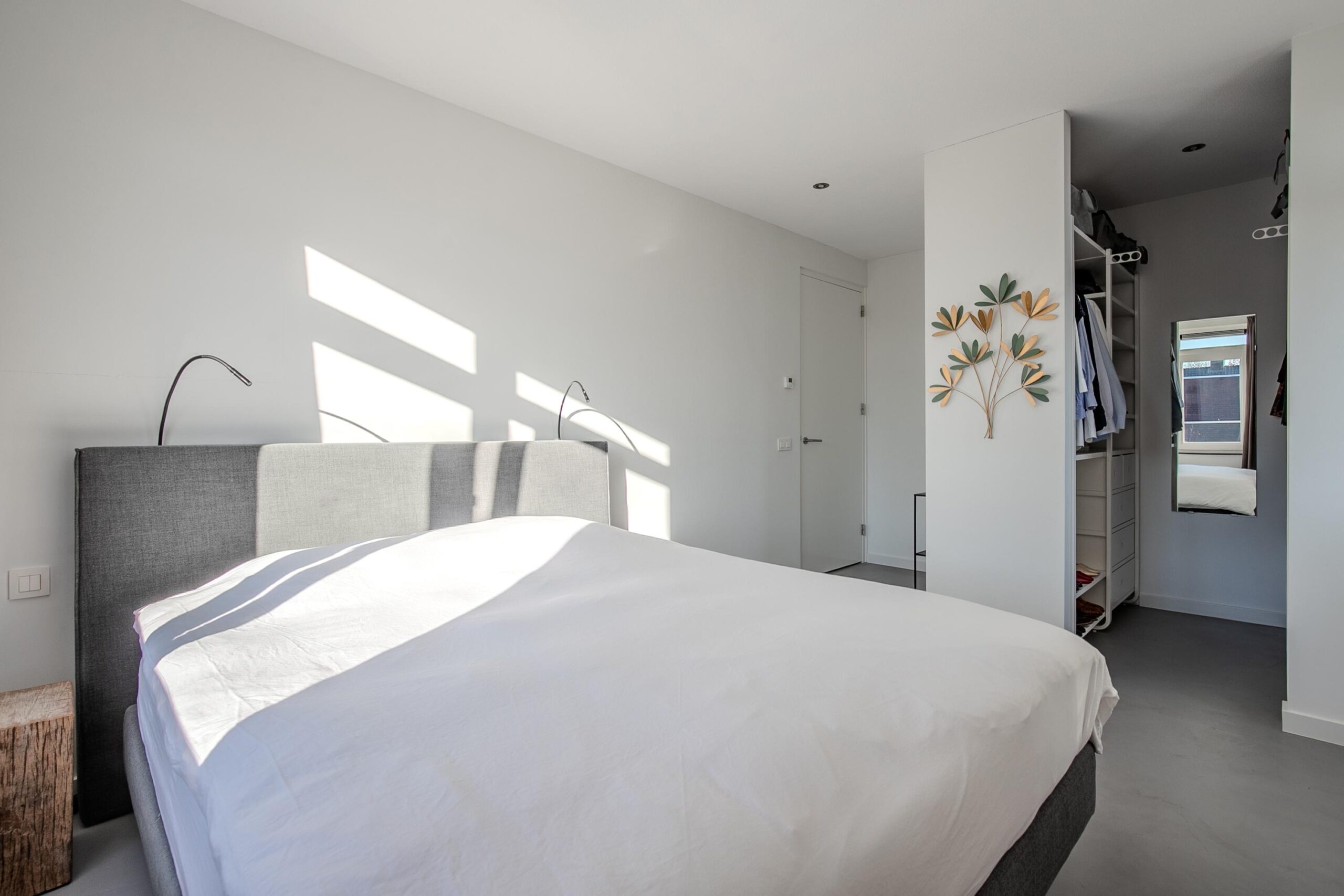 De lichte overloop biedt toegang tot drie slaapkamers, respectievelijk 6.00 x 3.25 met inloopkast, 3.80 x 3.55 en 3.80 x 3.25 (20, 13 en 12 m²). De slaapkamers en de overloop zijn voorzien van een beton ciré vloer, dit zorgt voor een strakke en neutrale uitstraling. De tijdloze badkamer is voorzien van een ligbad, ruime inloopdouche, zwevend toilet en een wastafel meubel met dubbele wastafel.