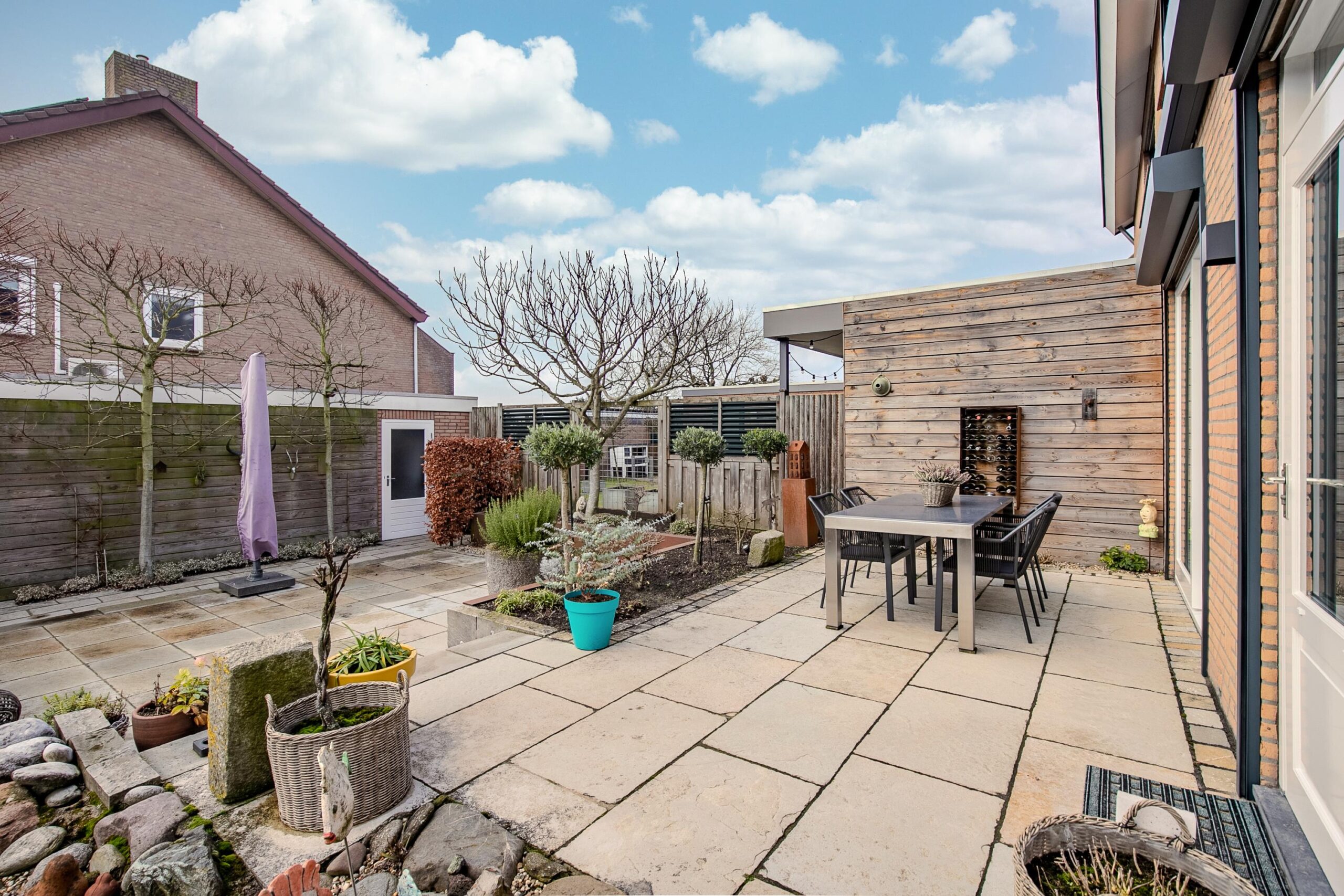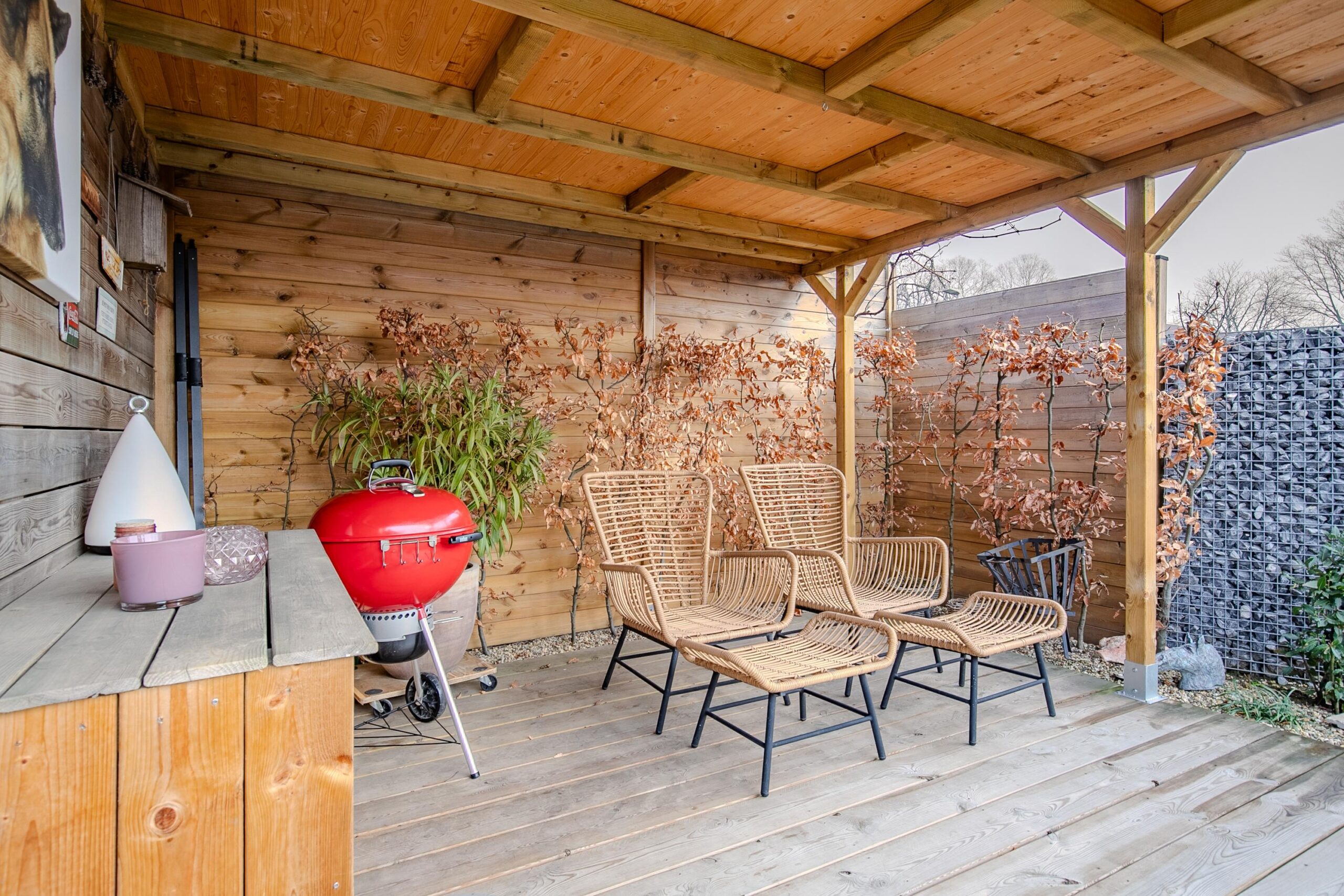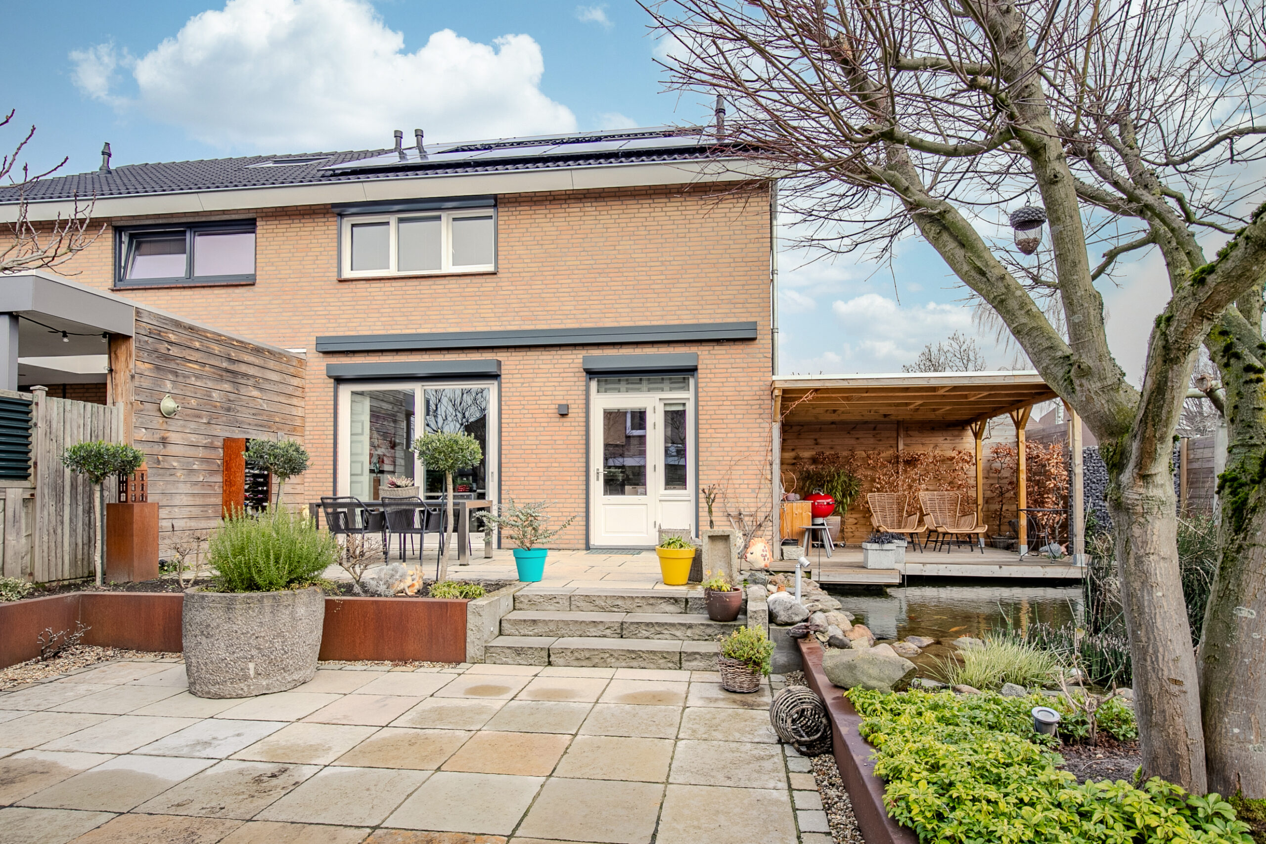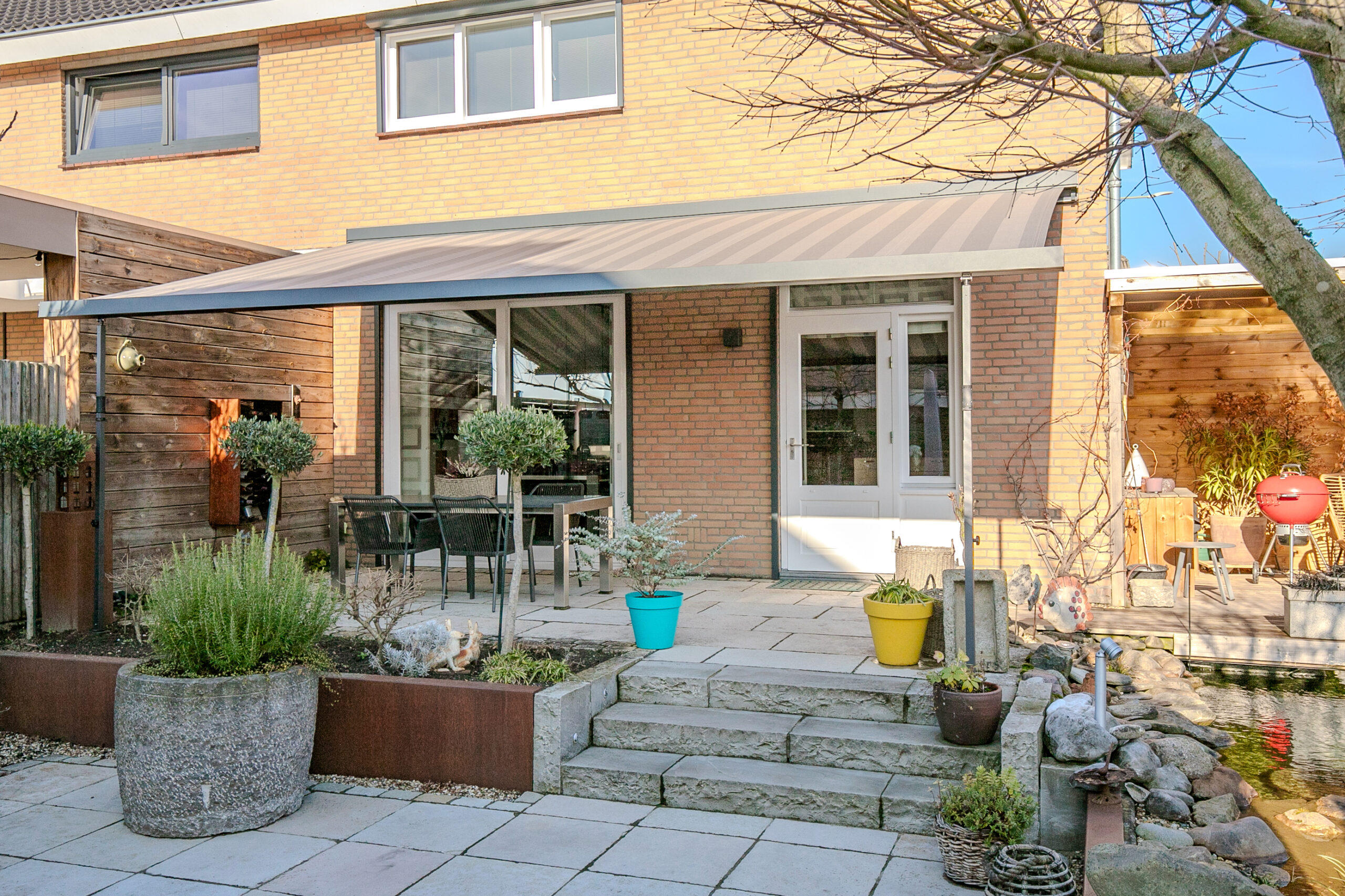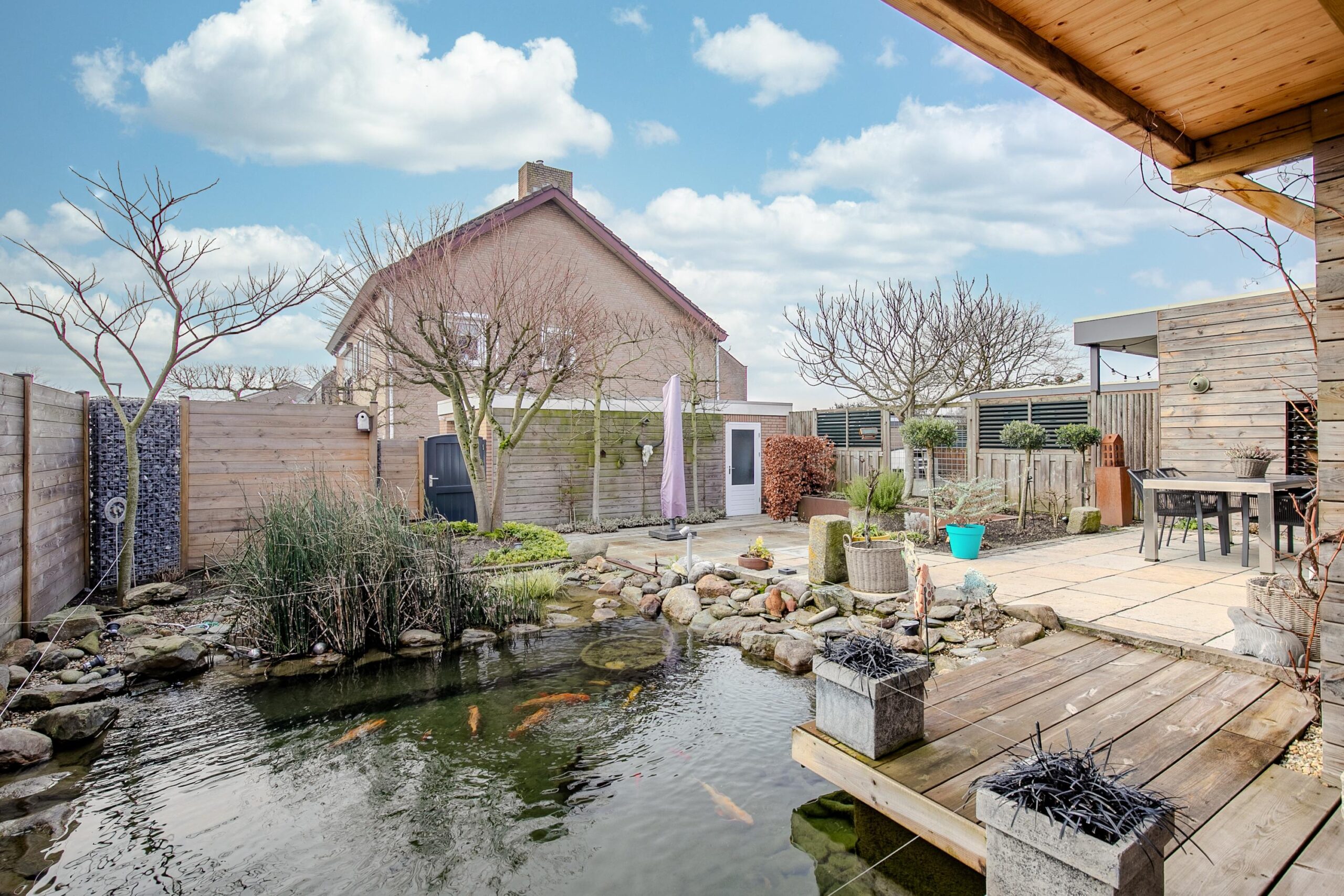 De zonnige achtertuin is voorzien van een ruim terras, vijverpartij en houten overkapping met vlonder waar u heerlijk kunt vertoeven. De tuin is recentelijk voorzien van een nieuwe erfafscheiding wat zorgt voor optimale privacy, en tevens voorzien van een nieuw zonnescherm.