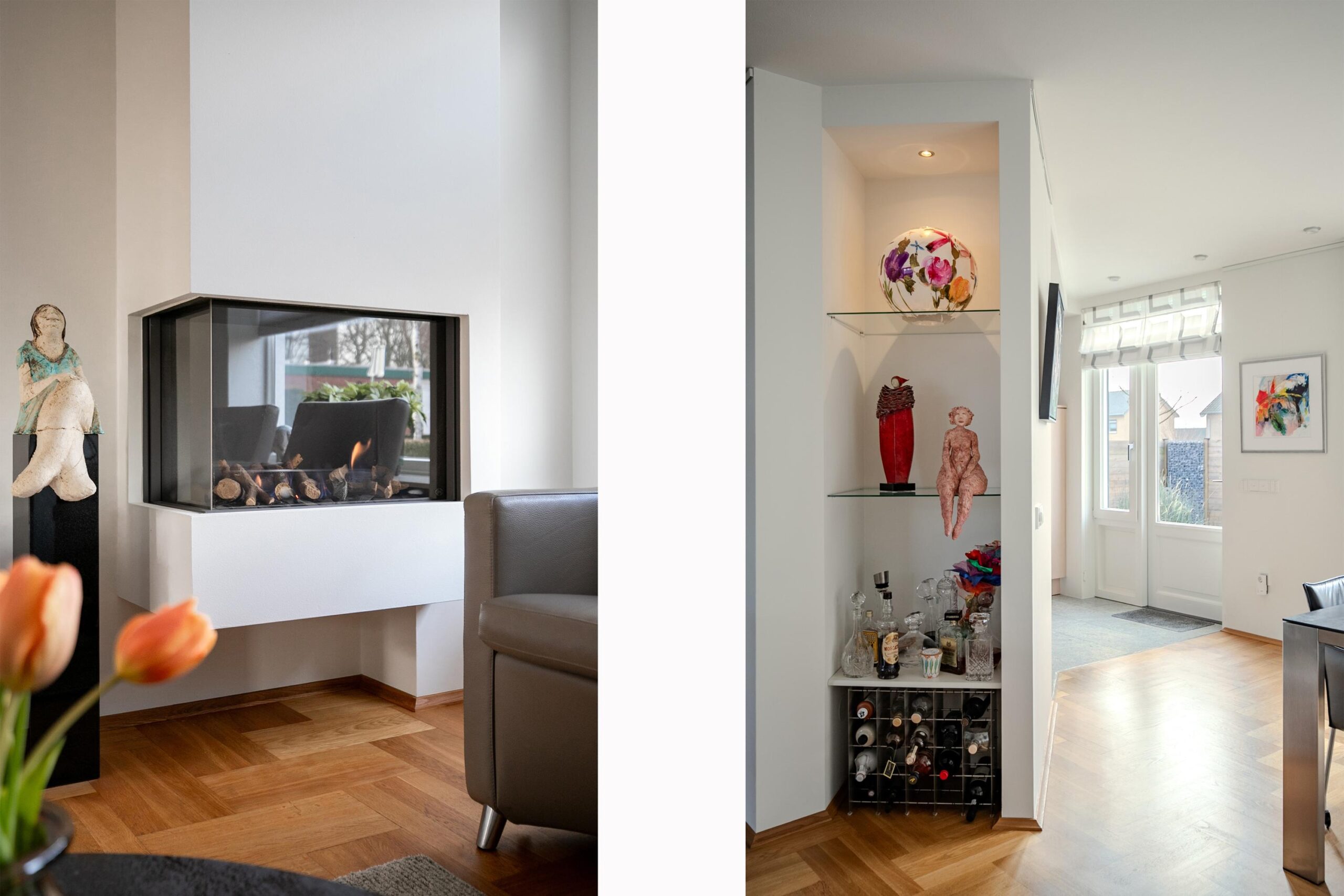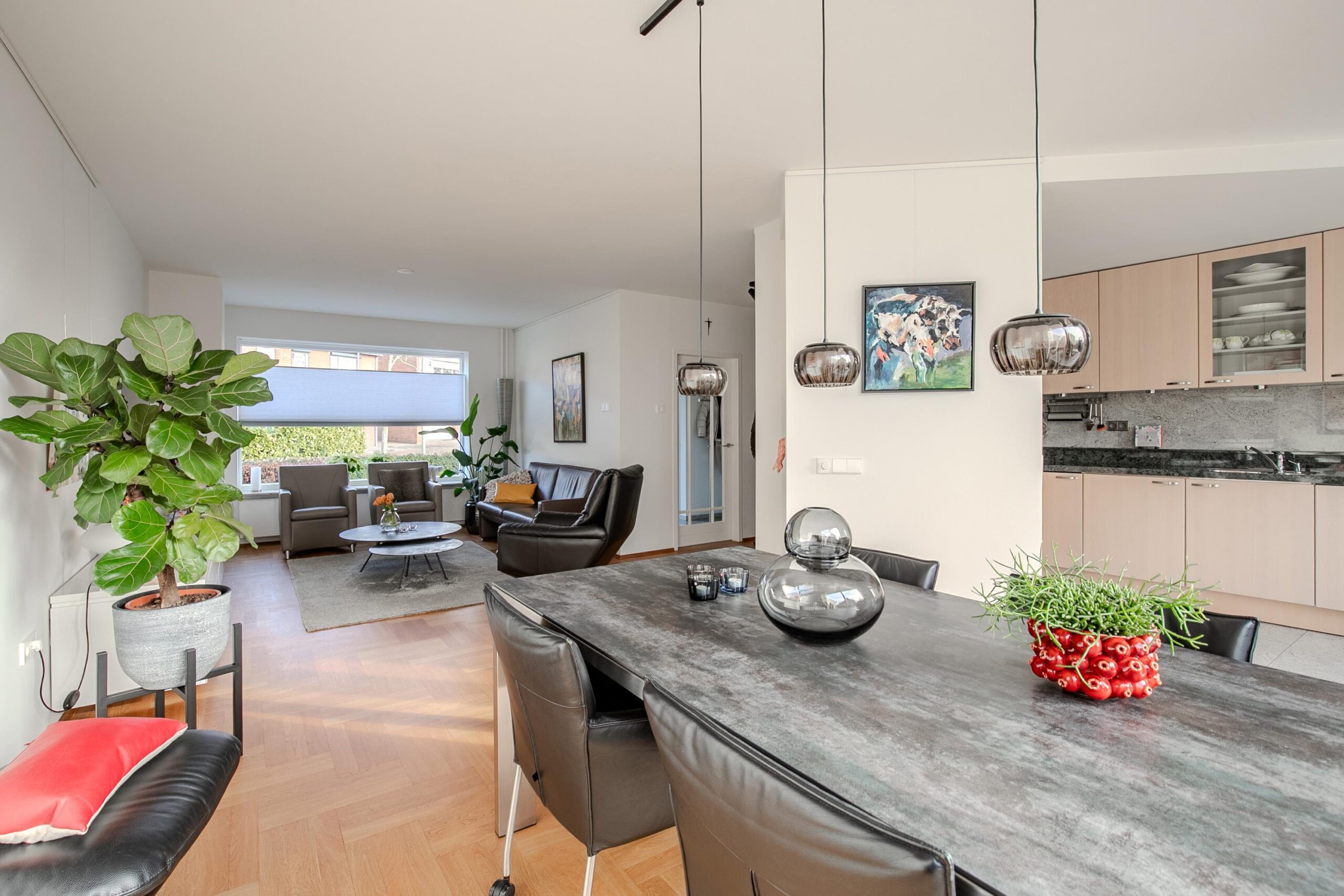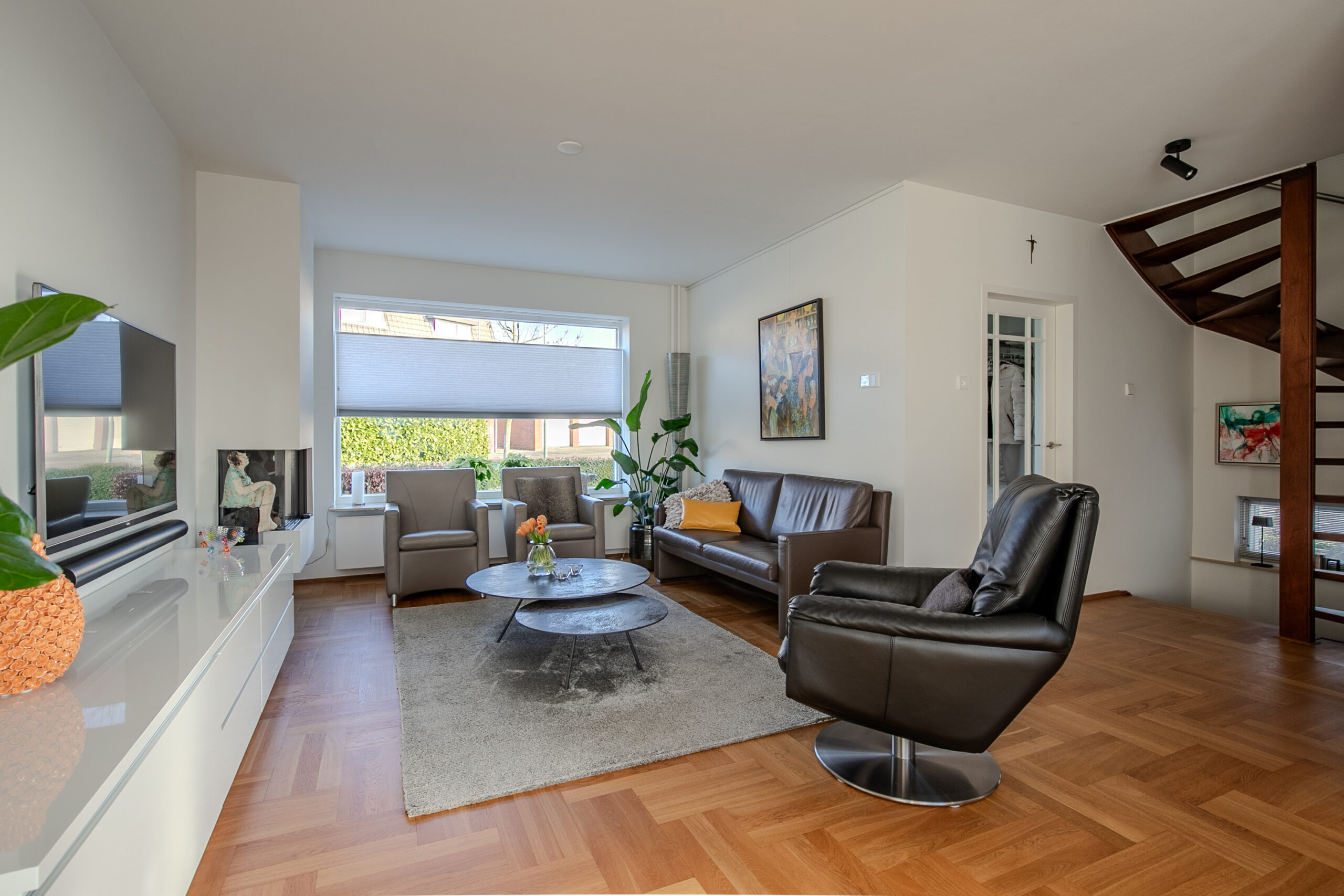 Vanuit de hal toegang tot de woonkamer met veel lichtinval, welke is voorzien van een fraaie parketvloer, sfeervolle gashaard en schuifpui naar de tuin. Half open keuken voorzien van maatwerk keukenopstelling met granieten blad en apparatuur (alle apparatuur is in resp. 2022/2023 en 2024 vervangen): oven met stoomfunctie, magnetron, indictiekookplaat met afzuigkap, koelkast en vaatwasser. Vanuit de keuken is er tevens toegang tot de fraaie en sfeervol aangelegde tuin.