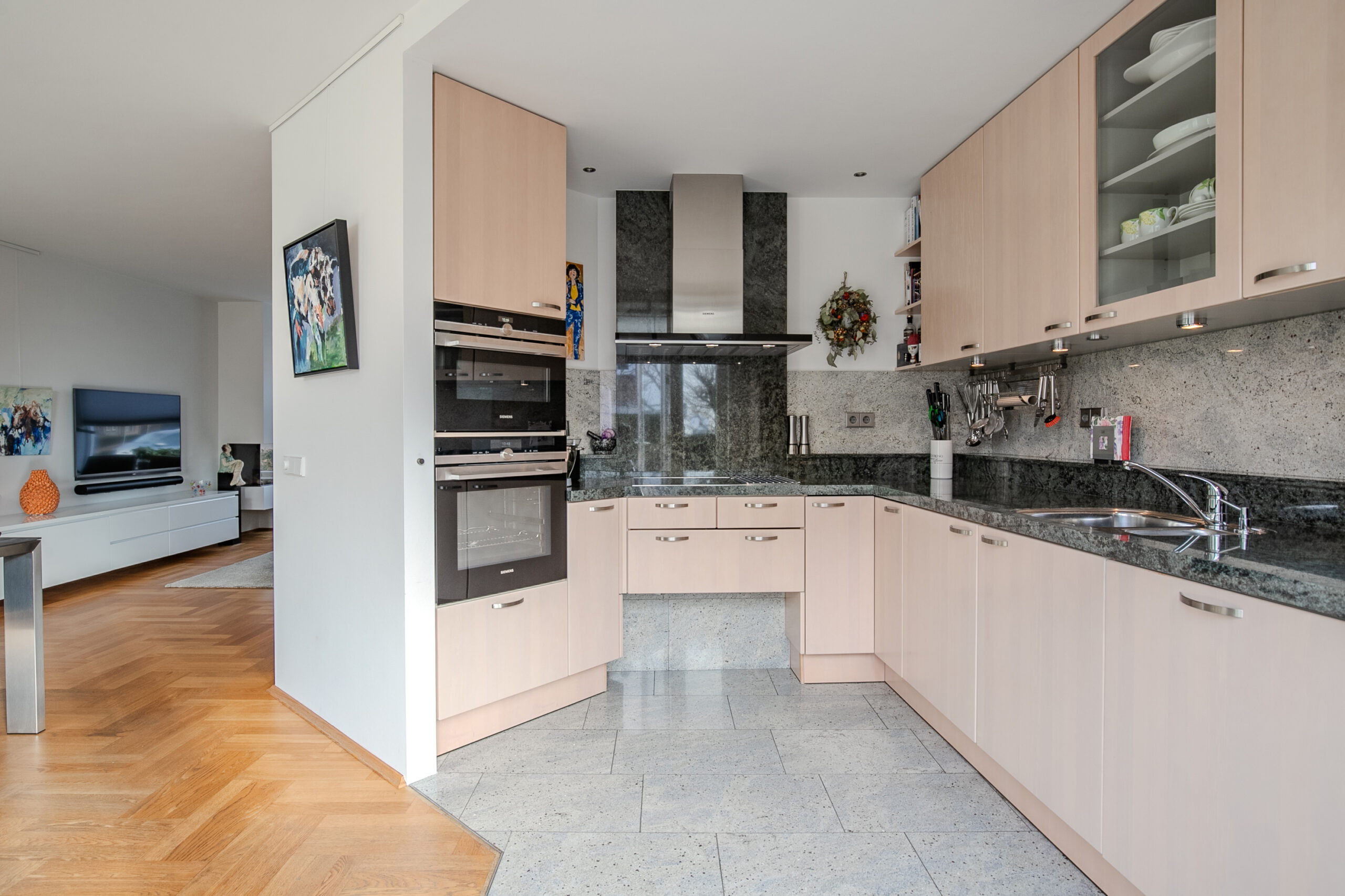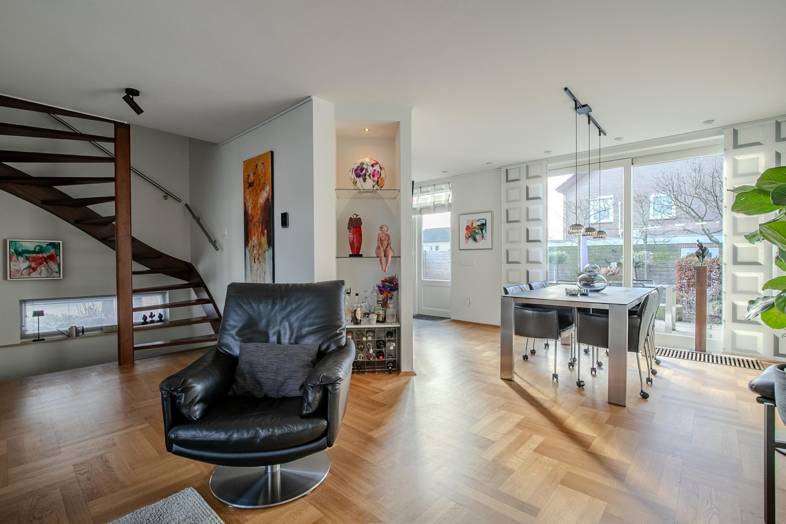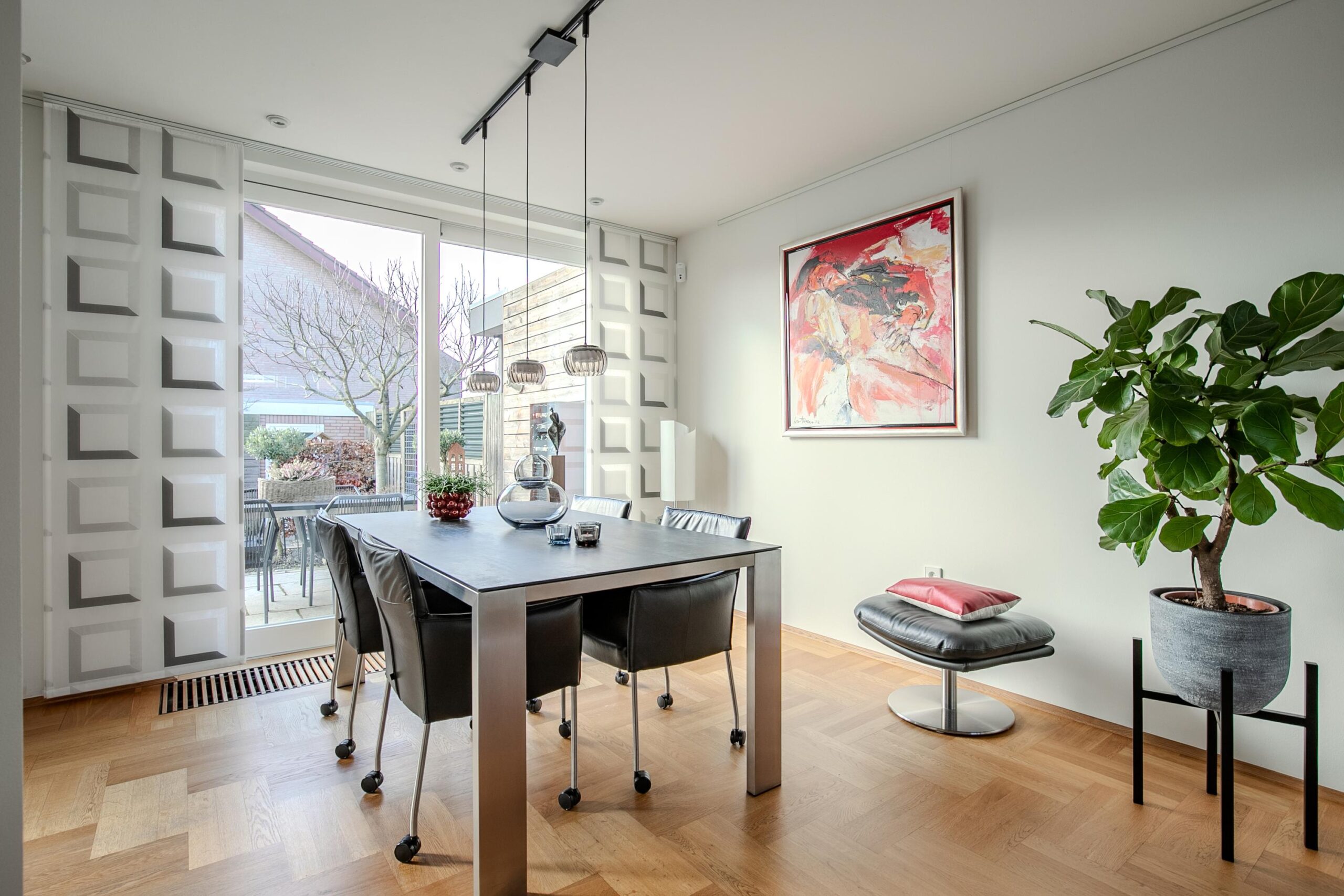 Vanuit de hal toegang tot de woonkamer met veel lichtinval, welke is voorzien van een fraaie parketvloer, sfeervolle gashaard en schuifpui naar de tuin. Half open keuken voorzien van maatwerk keukenopstelling met granieten blad en apparatuur (alle apparatuur is in resp. 2022/2023 en 2024 vervangen): oven met stoomfunctie, magnetron, indictiekookplaat met afzuigkap, koelkast en vaatwasser. Vanuit de keuken is er tevens toegang tot de fraaie en sfeervol aangelegde tuin.