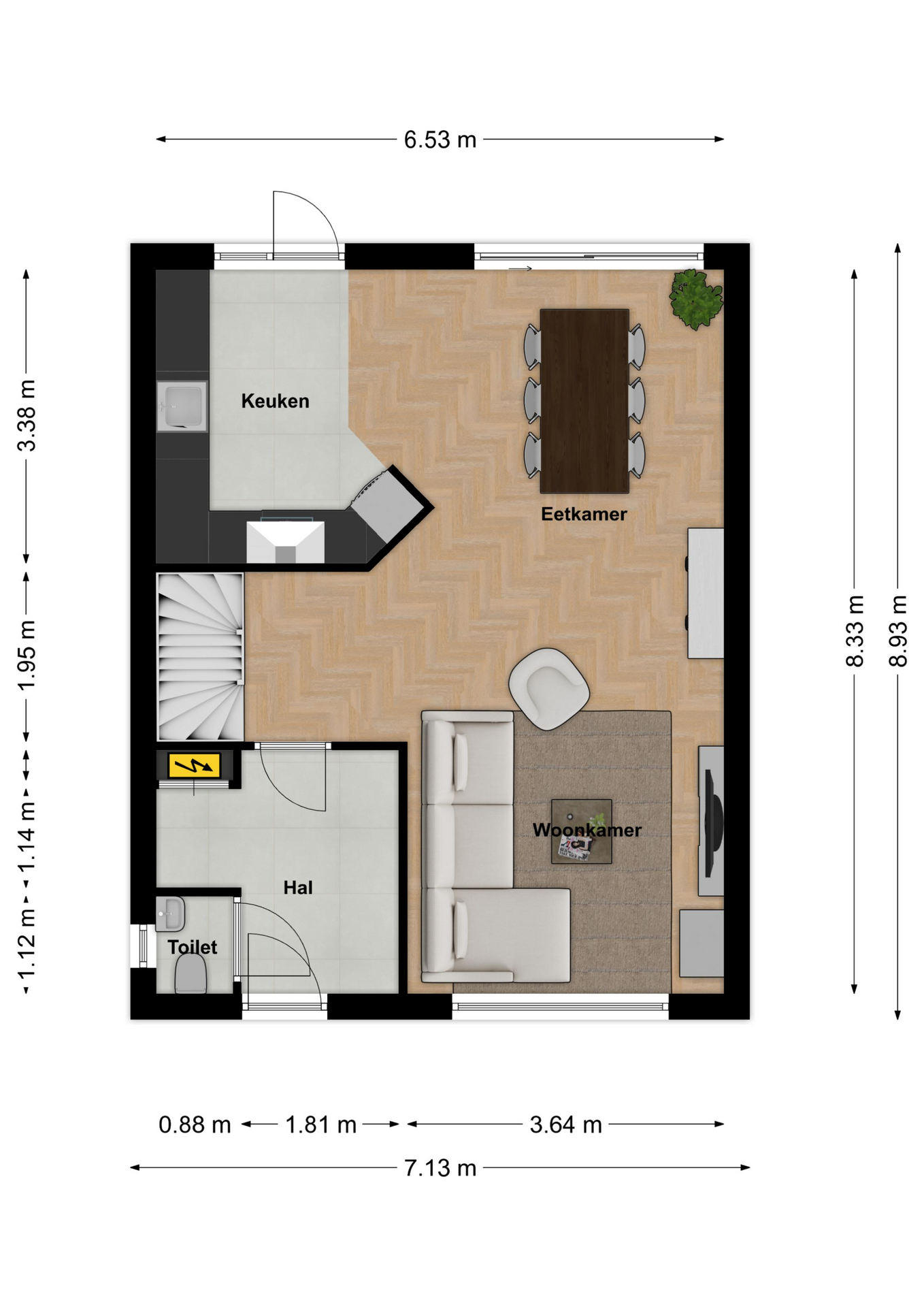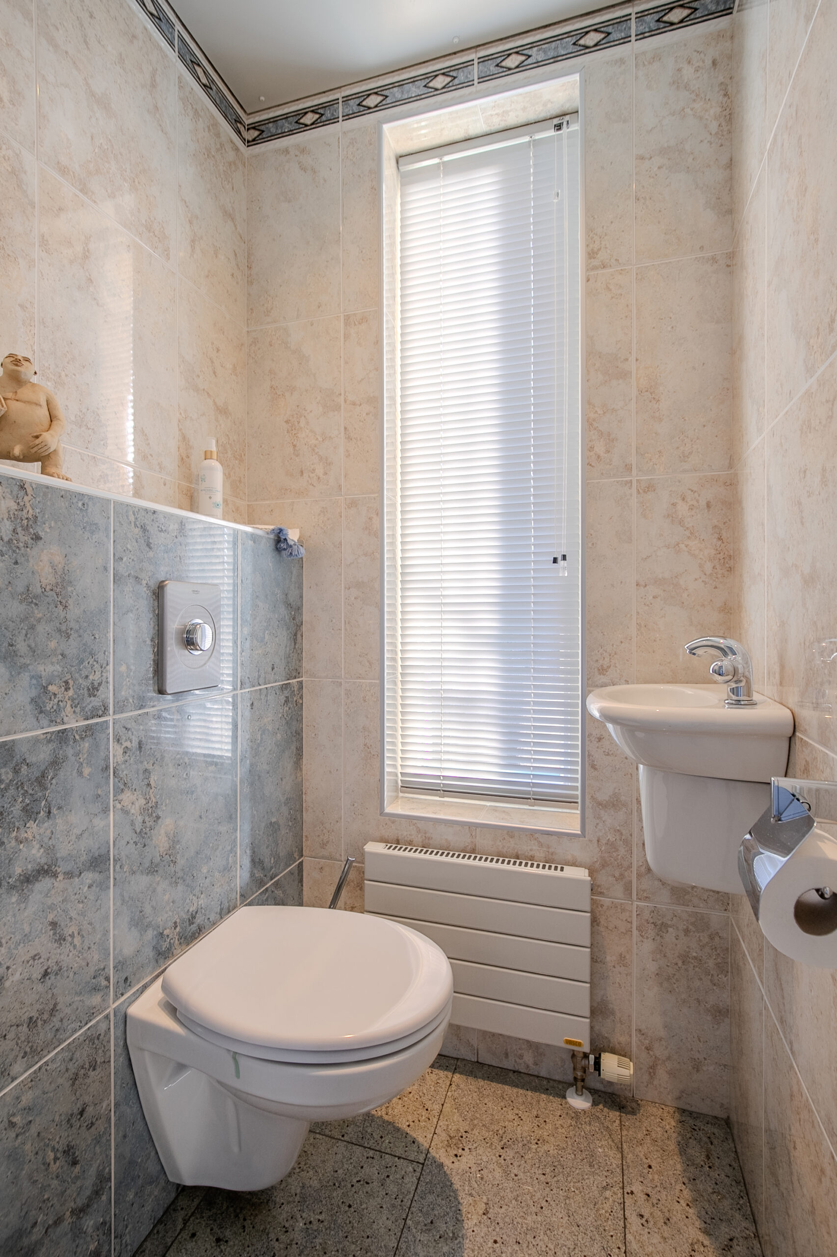 Hal/entree voorzien van plavuizenvloer met (vernieuwde en uitgebreide) meterkast. tevens bevindt zich hier de geheel betegelde toiletruimte met vrijhangend toilet en fonteintje.