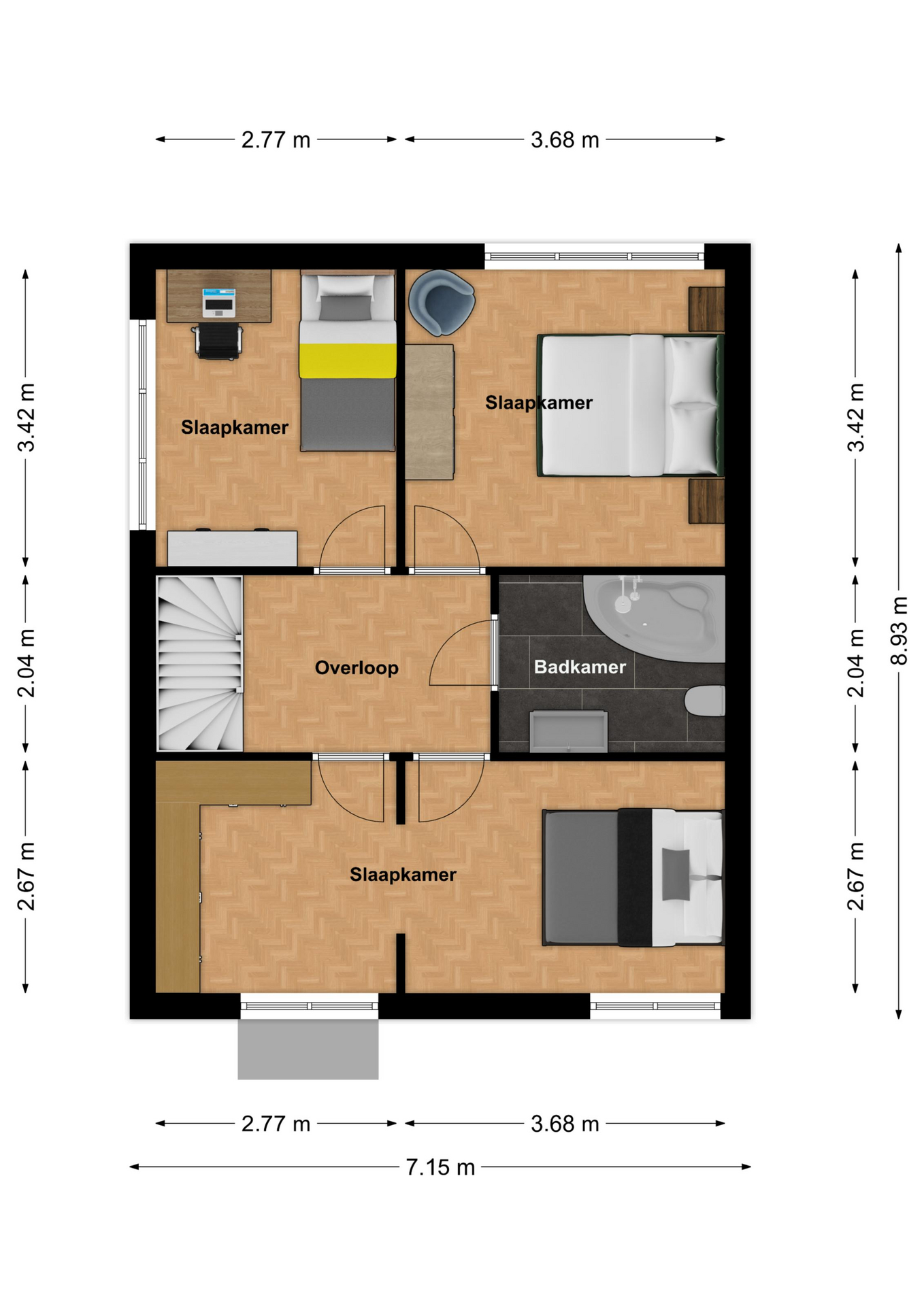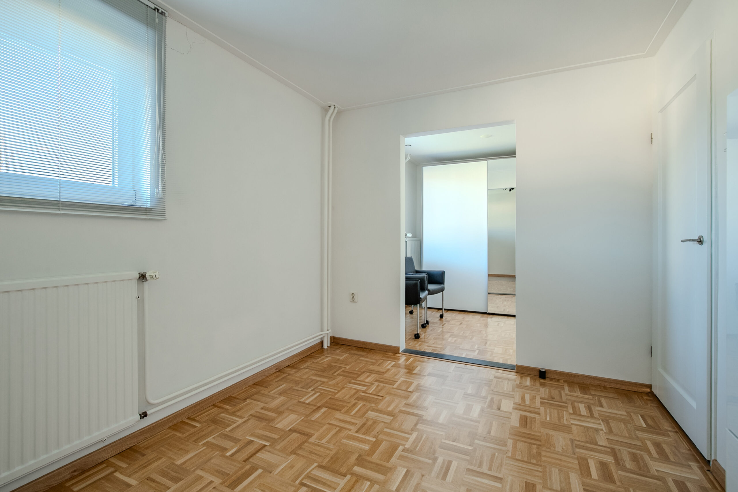 Overloop met parketvloer. Slaapkamers achterzijde tevens met parketvloer en elektrisch bedienbare rolluiken. De grotendeels betegelde badkamer is voorzien van een ligbad met whirlpool en douche met massagestralen, toilet en badmeubel met spiegelkast en wastafel. 2 Slaapkamers gelegen aan de achterzijde waar een handige doorloop is gemaakt om een walk in closet te realiseren. Dit kan door een eenvoudige ingreep ook weer ongedaan gemaakt worden. Slaap -/ werkkamer voorzien van rolluiken. Alle slaapkamers zijn voorzien van parketvloer.