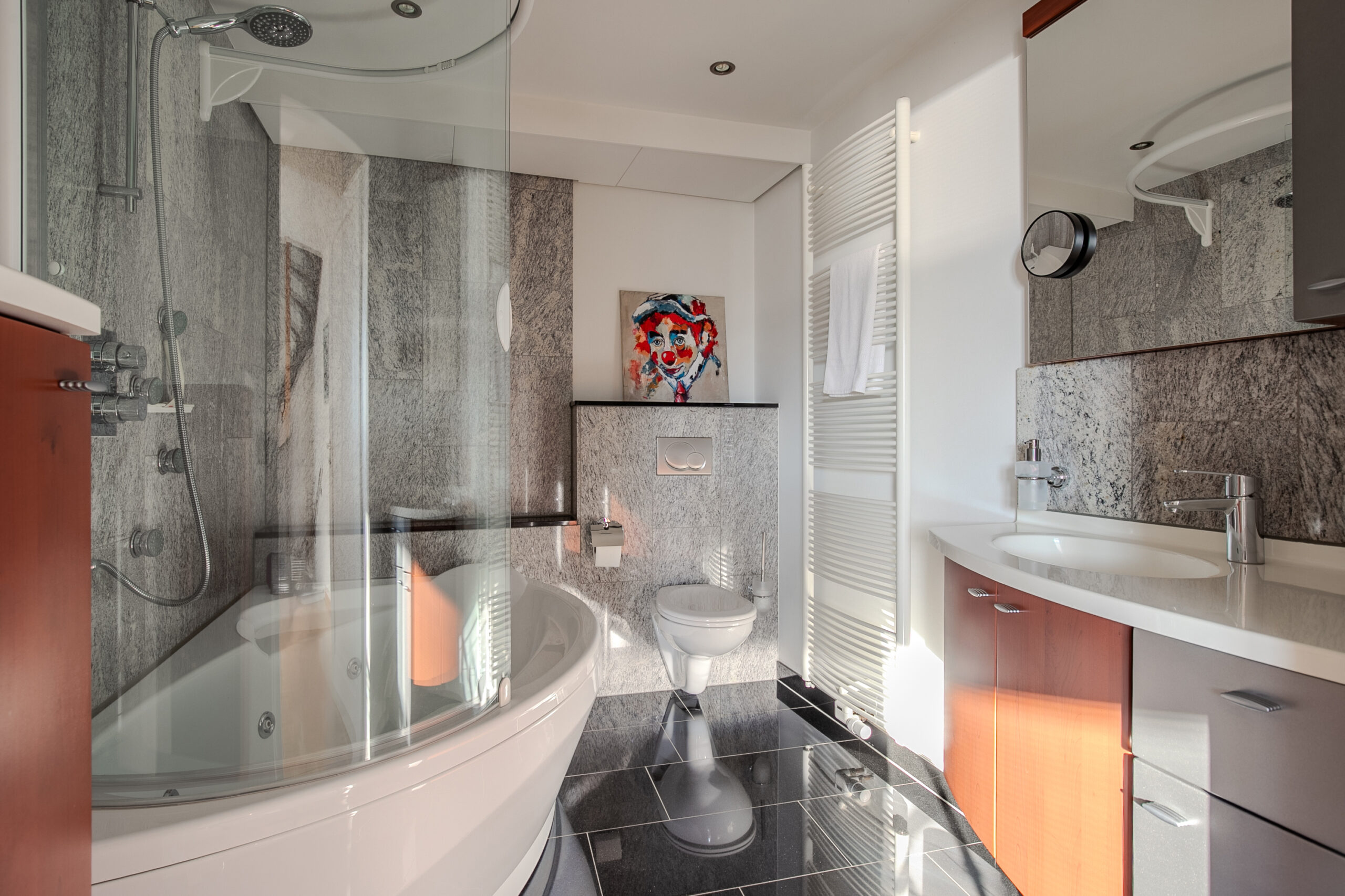 - Badkamervoorzieningen Ligbad, toilet, wastafelmeubel, whirlpool