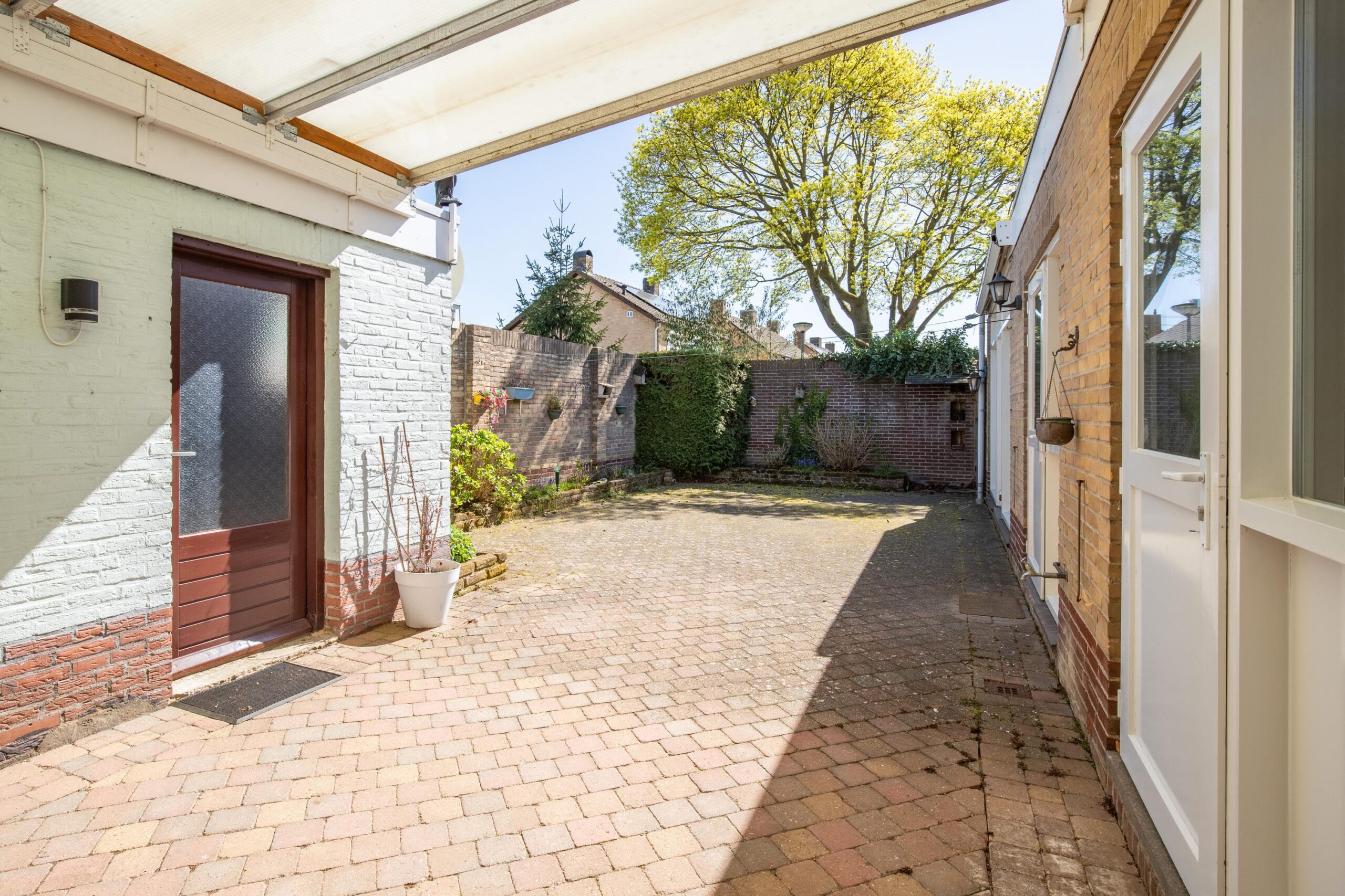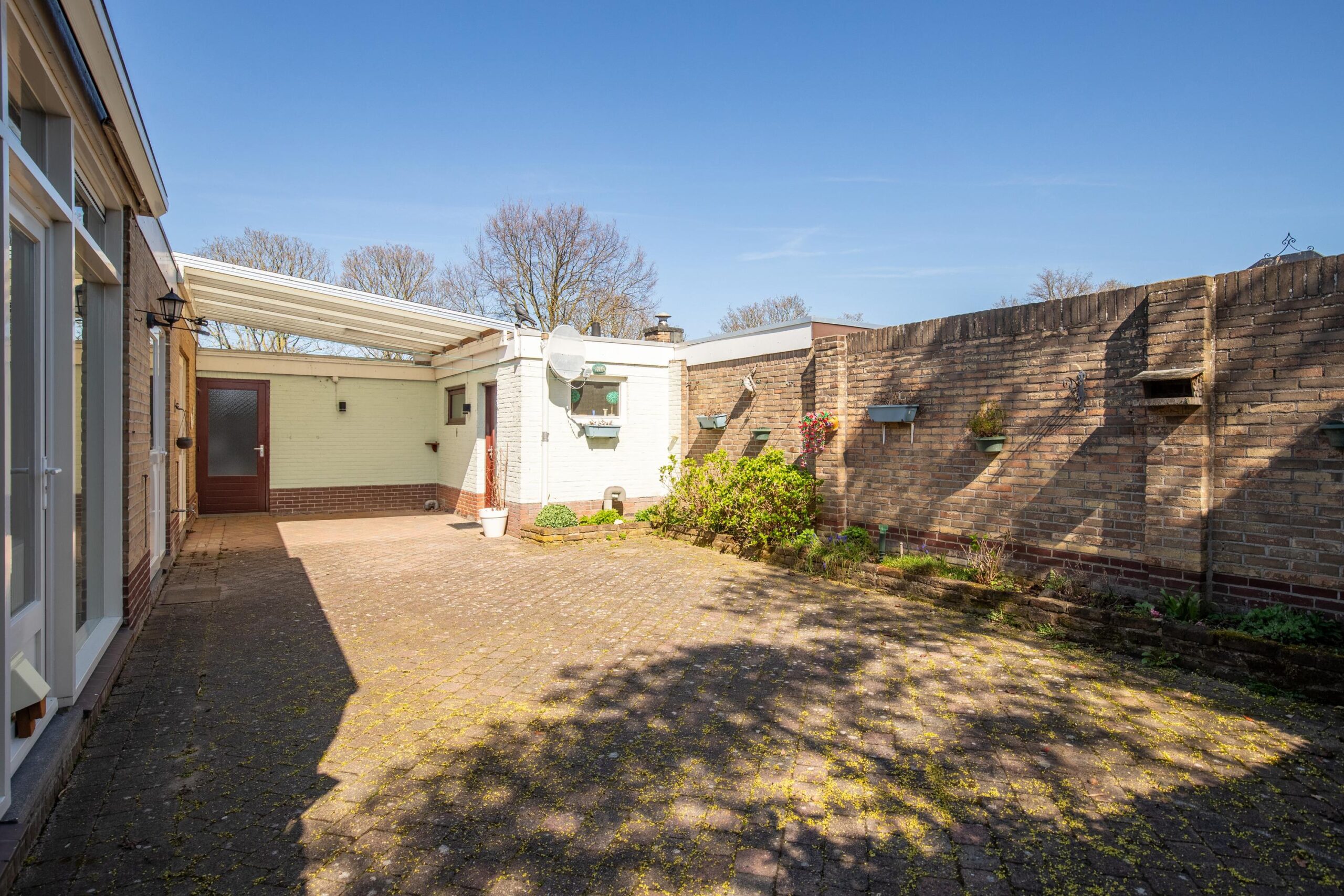 Deze tuin is onderhoudsvriendelijk en heeft een terrasoverkapping 15m². Er is een gemetselde berging 14m²met hierin de combi c.v. (Remeha eigendom, bouwjaar onbekend) en de aansluitpunten voor wasapparatuur. Vanuit de overkapping is er toegang tot de garage 15m².