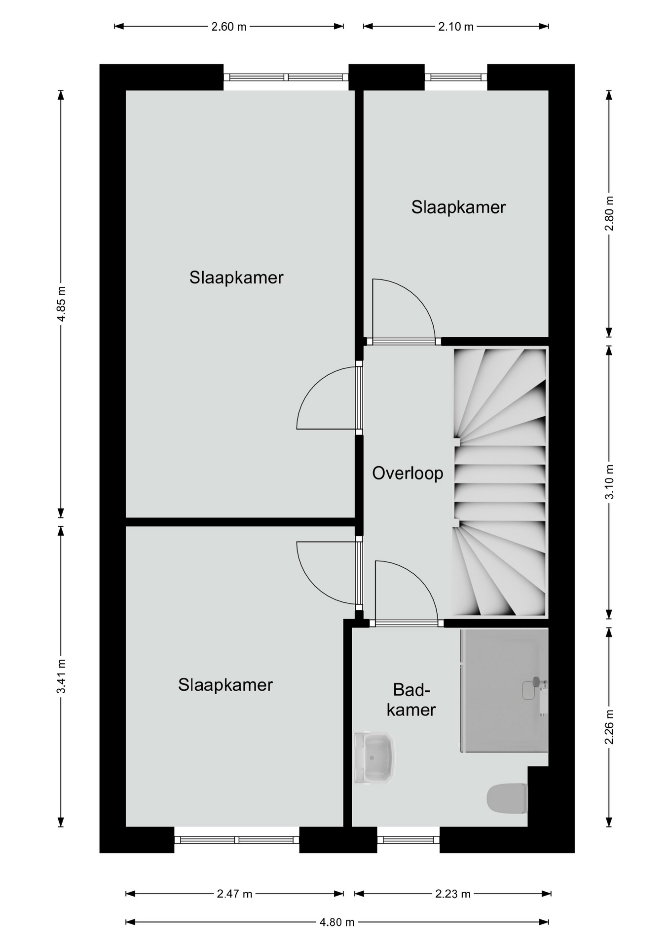 Overloop met toegang tot 3 slaapkamers, respectievelijk 4.85 x 2.60, 3.40 x 2.47 en 2.80 x 2.10. Deels betegelde, moderne badkamer met douchecabine, wastafelmeubel en toilet.