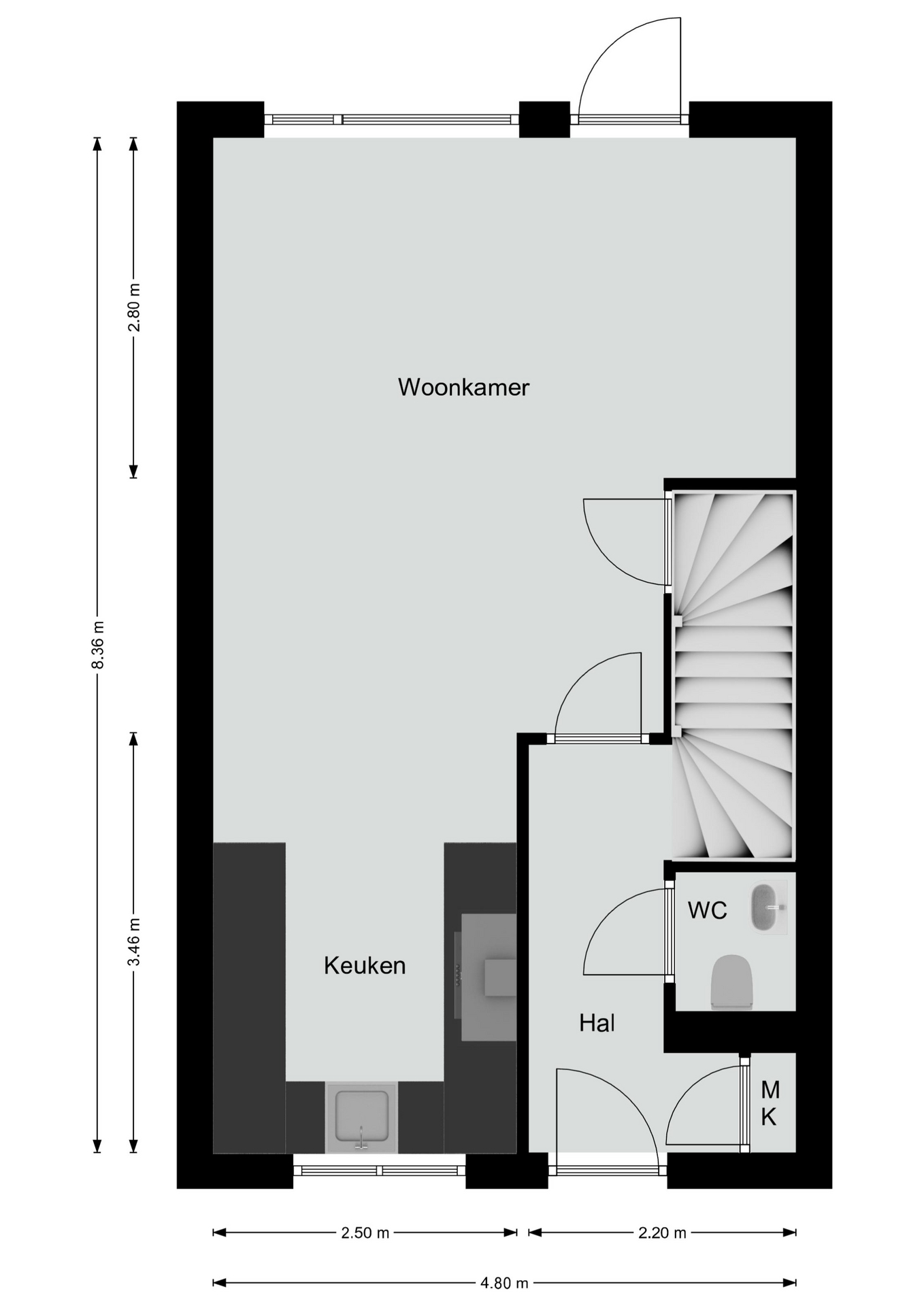 Hal met meterkast. Deels betegelde toiletruimte met zwevend toilet en fonteintje. Aan de voorzijde van het huis is de luxe keuken gesitueerd. Deze beschikt over een greeploze installatie met inbouwapparatuur: 5-pits gaskookplaat, afzuigkap, koelkast en inbouwoven. De woonkamer heeft een handige bergkast en biedt fijn tuincontact. Totale oppervlakte woonkamer en keuken bedraagt circa 30 m². De begane grond vloer is voorzien van vloerverwarming.