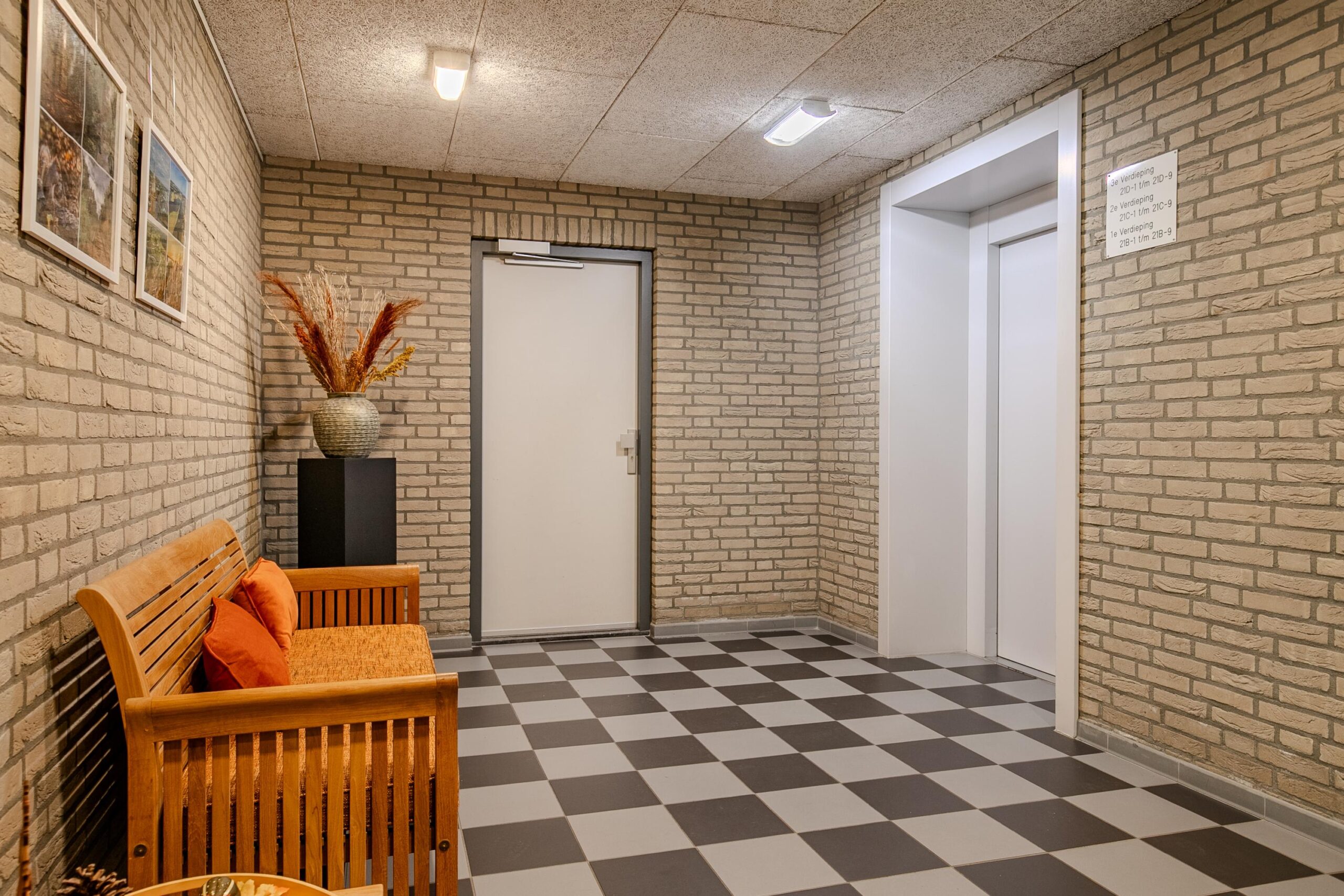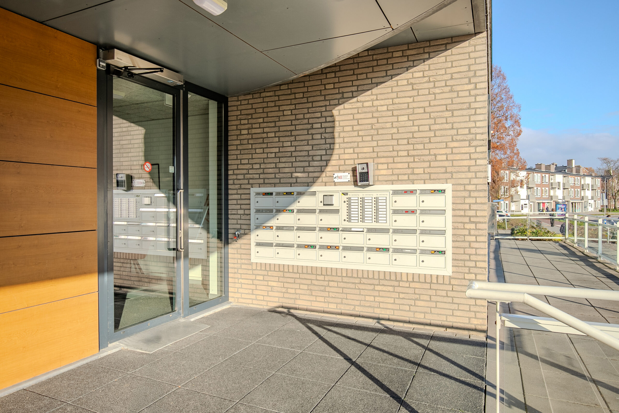 De centrale, afgesloten entree beschikt over een video-intercom systeem. Hier bevinden zich ook de brievenbussen. De voordeur geeft toegang tot de algemene ruimte, het trappenhuis en de liftinstallatie.
