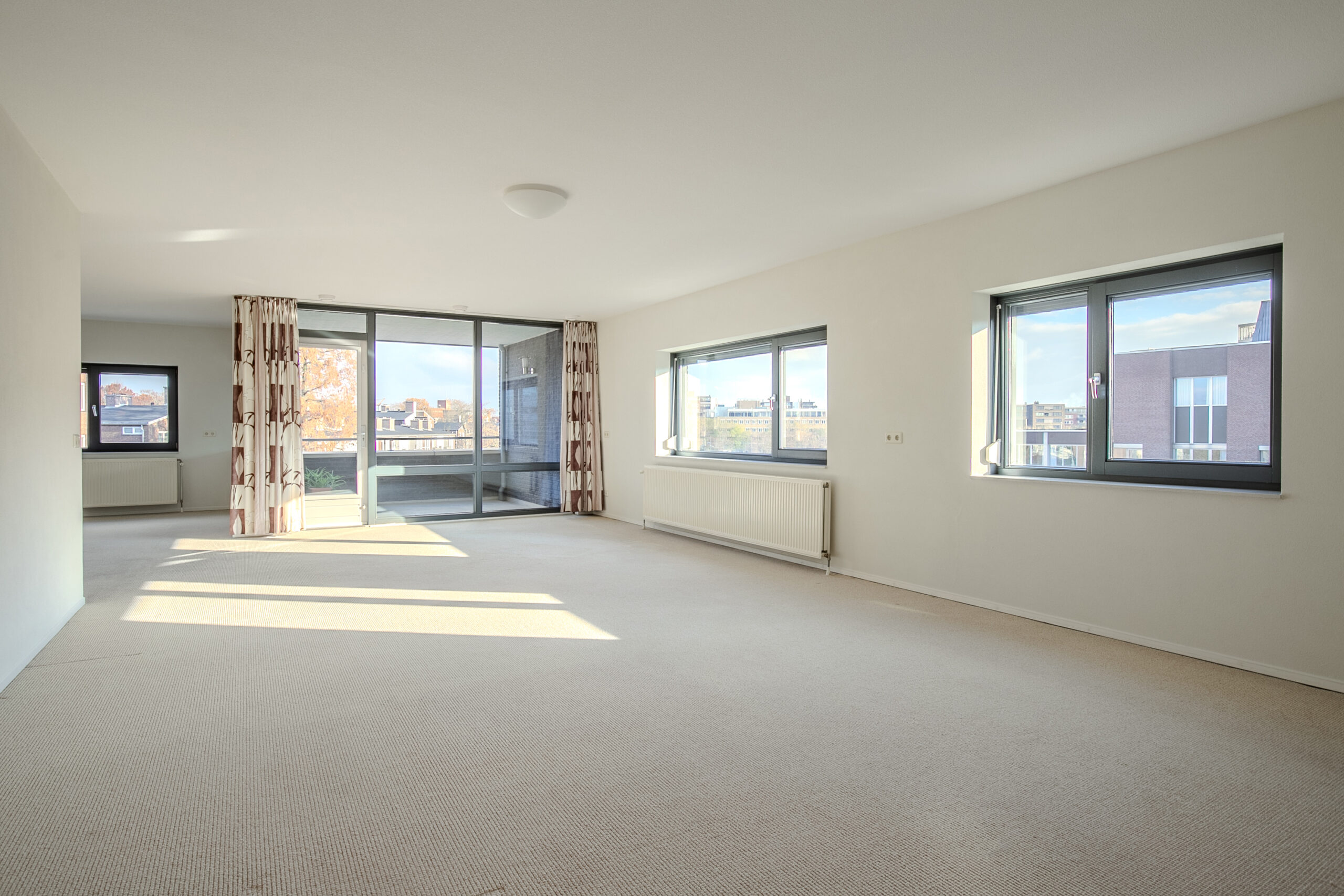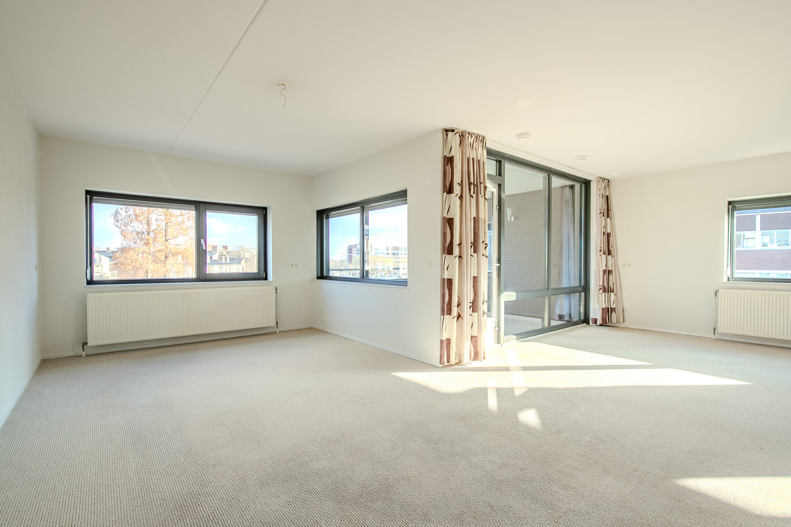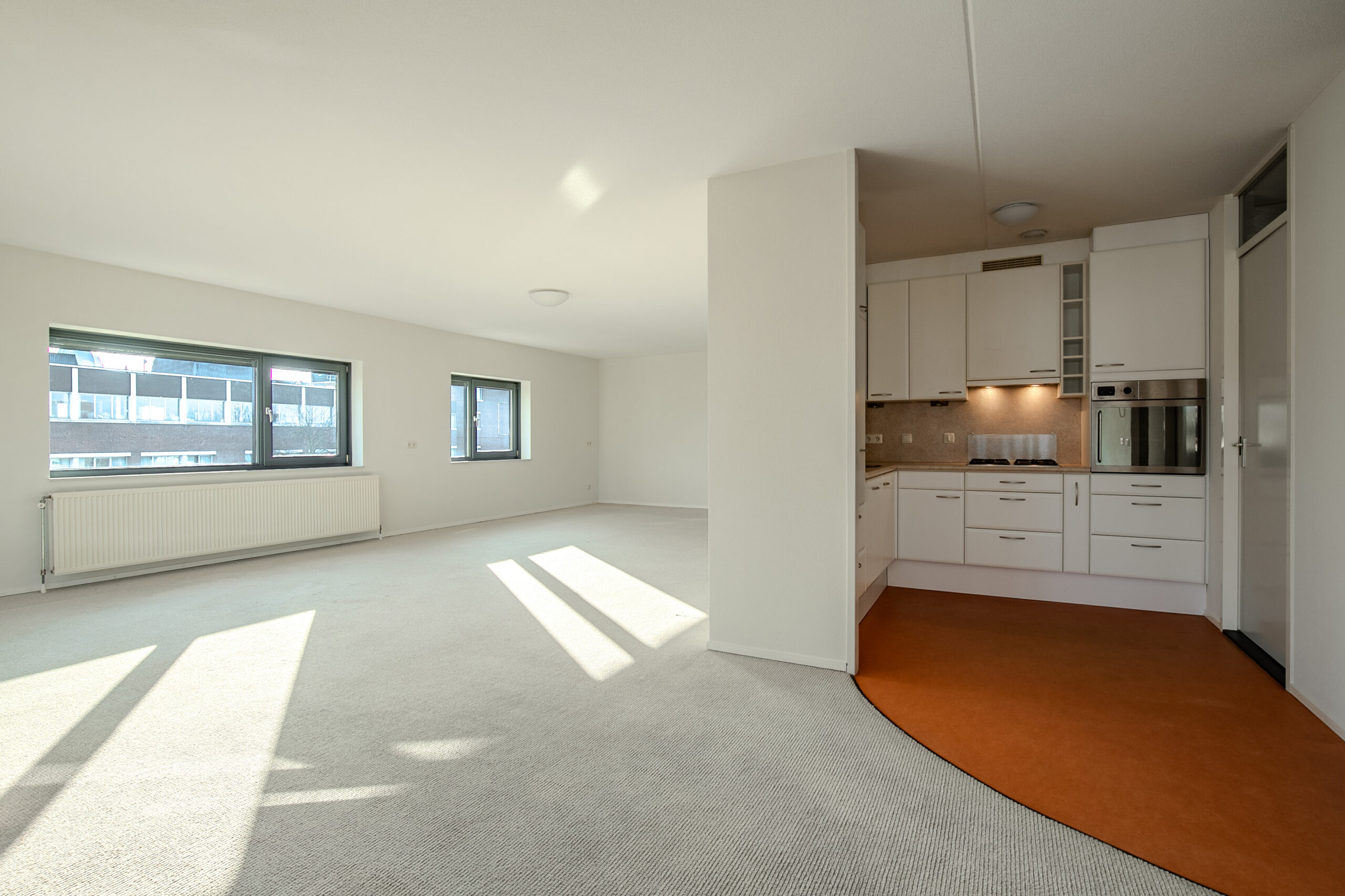 De entree van het appartement wordt onder andere gevormd door een hal met meterkast en een betegelde toiletruimte met zwevend toilet en fonteintje. We lopen door naar de woonkamer. Hier valt direct op hoe aangenaam royaal en licht deze woonkamer is. Dit is te danken aan de grote raampartijen. Hierdoor is er mooi zicht op buiten en komt er bovendien lekker veel daglicht binnen. Op de vloer ligt een vloerbedekking. Dit gecombineerd met neutraal afgewerkte wanden, geeft het geheel een neutrale basis, waar verschillende woonstijlen toepasbaar zijn.