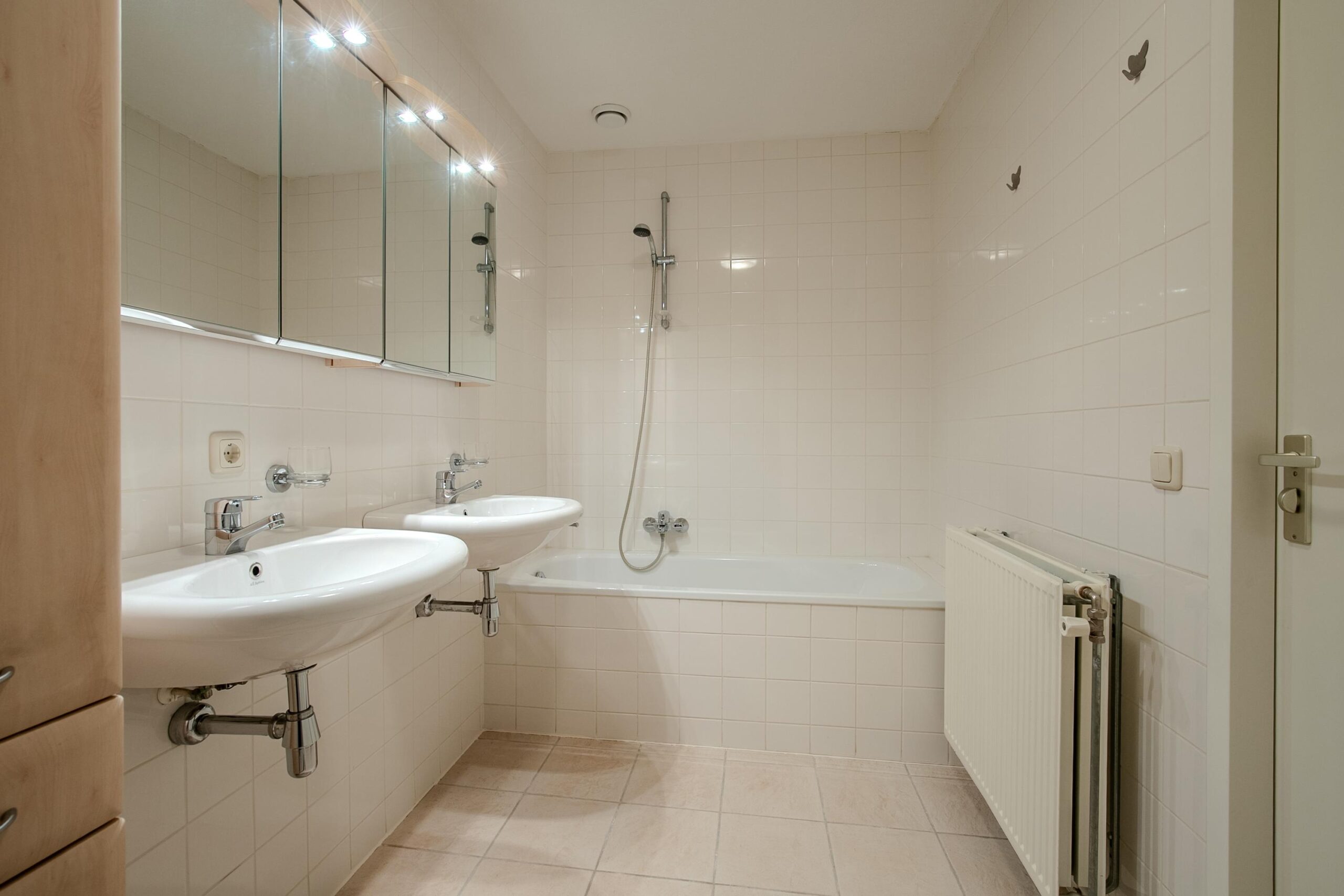 Zoals verwacht, voldoet ook de ruime badkamer volledig aan de wensen van deze tijd. De ruimte is netjes betegeld in een neutrale kleurstelling en compleet ingericht met: een ligbad, inloopdouche, en een dubbele wastafel.