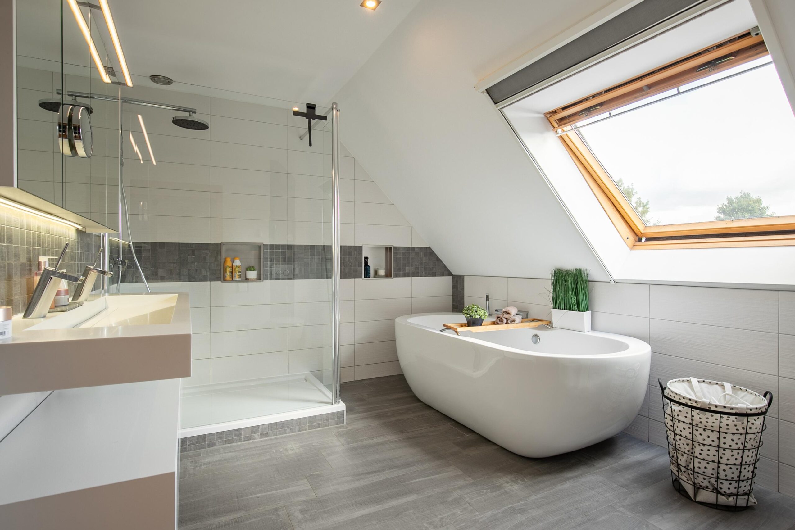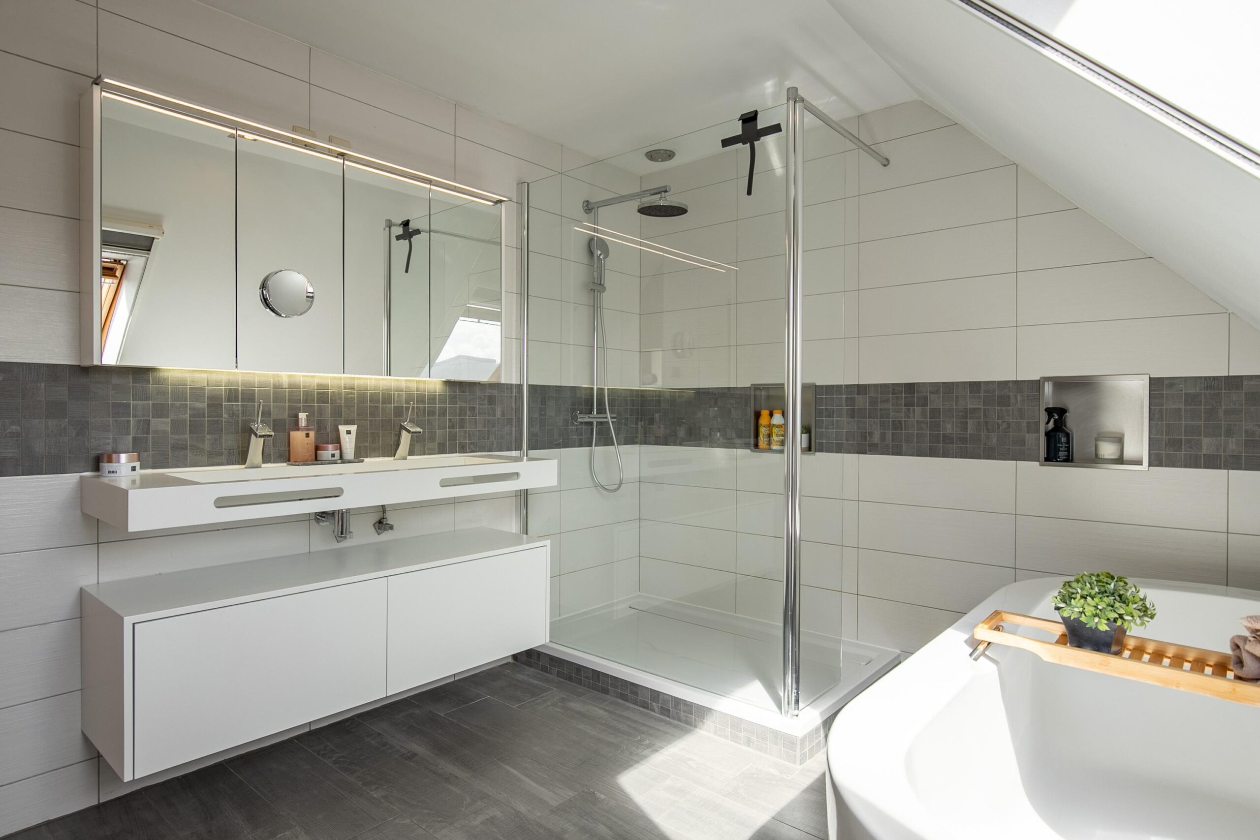 De ruime betegelde badkamer heeft een grote inloopdouche met glazen wand en regendouchefunctie, dubbele wastafel met meubel en spiegelkast, zwevend toilet en vrijstaand ligbad.