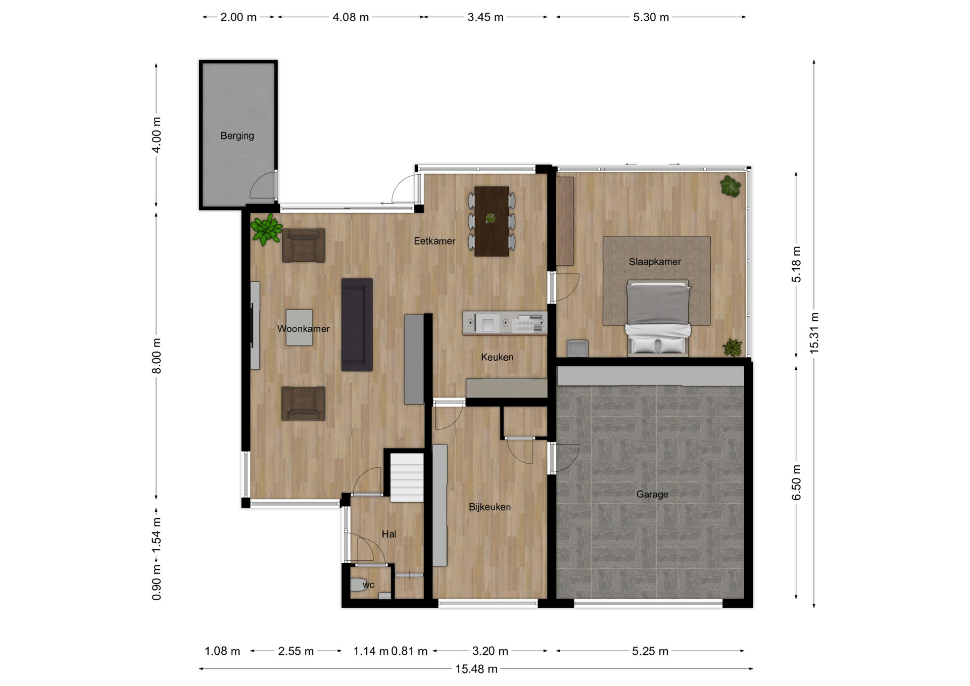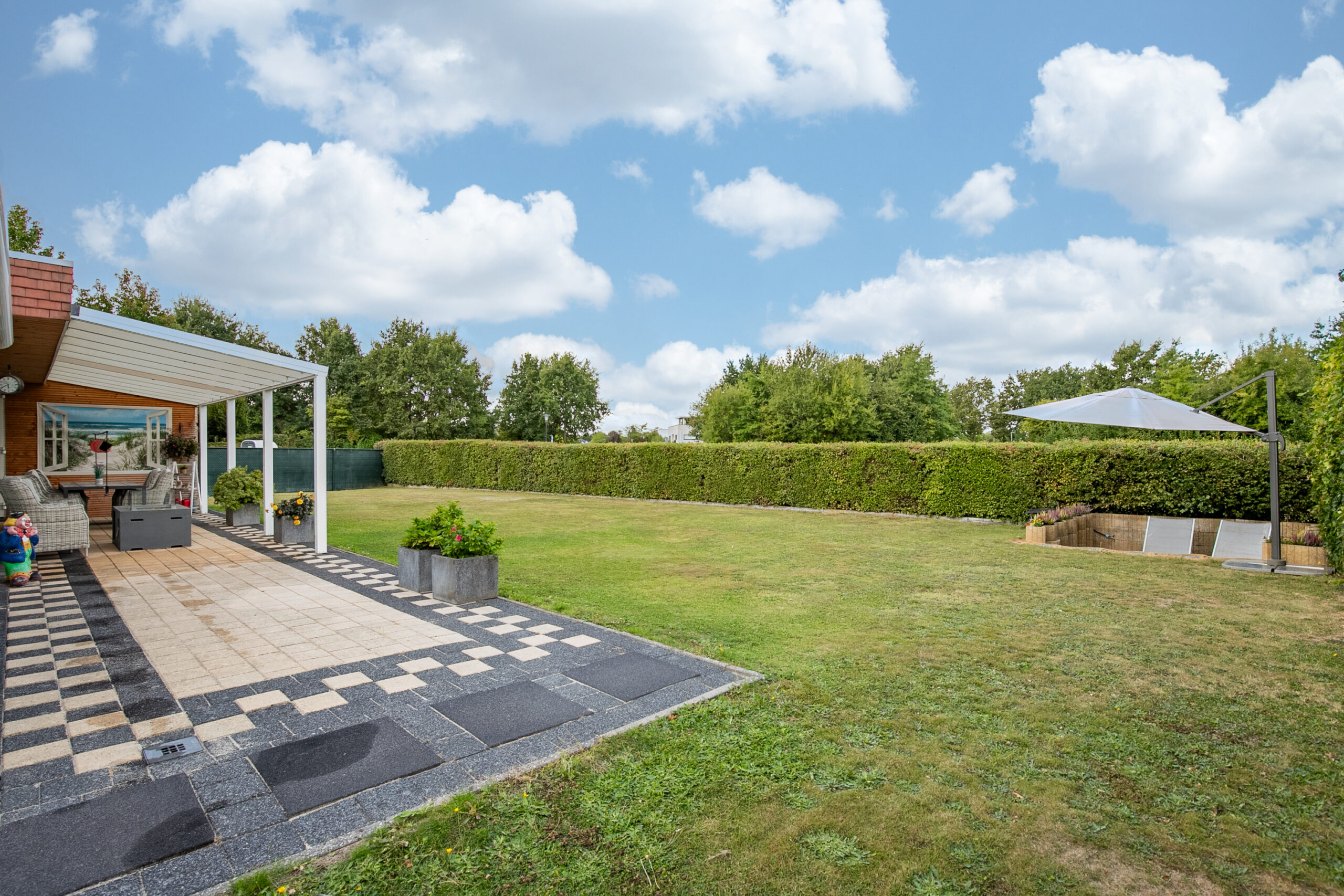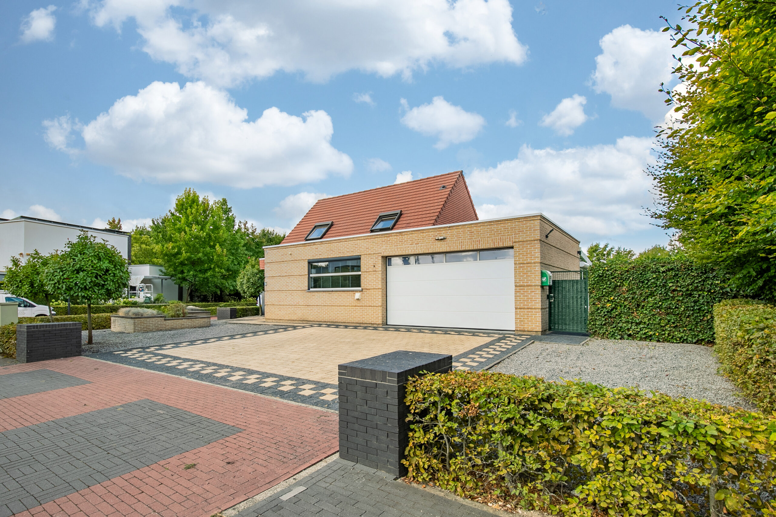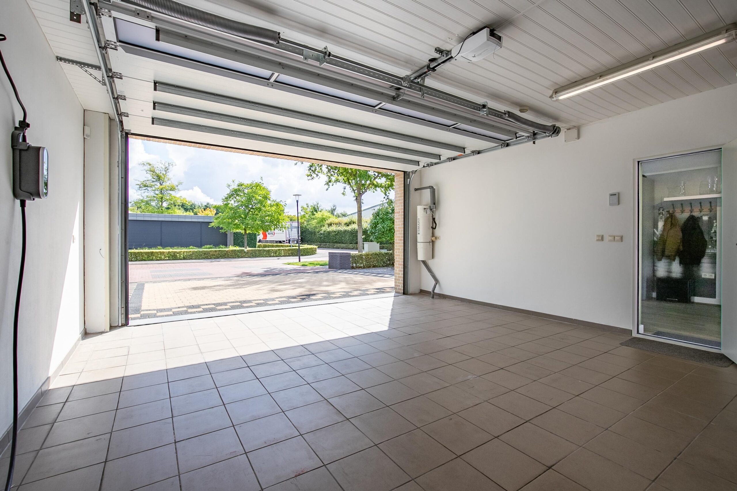 Via de keuken is de inpandige bijkeuken bereikbaar. Hier is een airconditioning aanwezig om de ruimte te verwarmen. De inpandige royale garage is ca. 34m2 groot en geheel betegeld. De garage is uitgerust met een grote elektrisch bedienbare sectionaalpoort. Tevens is hier de opstelling van het stofzuigersysteem.
