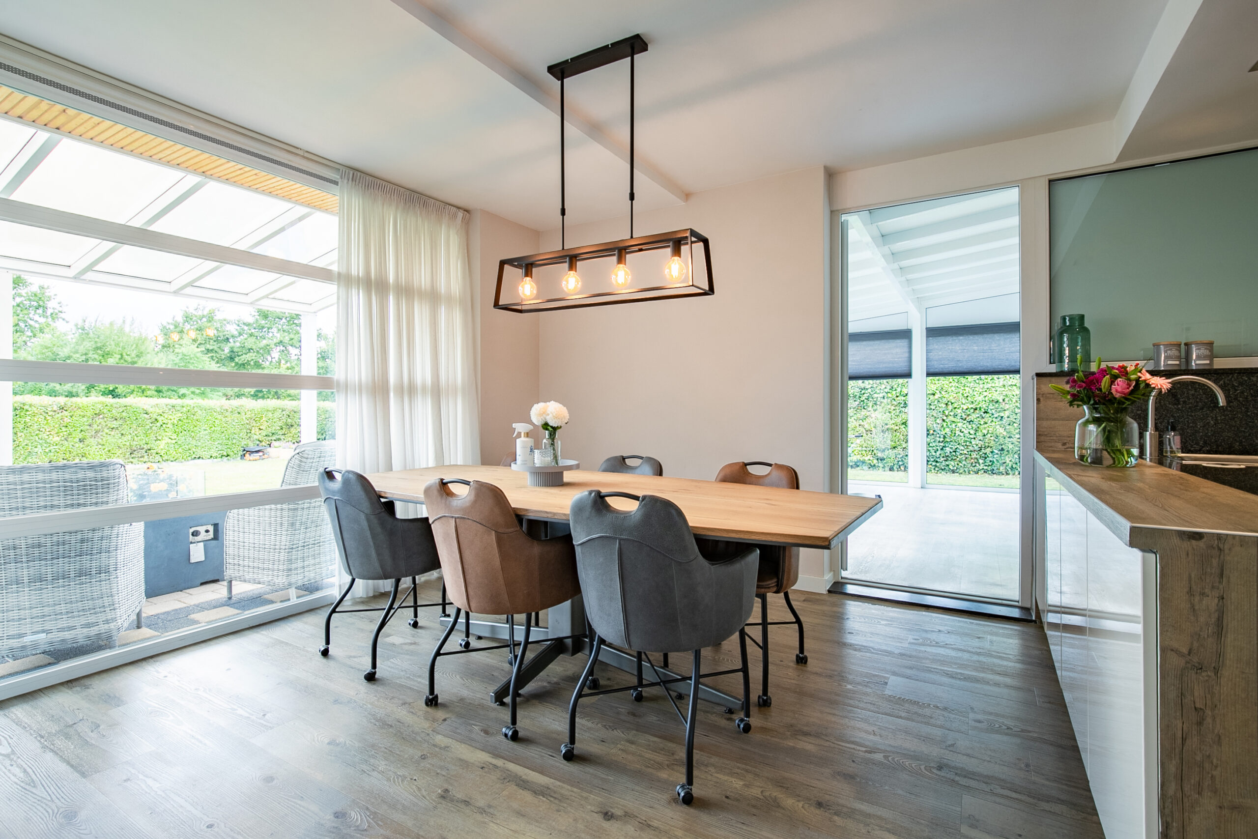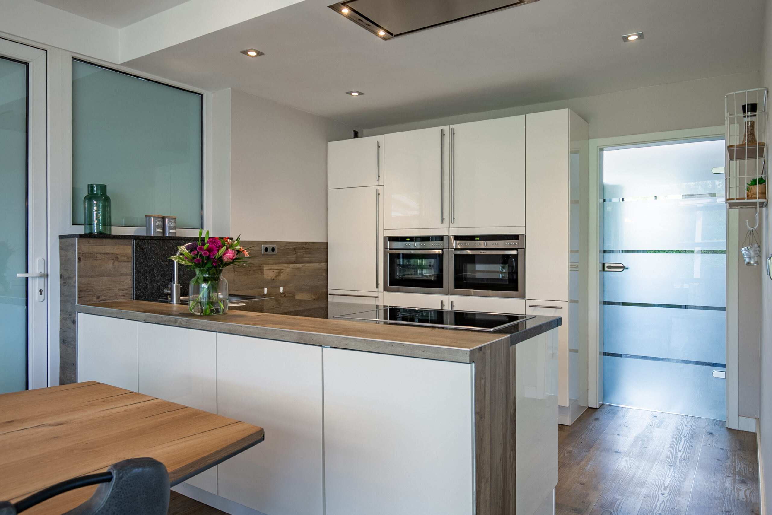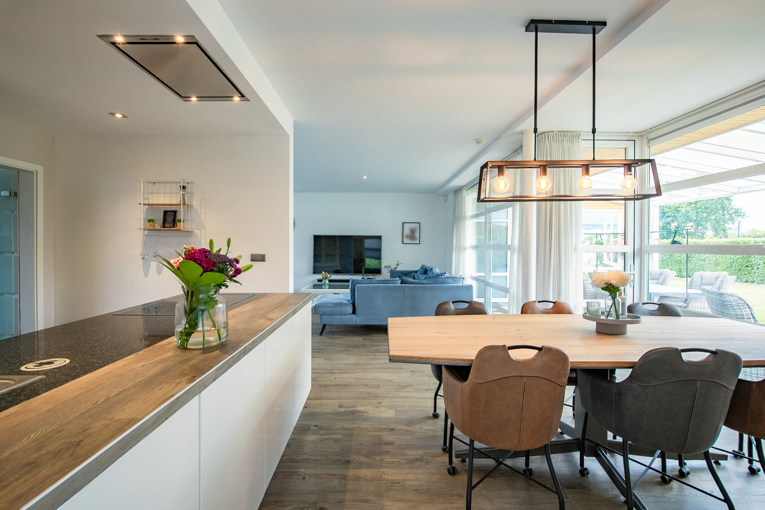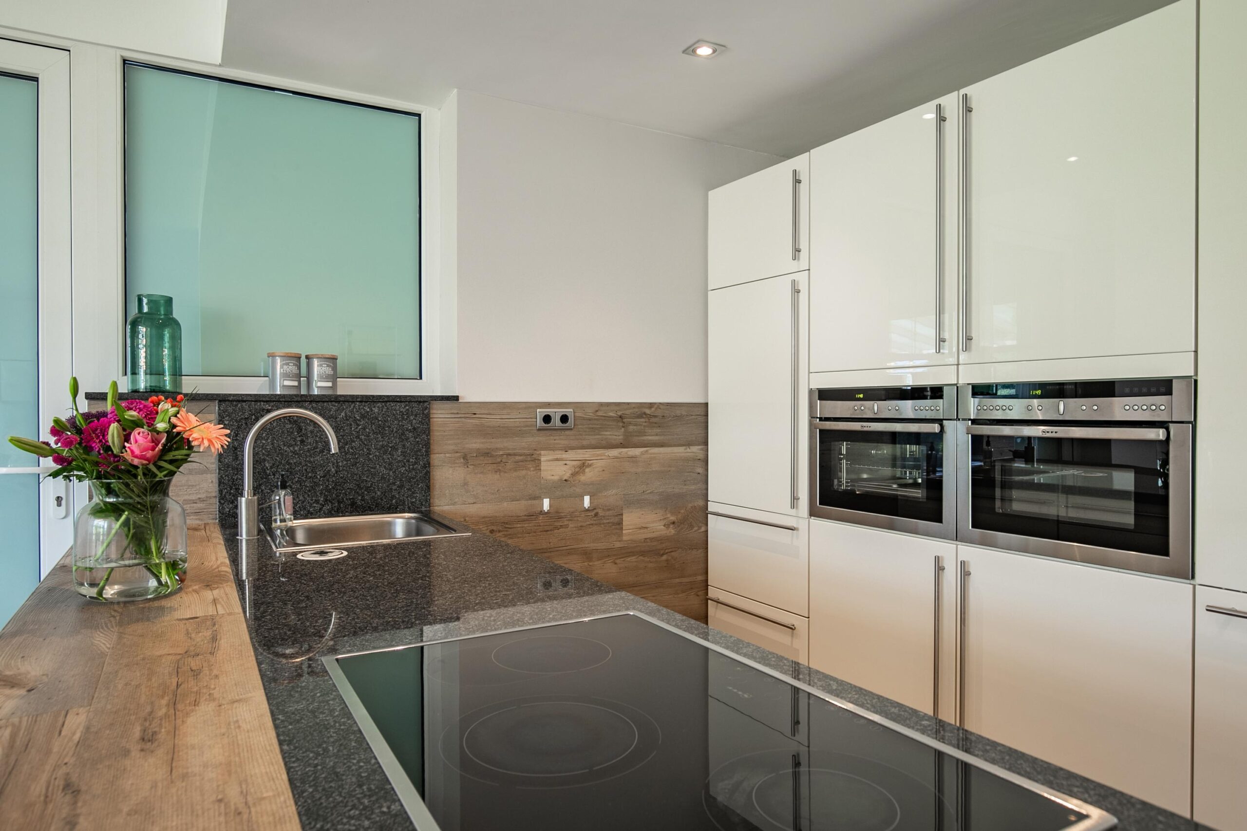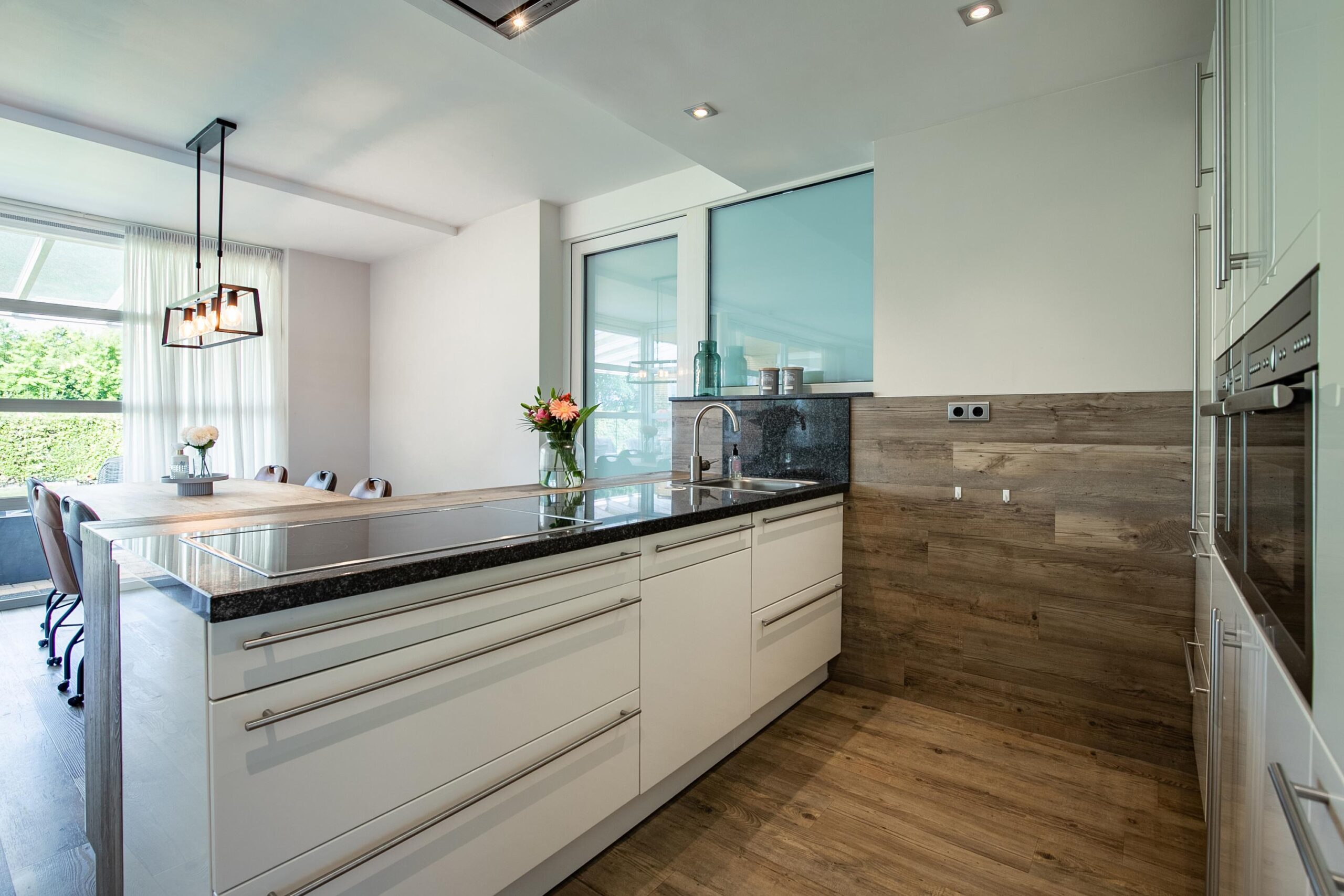 In de leefkeuken is een keuken in hoogglans uitvoering met kastenwand en kookeiland met de navolgende apparatuur: inductiekookplaat, Novy afzuigkap in het plafond verwerkt, koelkast, diepvries, vaatwasser, combi-oven en heteluchtoven.