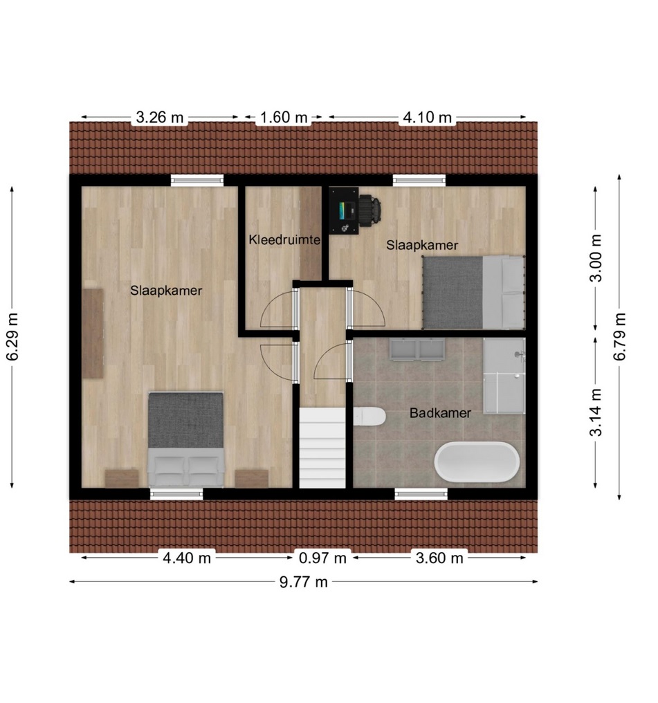Overloop met toegang naar alle vertrekken. De slaapkamers zijn respectievelijk 20m2 en 12m2 groot en beide voorzien van een laminaatvloer en Velux dakramen. Tevens is er nog een kleedruimte gesitueerd met kastenwand.