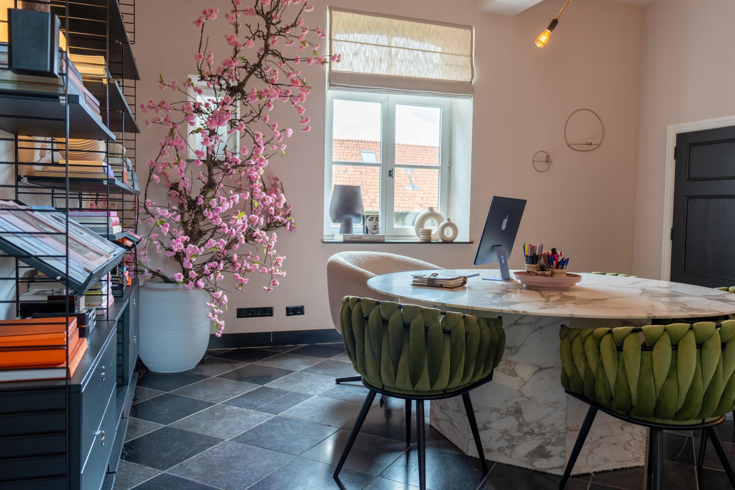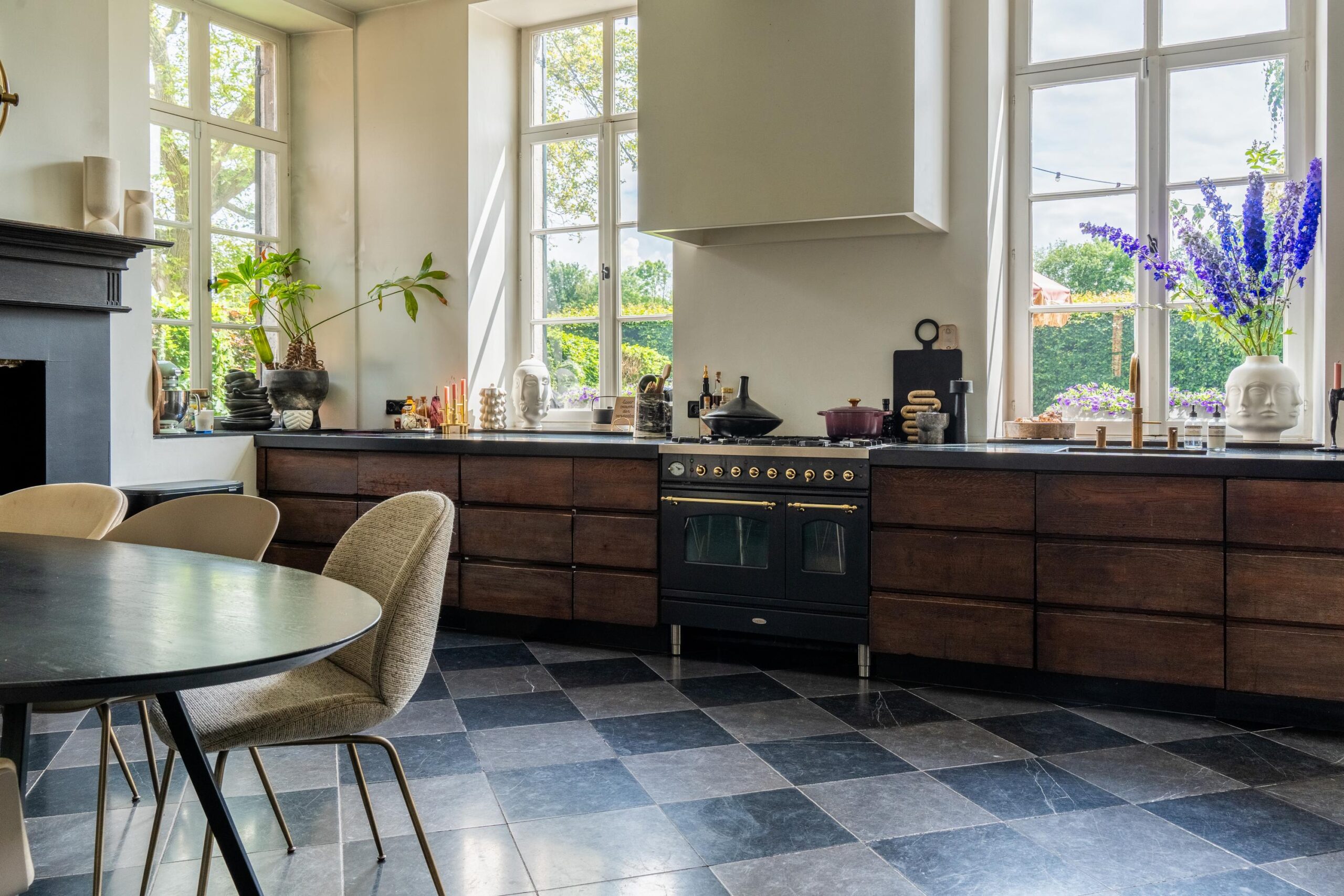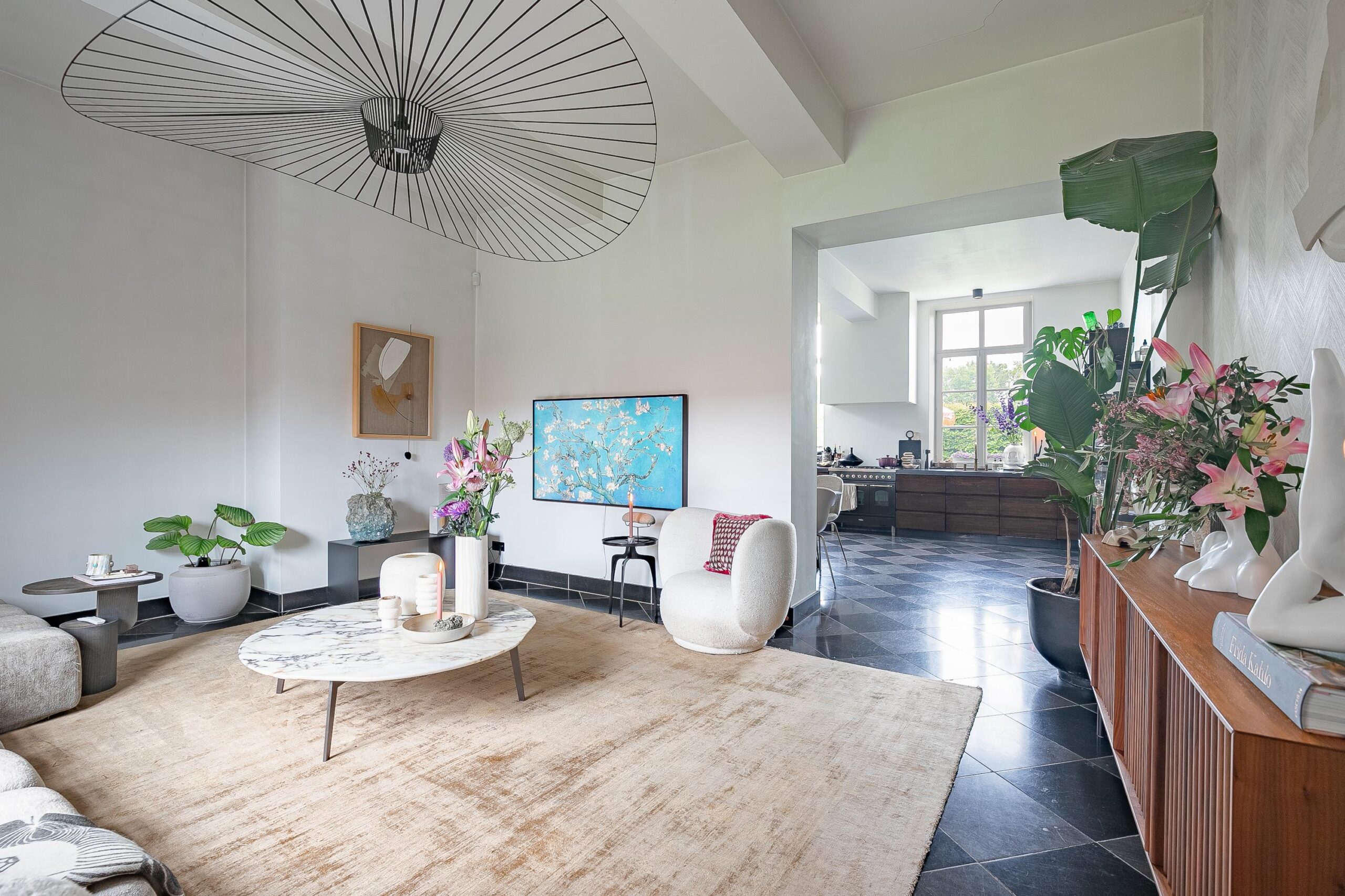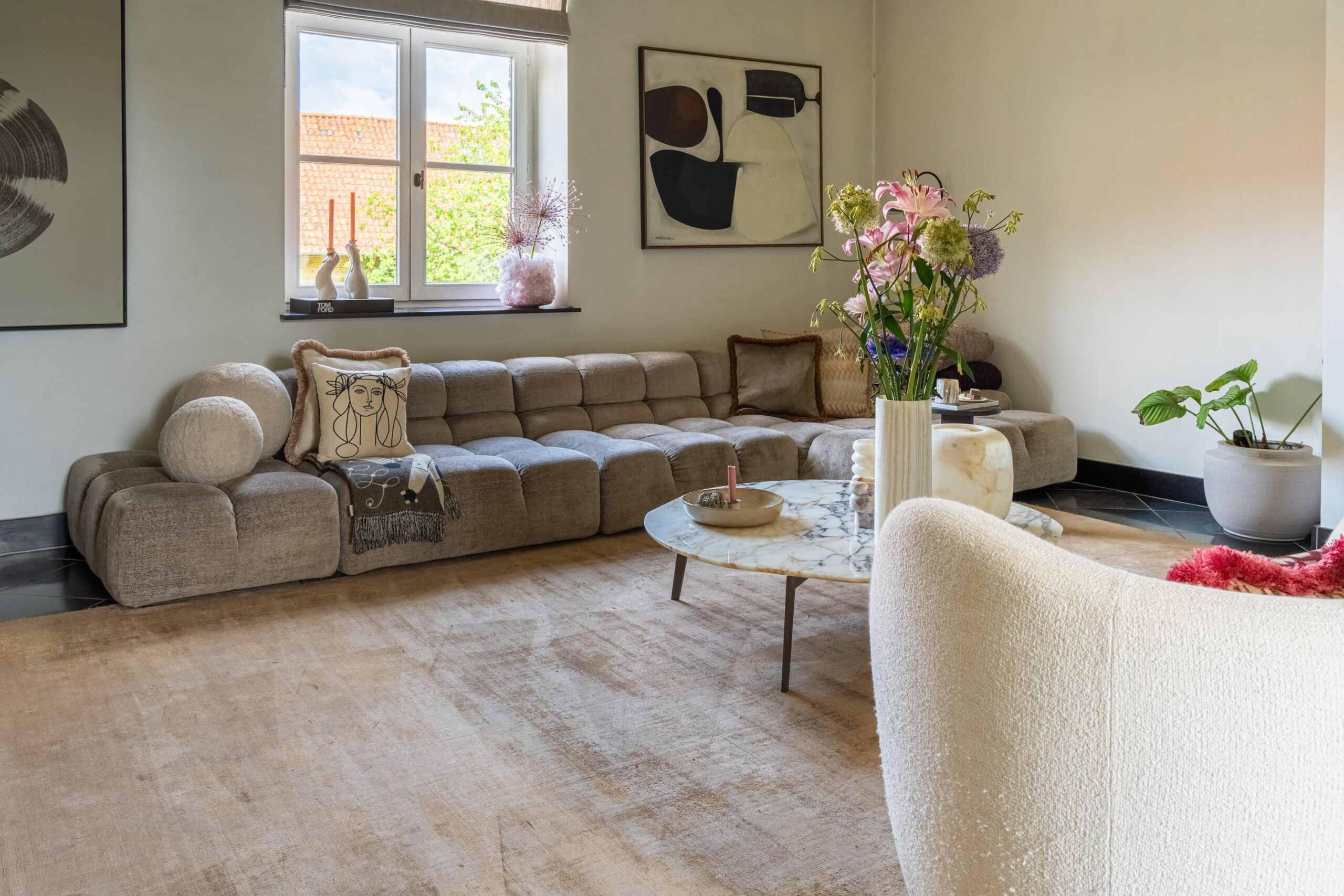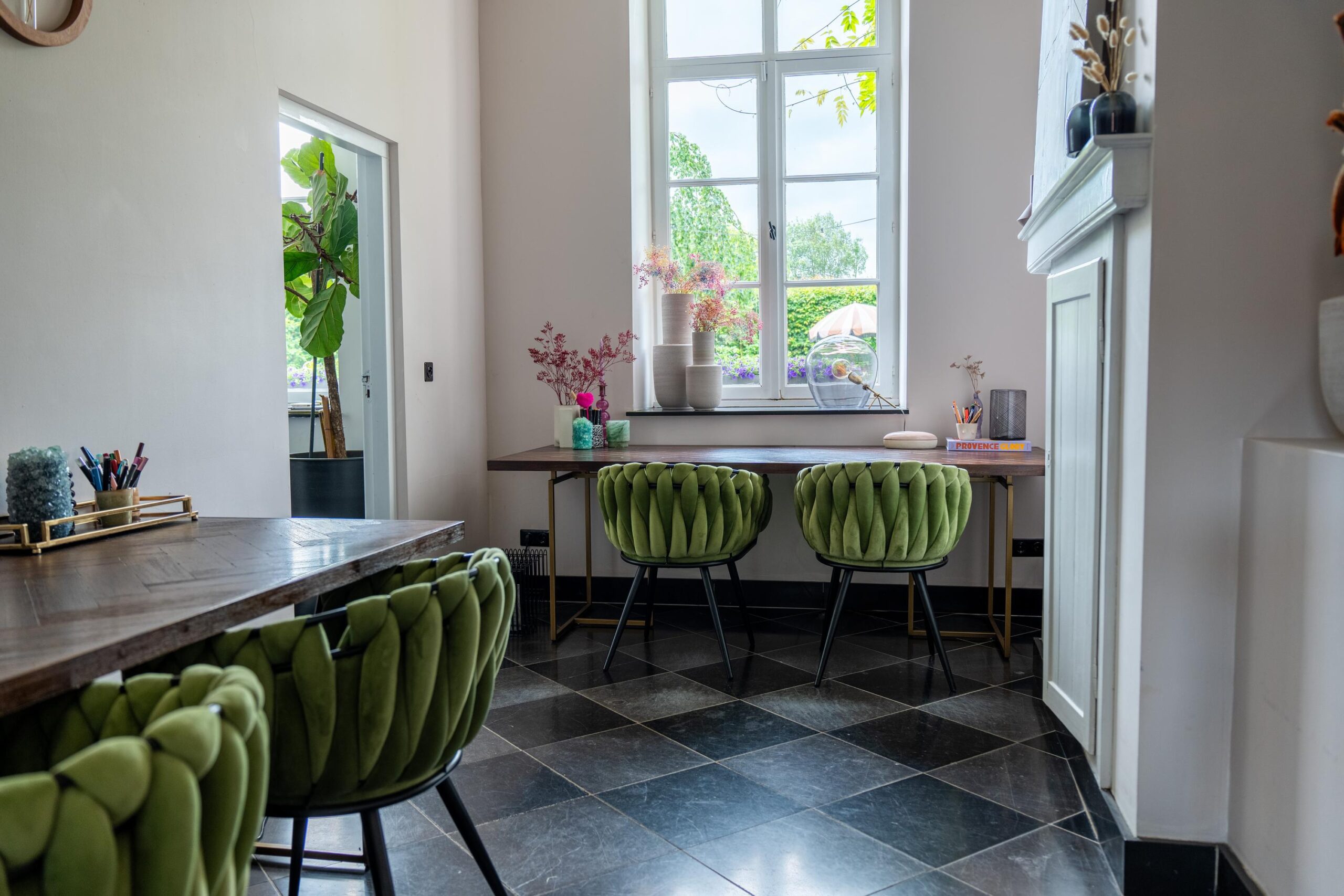 De bijzonder markante woonkamer is gesitueerd aan de achterzijde van deze carré boerderij, waardoor men een prachtig uitzicht op de binnenplaats geniet.