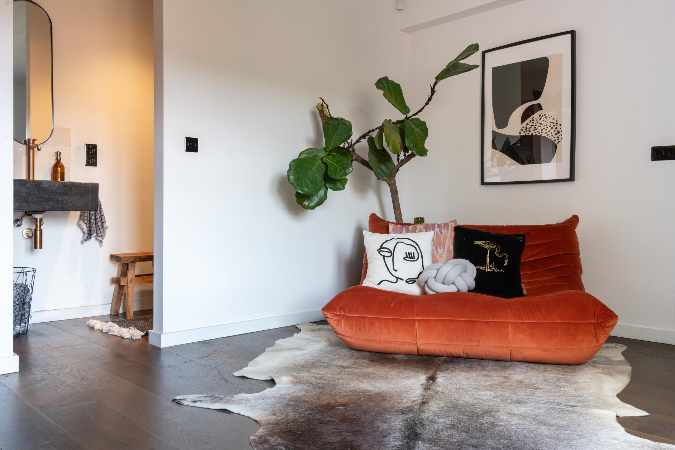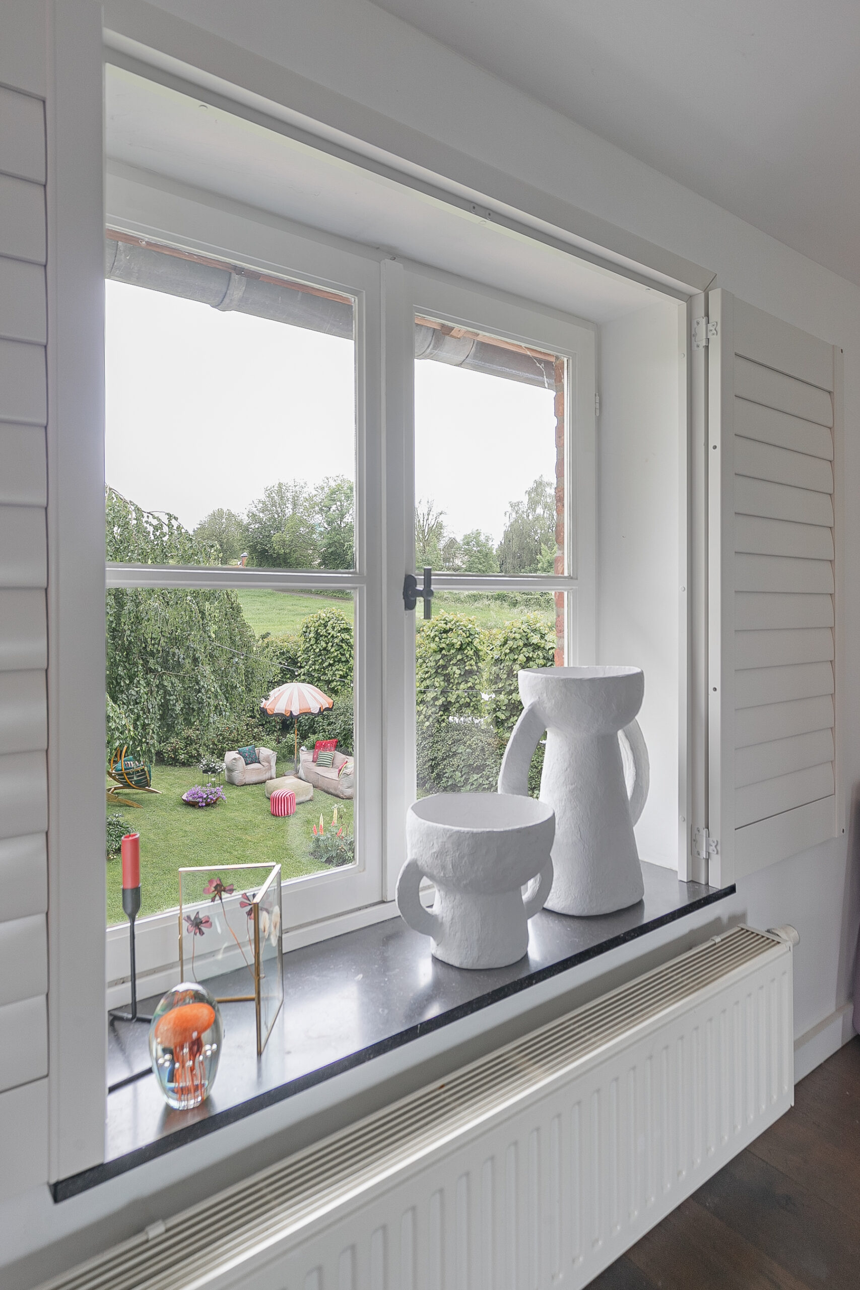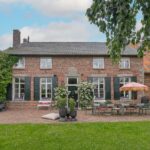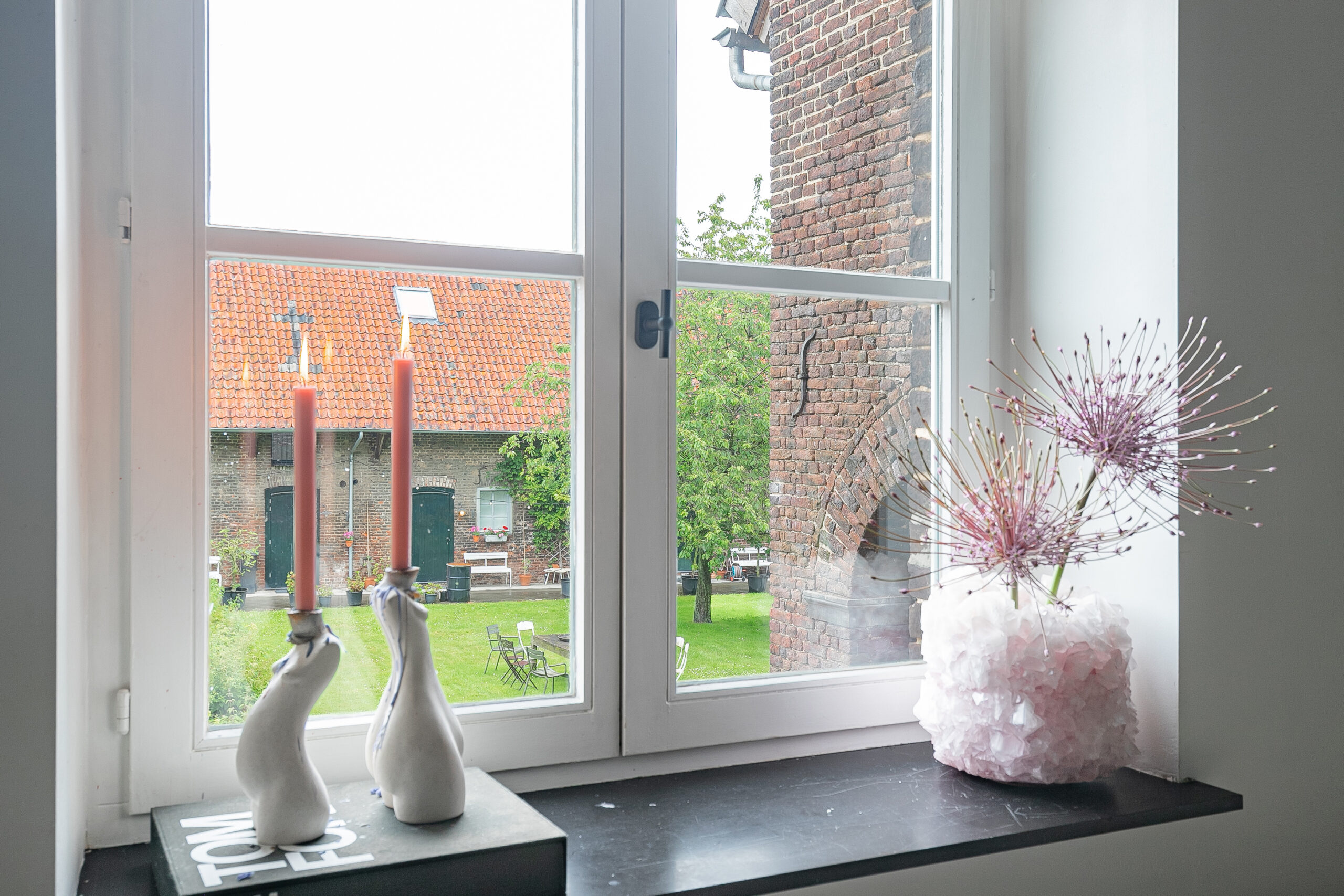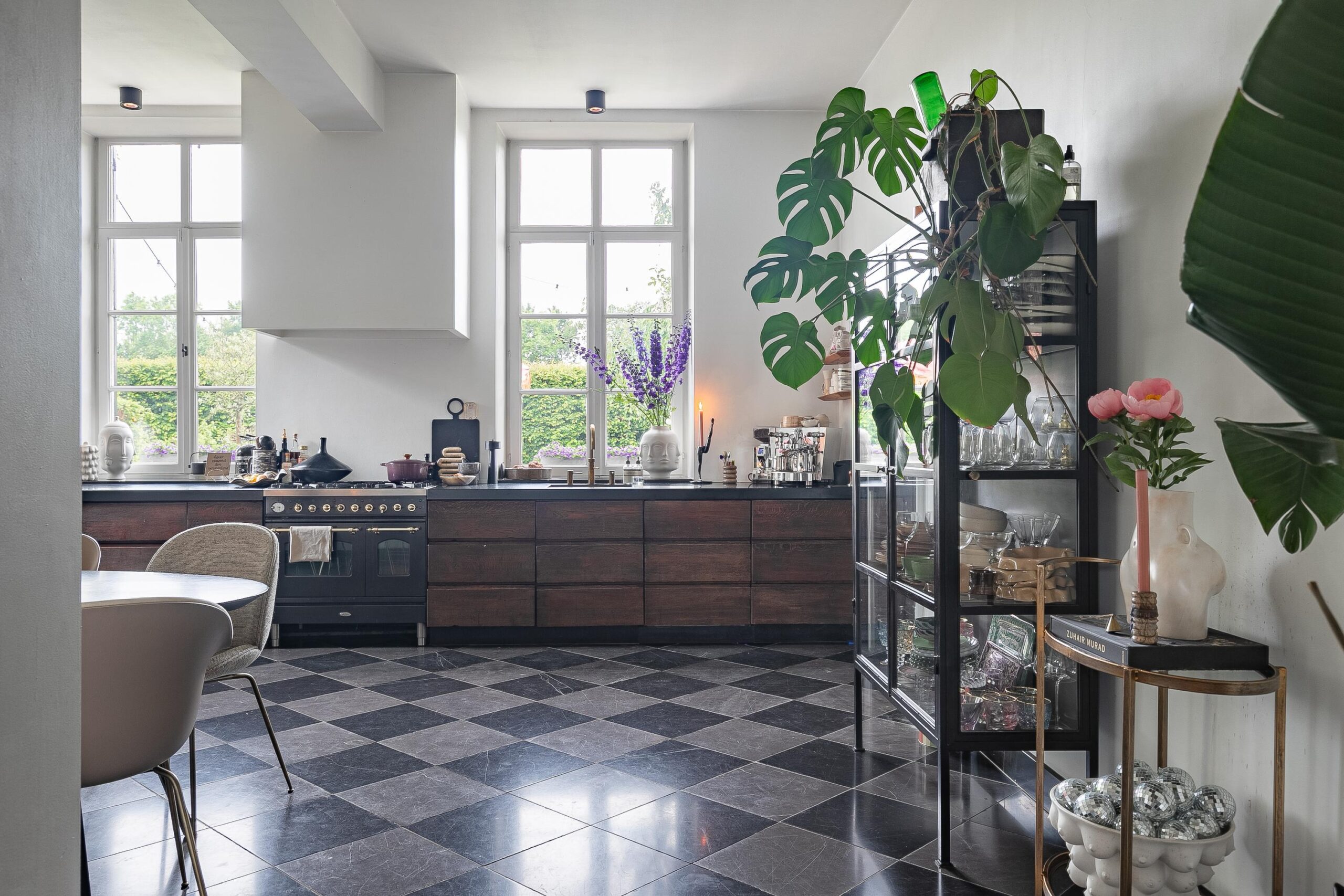 De bijzonder markante woonkamer is gesitueerd aan de achterzijde van deze carré boerderij, waardoor men een prachtig uitzicht op de binnenplaats geniet.