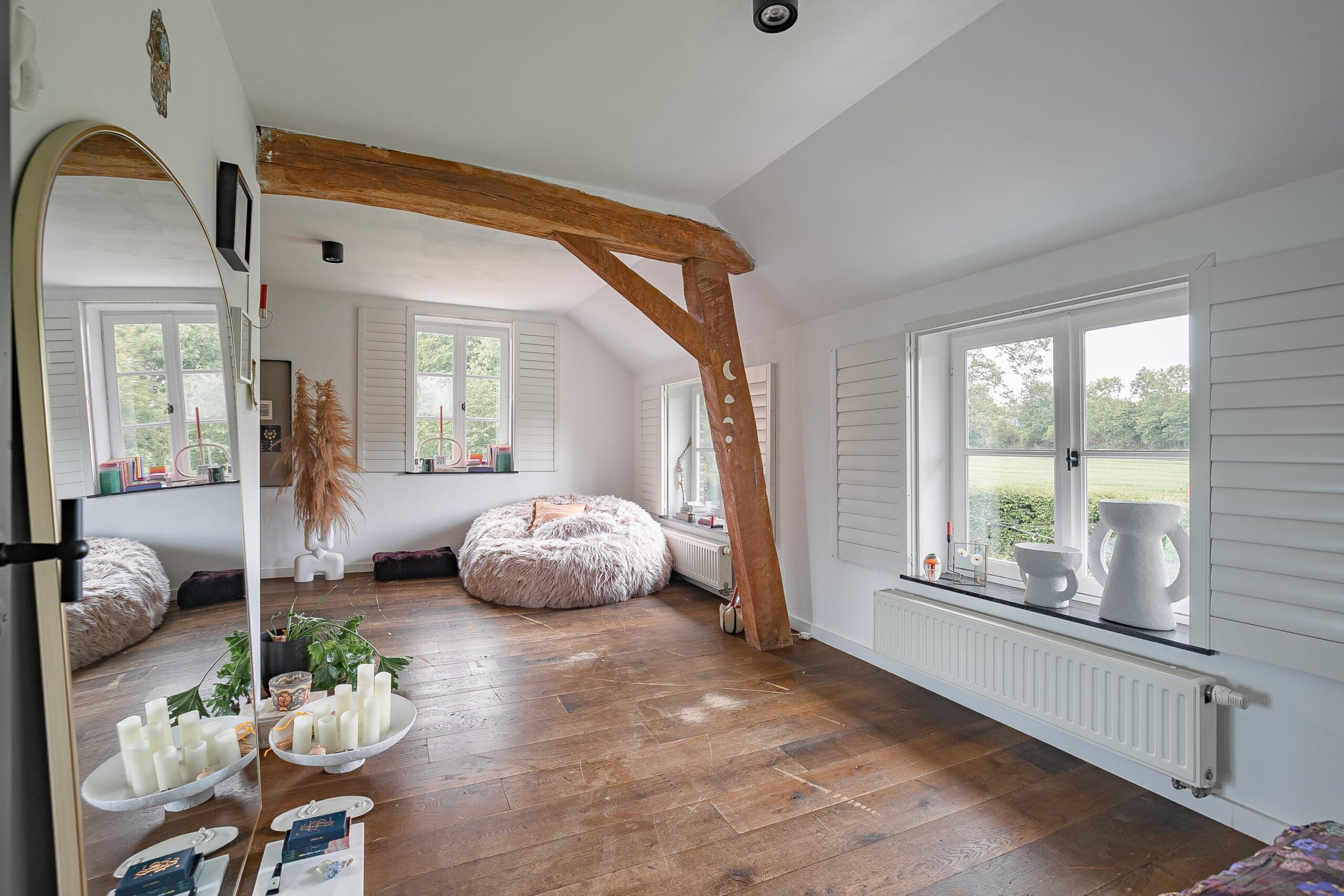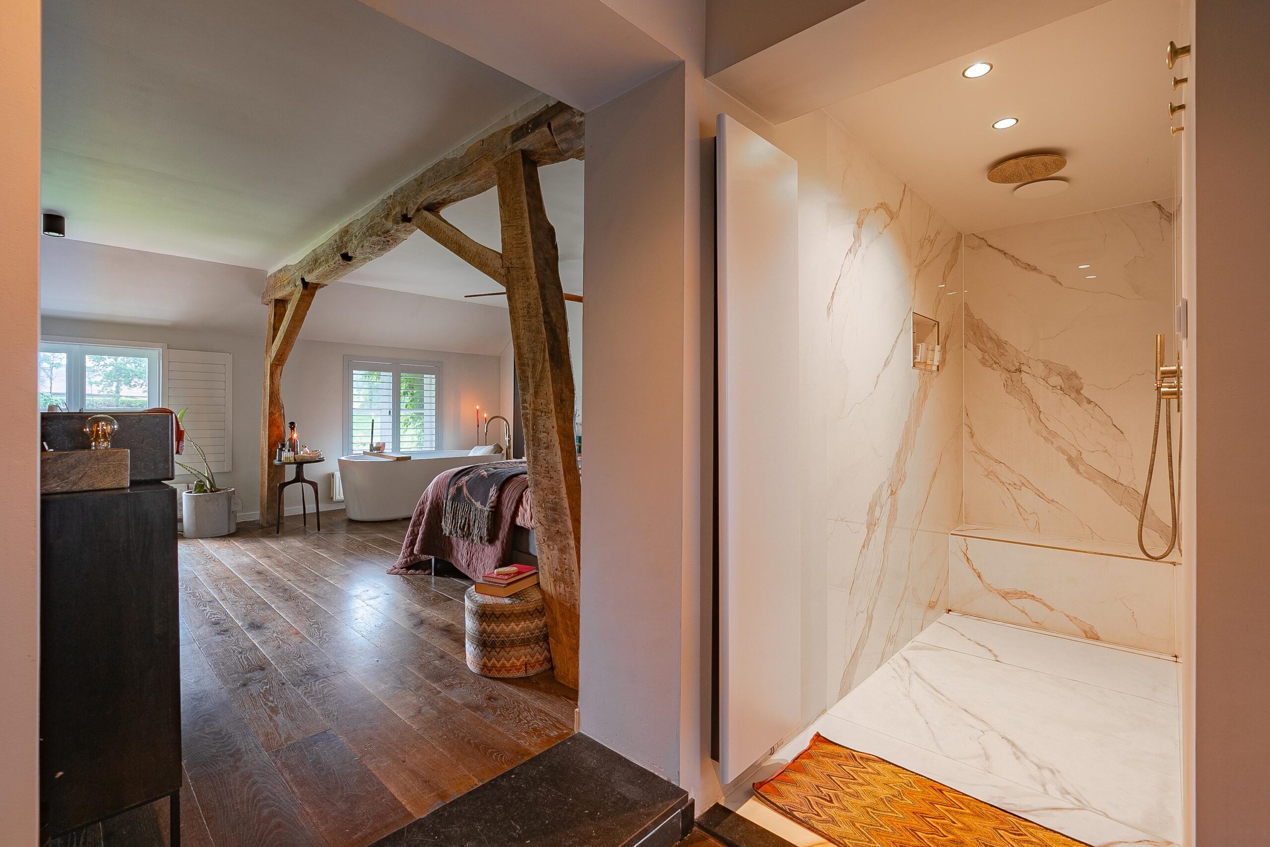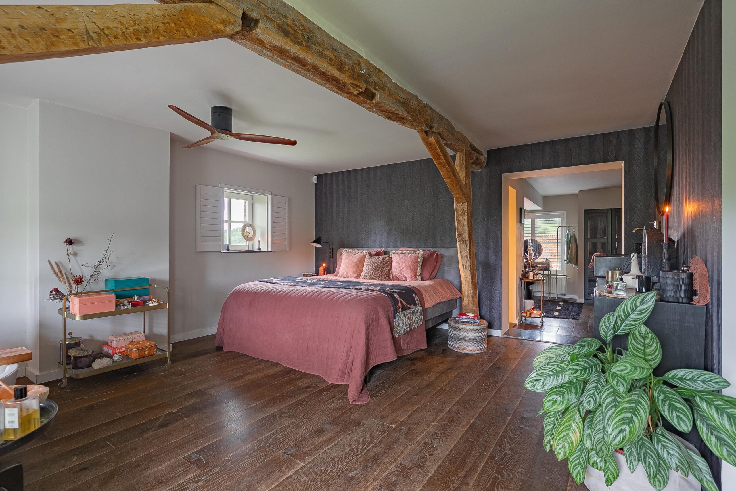Tweede sfeervolle slaapkamer 26 m2 (gastenkamer) eveneens met een antieke planken vloer en gepende balken en uitgevoerd met een luxe badkamer voorzien van een douche, wastafel en toilet groot ca. 26 m²
